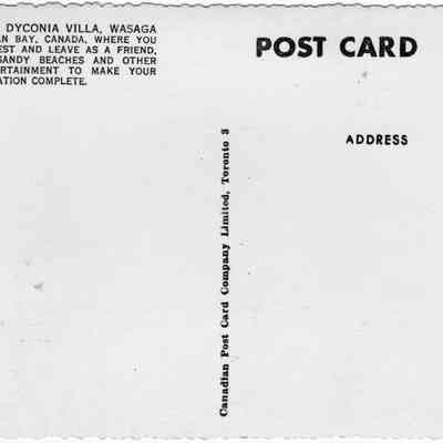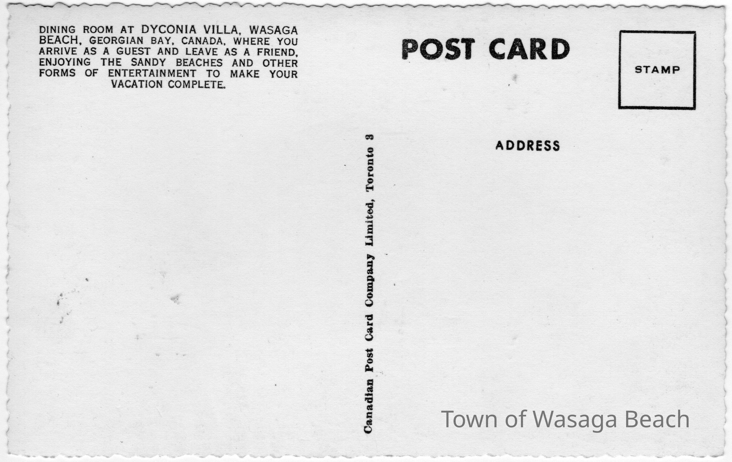 The Dyconia Villa was built and opened as a summer lodge by Mary Dyce (also known as Ma Dyce) in 1923. A main dining room was built in 1946. Additional rooms were also added. In 1952, the Dyconia was purchased by Mr. & Mrs. Jack Huthinson. After extensive renovations and additions, in 1963, the Dyconia became a year round hotel with two licensed bars and a dining room offering entertainment and accommodation. The Dyconia opened the first swimming pool in Wasaga Beach that same year. The Dyconia became a year round resort in the late 1970's with modernized rooms, cabins and mini condos added. The Dyconia was sold in 2008. The Dyconia was located at 381 Mosley Street along the Nottawasaga River. The location continues to offer accommodation.Acquisition