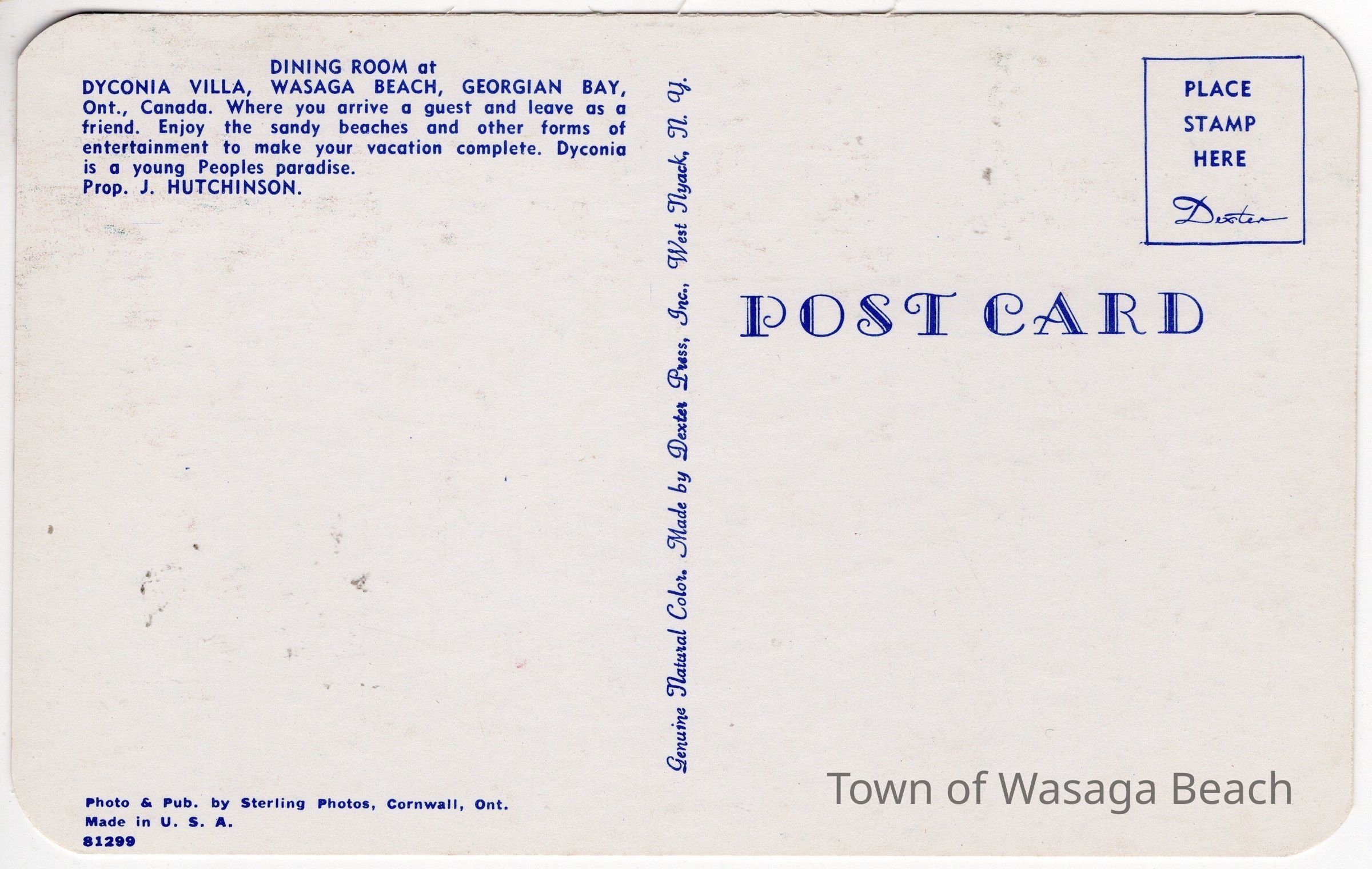 The Dyconia Villa was built and opened as a summer lodge by Mary Dyce (also known as Ma Dyce) in 1923. A main dining room was built in 1946. Additional rooms were also added. In 1952, the Dyconia was purchased by Mr. & Mrs. Jack Huthinson. After extensive renovations and additions, in 1963, the Dyconia became a year round hotel with two licensed bars and a dining room offering entertainment and accommodation. The Dyconia opened the first swimming pool in Wasaga Beach that same year. The Dyconia became a year round resort in the late 1970's with modernized rooms, cabins and mini condos added. The Dyconia was sold in 2008. The Dyconia was located at 381 Mosley Street along the Nottawasaga River. The location continues to offer accommodation.Acquisition