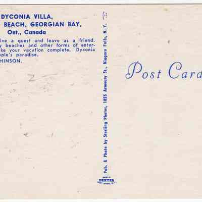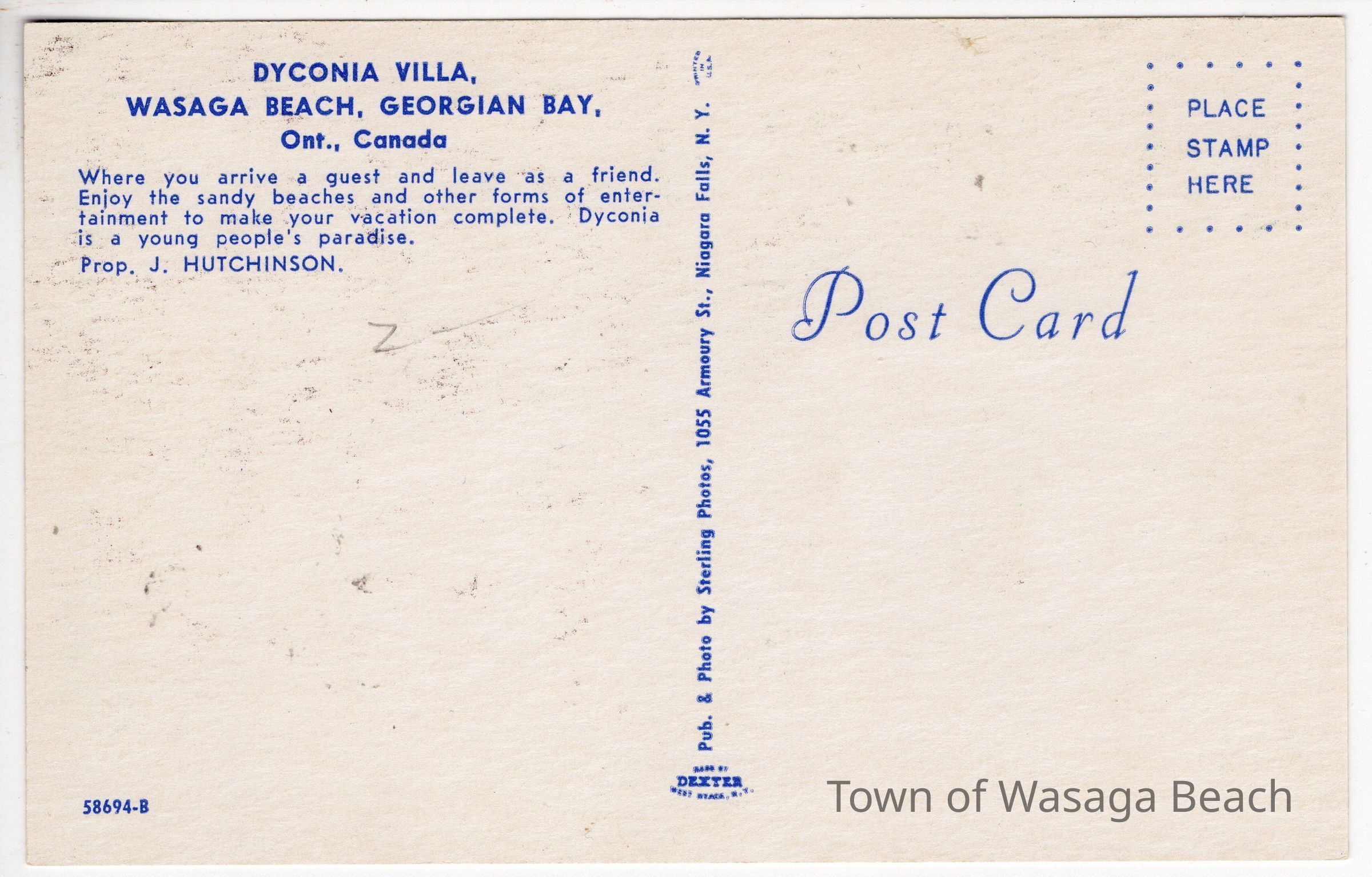 The Dyconia Villa was built and opened as a summer lodge by Mary Dyce (also known as Ma Dyce) in 1923. A main dining room was built in 1946. Additional rooms were also added. In 1952, the Dyconia was purchased by Mr. & Mrs. Jack Huthinson. After extensive renovations and additions, in 1963, the Dyconia became a year round hotel with two licensed bars and a dining room offering entertainment and accommodation. The Dyconia opened the first swimming pool in Wasaga Beach that same year. The Dyconia became a year round resort in the late 1970's with modernized rooms, cabins and mini condos added. The Dyconia was sold in 2008. The Dyconia was located at 381 Mosley Street along the Nottawasaga River. The location continues to offer accommodation.Acquisition
