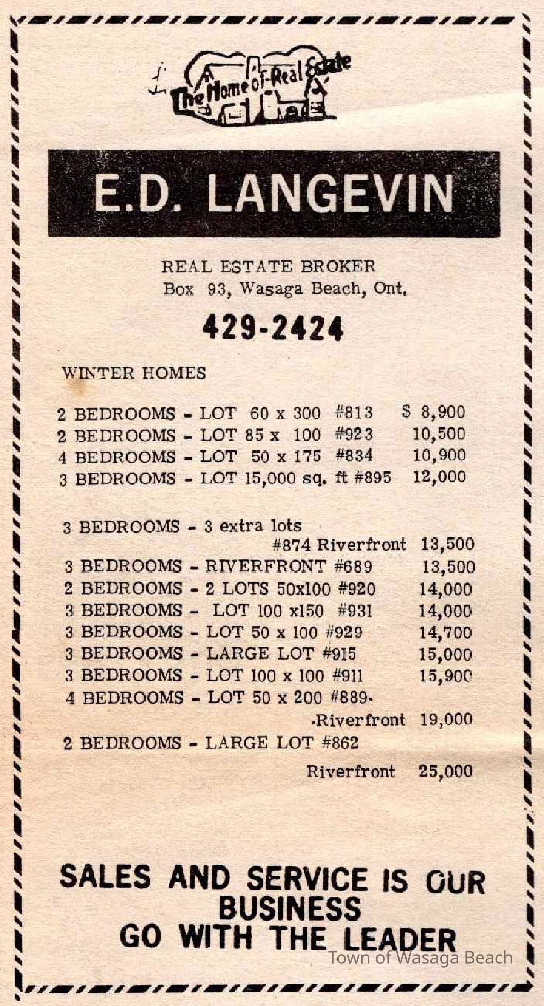 E.D. Langevin newspaper ad from the Collingwood Herald, October 1968 listing "Winter Homes" for sale with prices for two and three bedroom homes varying between $8,900 and $25,000.Acquisition