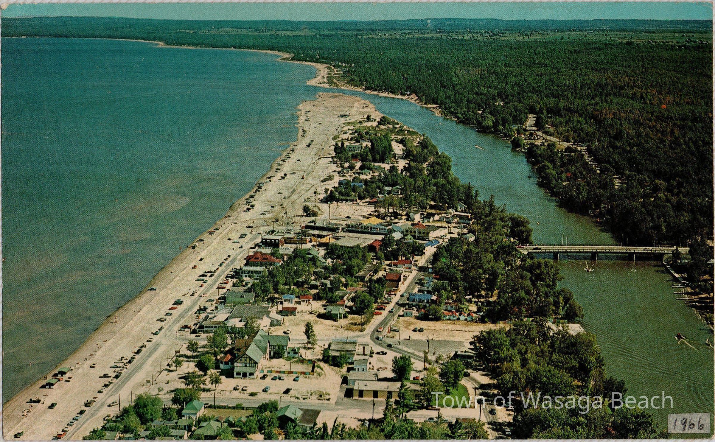Color photo east towards the mouth of the riverand eastward along the shoreline, labelled 1966. Beach Drive is paved with cars parked on the side of the street and along the beachfront. Buildings close to the water on the beach are washrooms.Acquisition