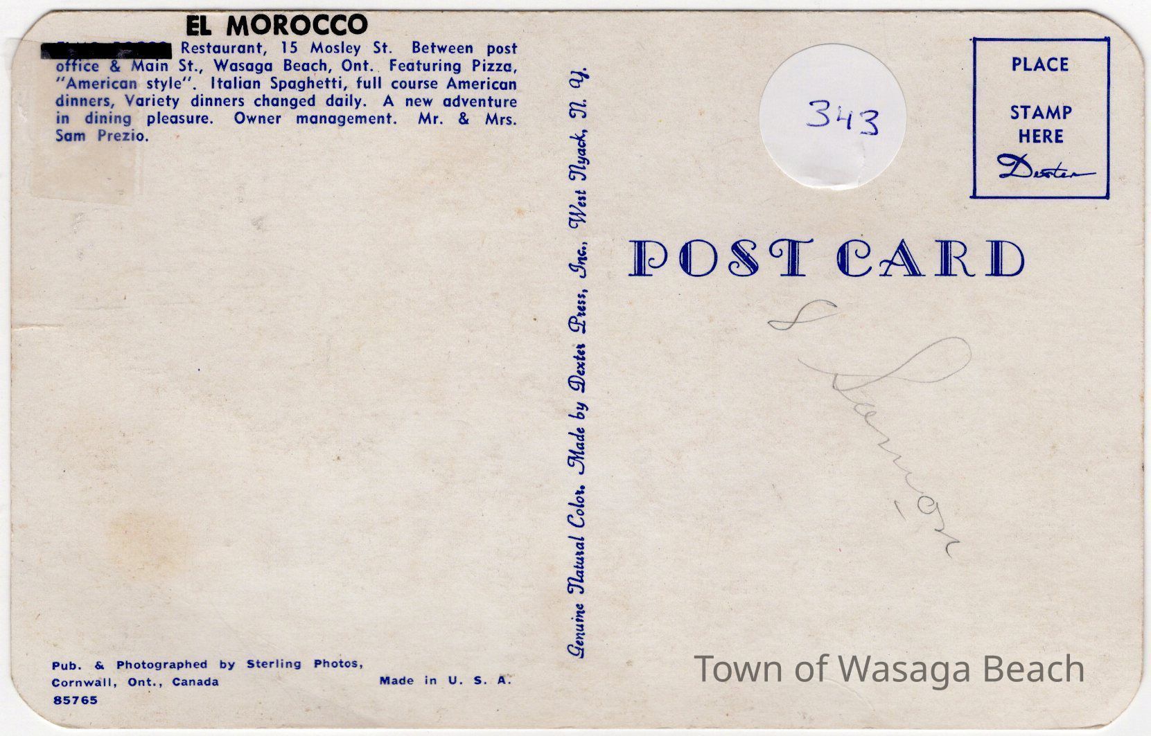From the back of the post card: "El Morocco Restaurant, 15 Mosley St. Between post office & Main St., Wasaga Beach, Ont. Featuring Pizza, "American style". Italian Spaghetti, full course American dinners, Variety dinners changed daily. A new adventure in dining pleasure. Owner management. Mr. & Mrs. Sam Prezio"Acquisition