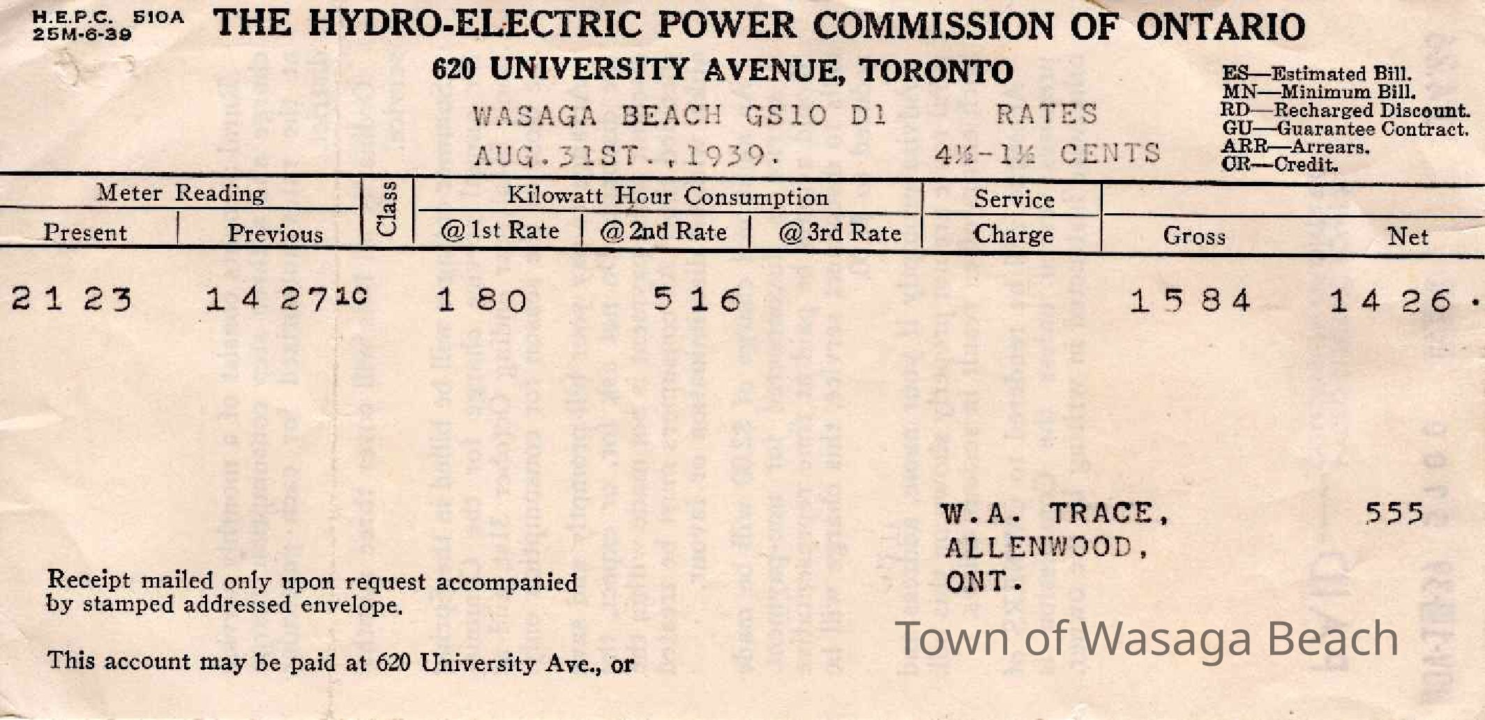 Copy of Electric Bill dated August 31, 1939 - addressed to W.A. Trace, Allenwood, Ontario