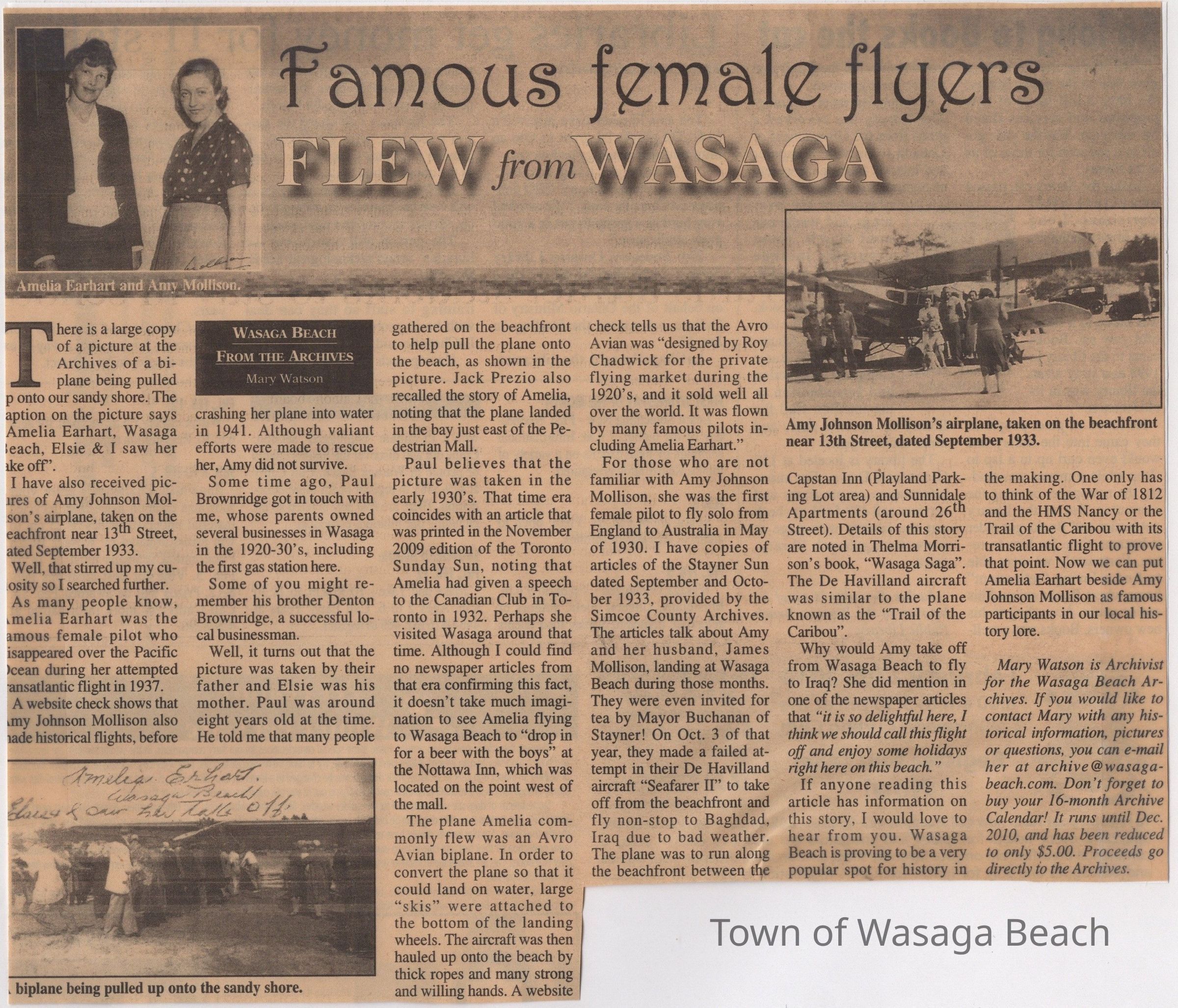 In the article, Mary Watson writes about famous pilots, Amy Johnson Mollison and Amelia Earhart, and their association with Wasaga Beach.