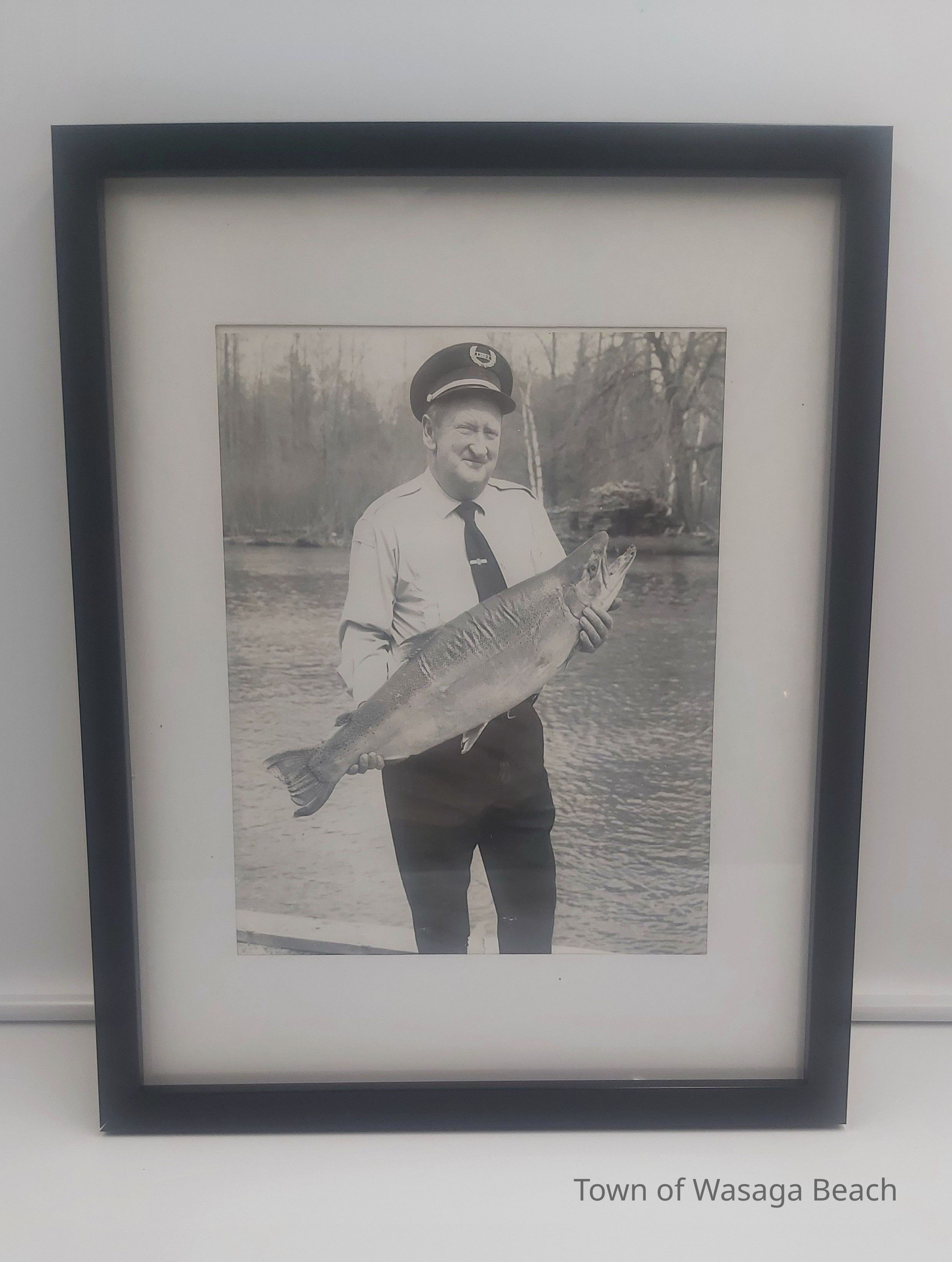 Framed photo of Fire Chief Russell Kenwell holding the world record rainbow trout caught in the Nottawasaga River, 1975Context