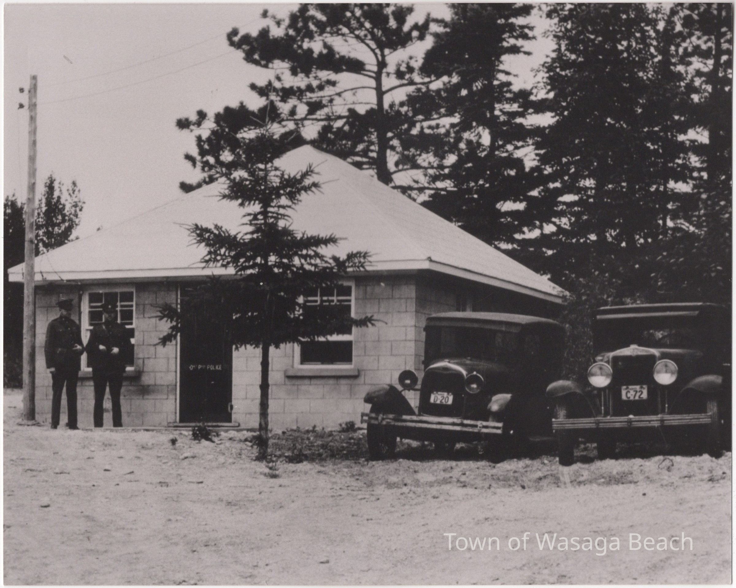 The photo shows the first OPP Station at Wasaga Beach, circa 1930's. The station was a small cement block building located approximately at the intersection of 1st Street and Mosley Street, across from Pedro's. In the photo, two officers are standing in front of the building with two vintage vehicles parked beside the building. "ONT. PROV. POLICE" is visible on the door.