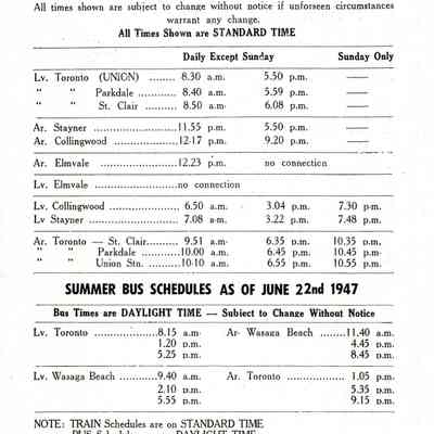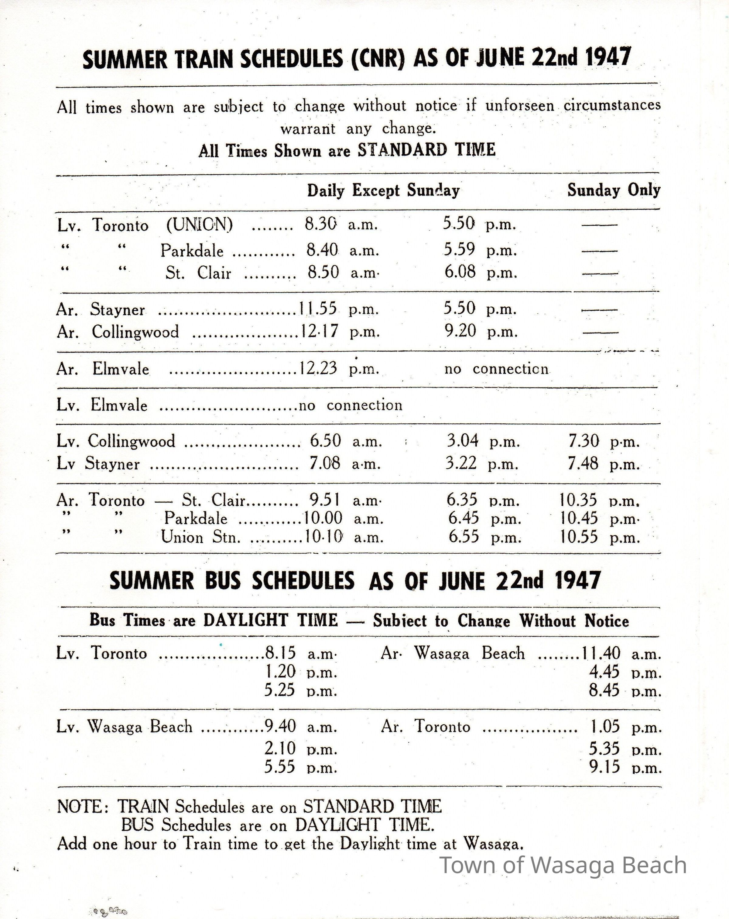 The document is a copy of a daily summer train (Canadian National Railway) schedule from Toronto to Stayner and Collingwood and return. Trains ran daily except Sunday. Elmvale is also listed on the schedule noting "no connection". The daily summer bus schedule is also listed from Toronto to Wasaga Beach and return.