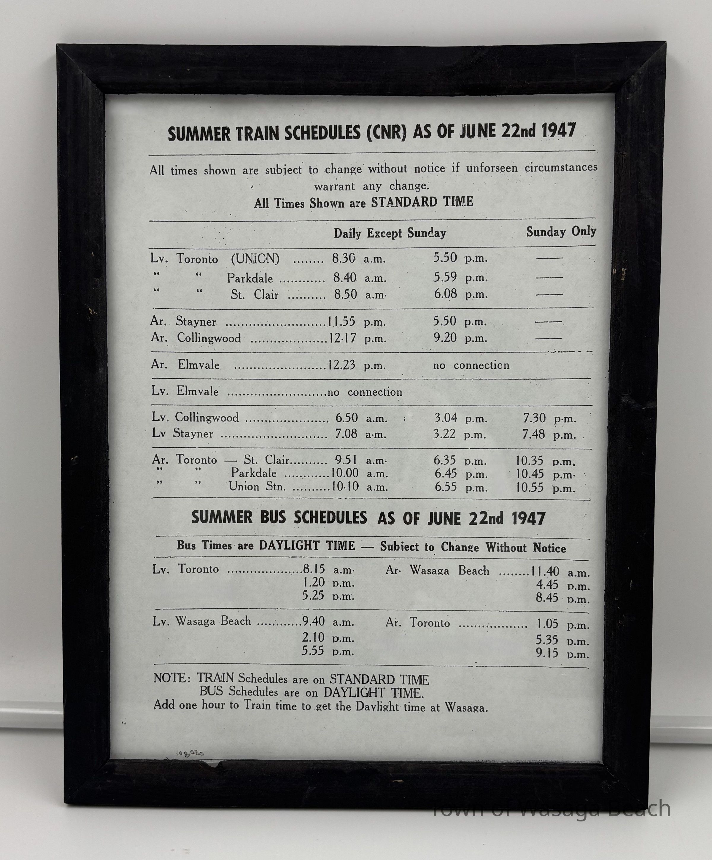 Framed Copy, Summer Train (CNR) and Bus Schedule, 1947Entry/Object ID
