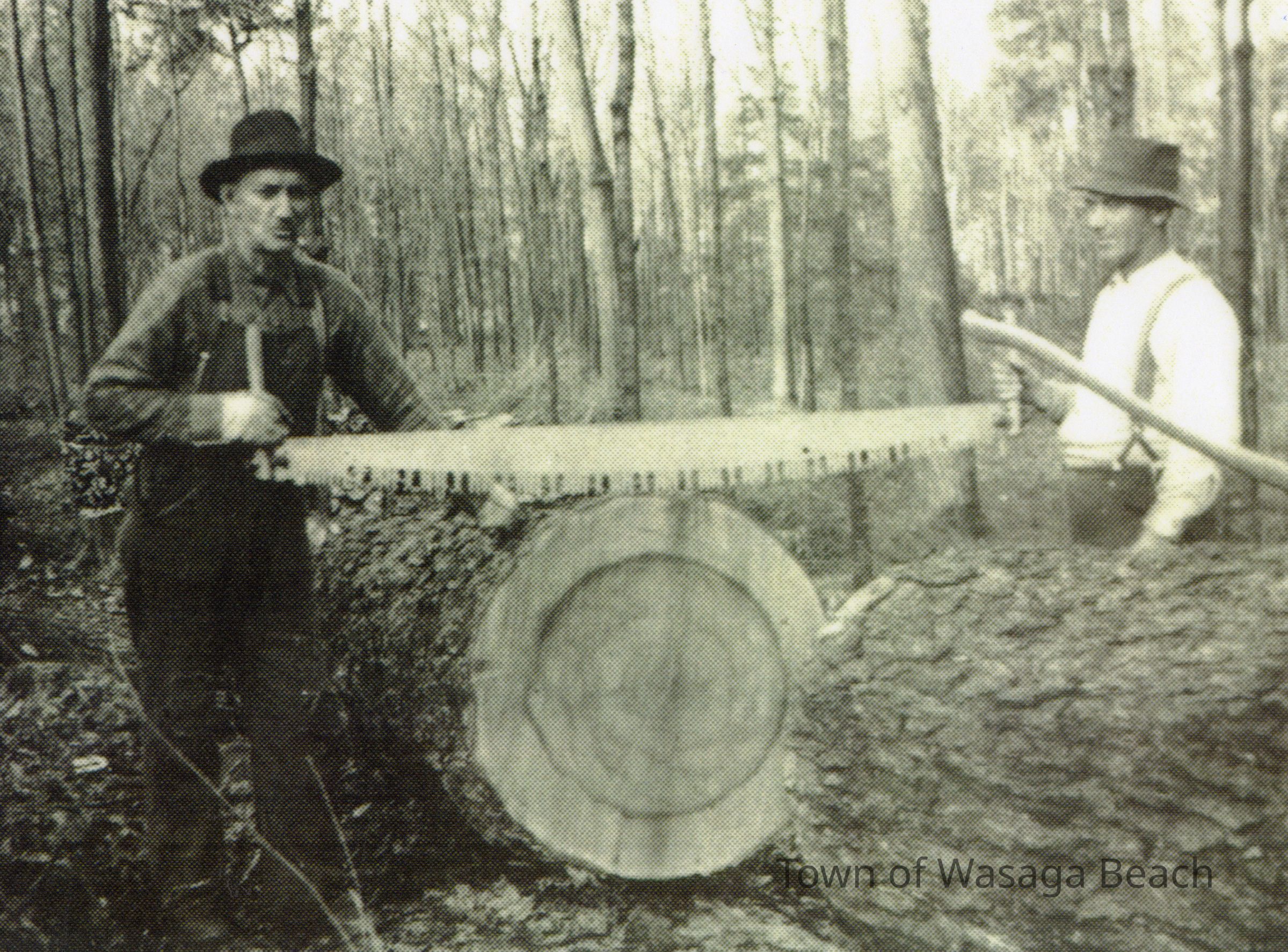 A photograph of two men using a cross-cut saw to cut a large tree in the 1940's. A note attached to the back of the picture frame reads: "Nottawasaga Township (not verified)".Acquisition