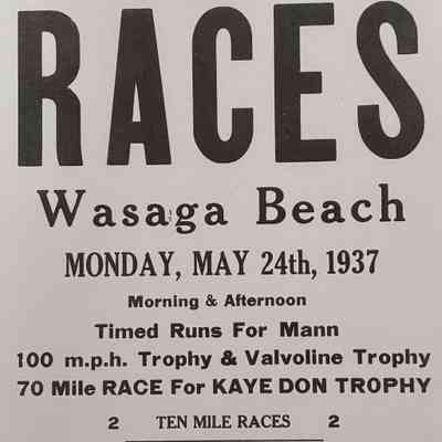 During the 1930’s the beachfront at Wasaga Beach was used for motorcycle races. Racers in Europe & US had been using sand beaches for motorcycle races and the British Empire Motorcycle Club found Wasaga Beach to be a perfect Canadian destination for races. The first race was held on the beachfront on October 24, 1935 starting with ¼ mile sprints. A planned 100 mile race was shortened to 60 miles due to inclement weather. 2000 spectators were in attendance. The next year, to avoid adverse weather conditions, the races were moved from Thanksgiving to Victoria Day weekend. Spectators in attendance increased to 10,000 by 1937. The courses ran from the east end of Beach Area 1 west to about 13th street. Bales of hay and snow fence were used to protect the crowds. The Wasaga Beach races were the biggest events in Canada at the time and drew top American riders. The races continued to run on the beach, with some gaps due to participants’ involvement in WWII, until 1949 when new safety regulations coupled with the cost of liability insurance brought an end to motorcycle racing on the beach. Motorcycle races were then held where Edenvale Airport is now located.