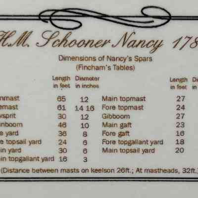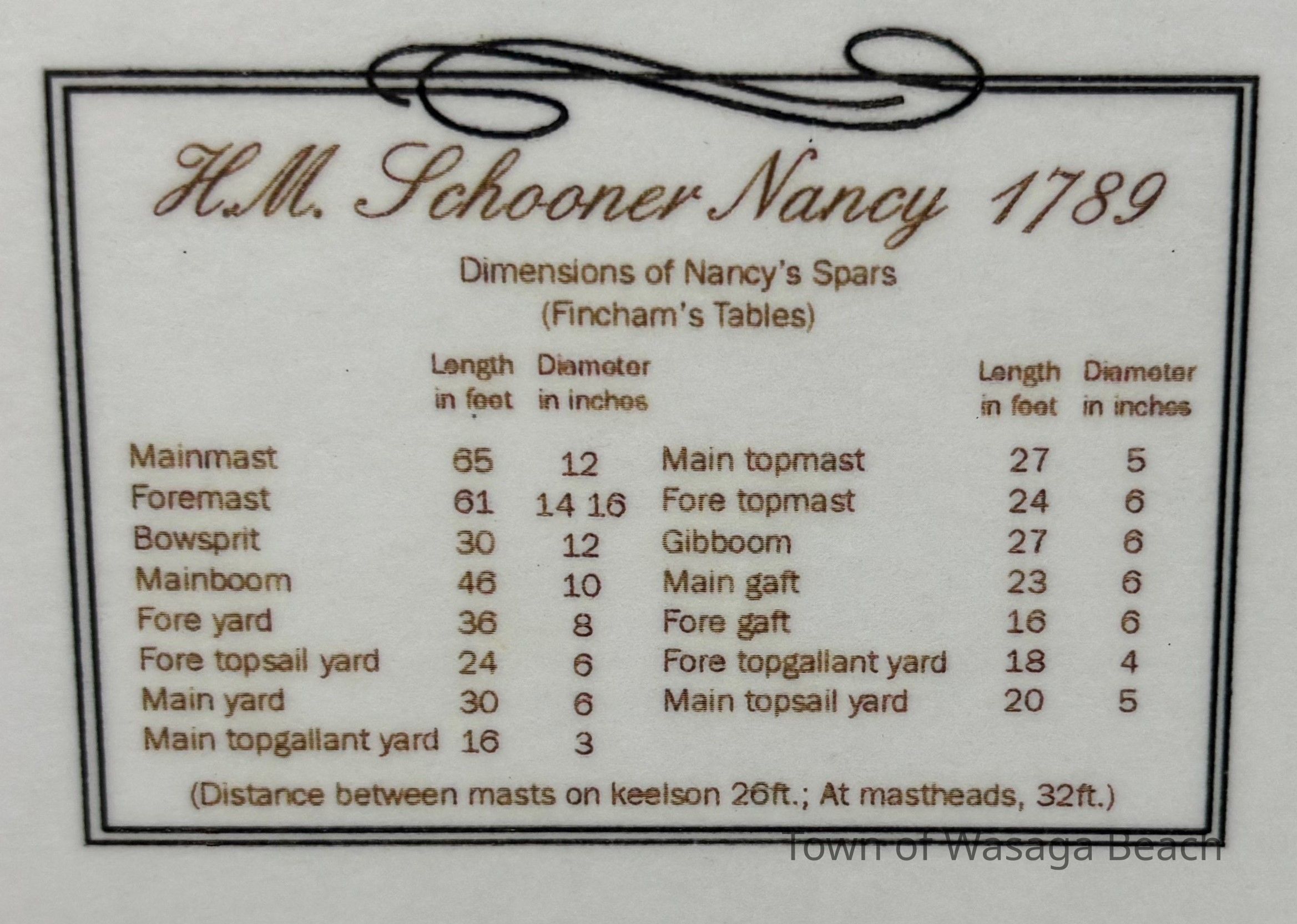 The image of the HMS Nancy by Nancy McGarvey includes a detailed picture of the ship's sails. Included to the left of the image of the ship are details of the "Dimensions of Nancy's Spars", 1789. Spars are an essential part of a sailing vessels rigging acting as poles to support and control sails.
