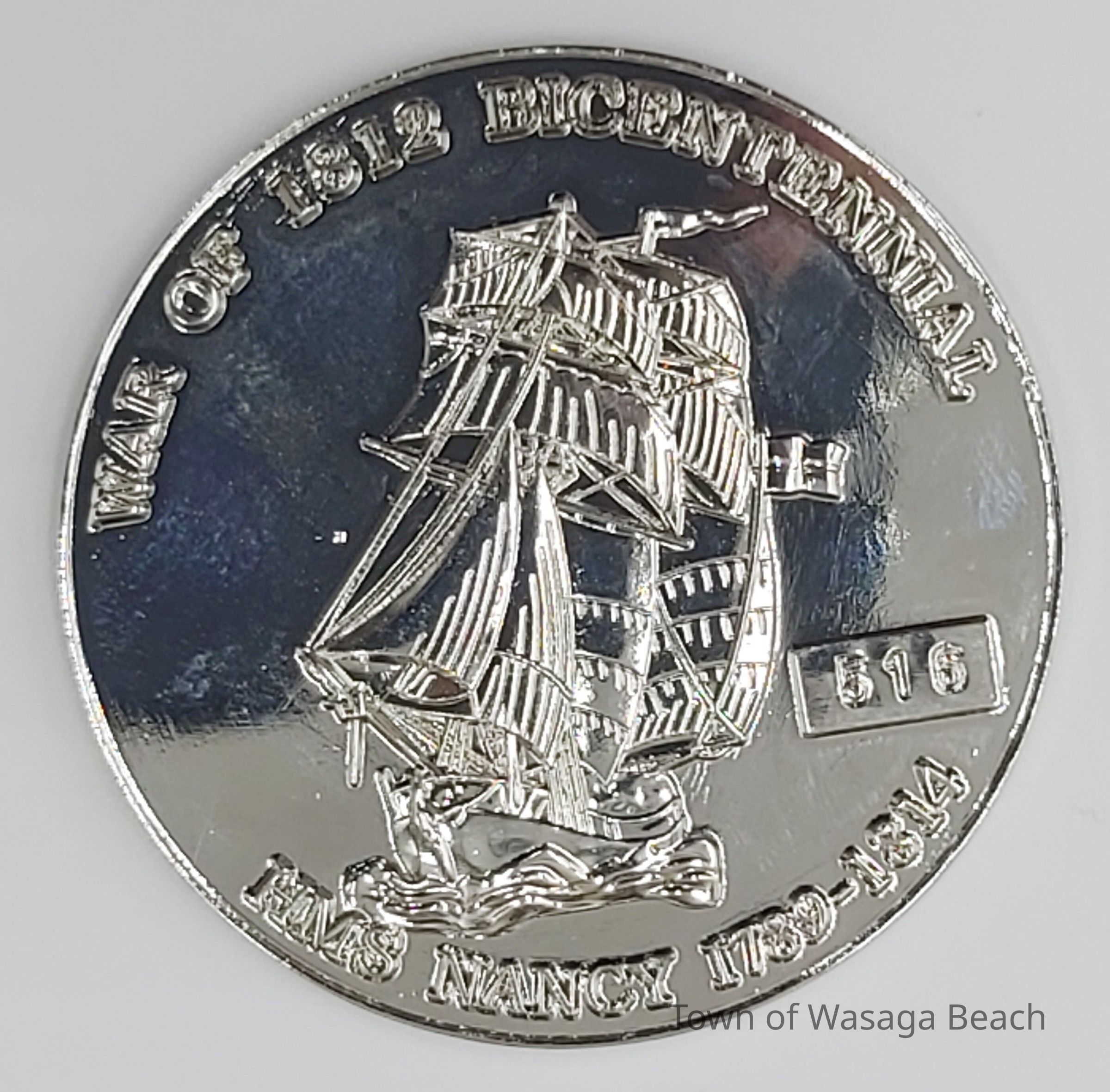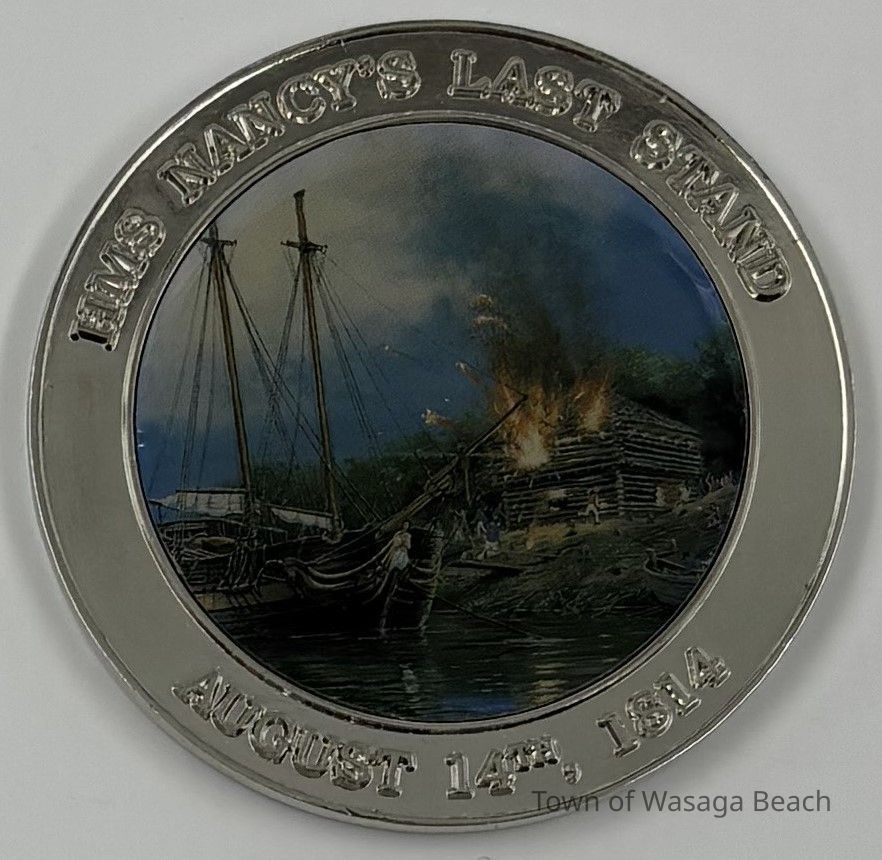 HMS Nancy's Last Stand Coin#516 - 2" Diameter Silver with front colour picture burning blockhouse & ship, August 14th, 1814Acquisition