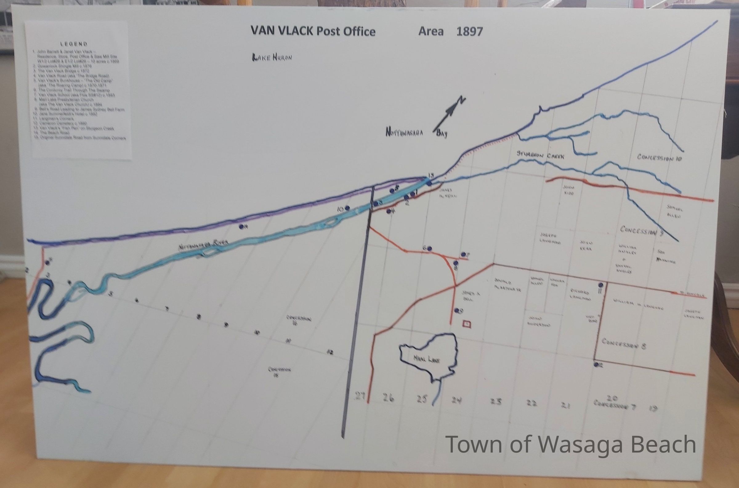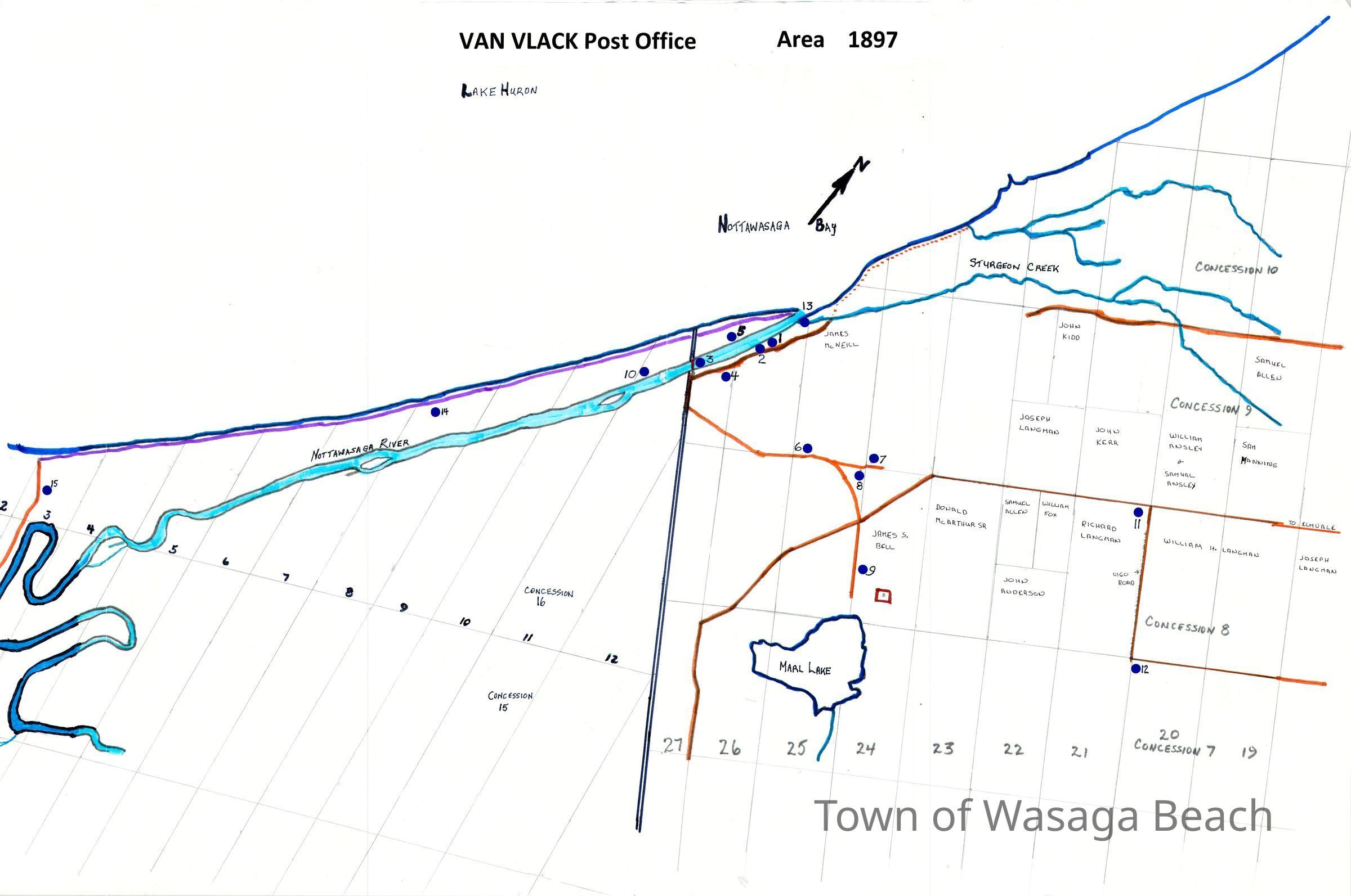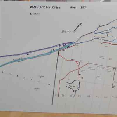 Hand drawn map of Van Vlack Post Office area, researched and drawn by Archives volunteers Karen Bowles and Terry Olaskey.Acquisition