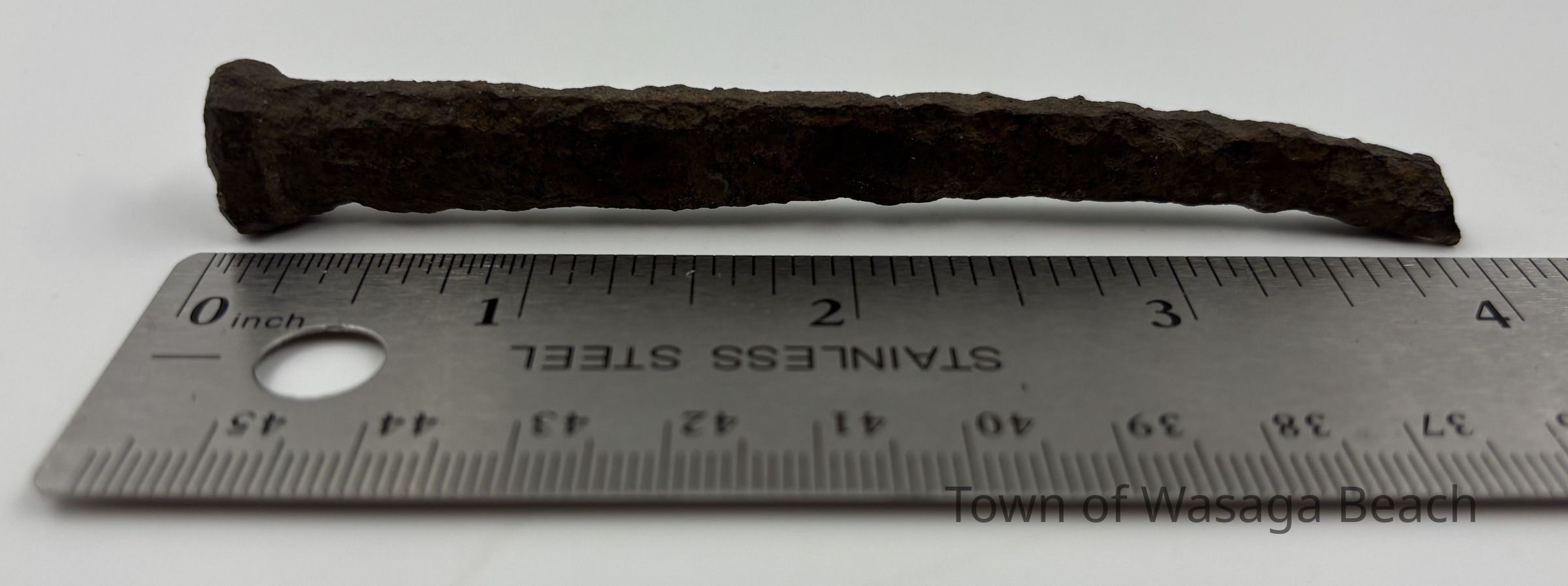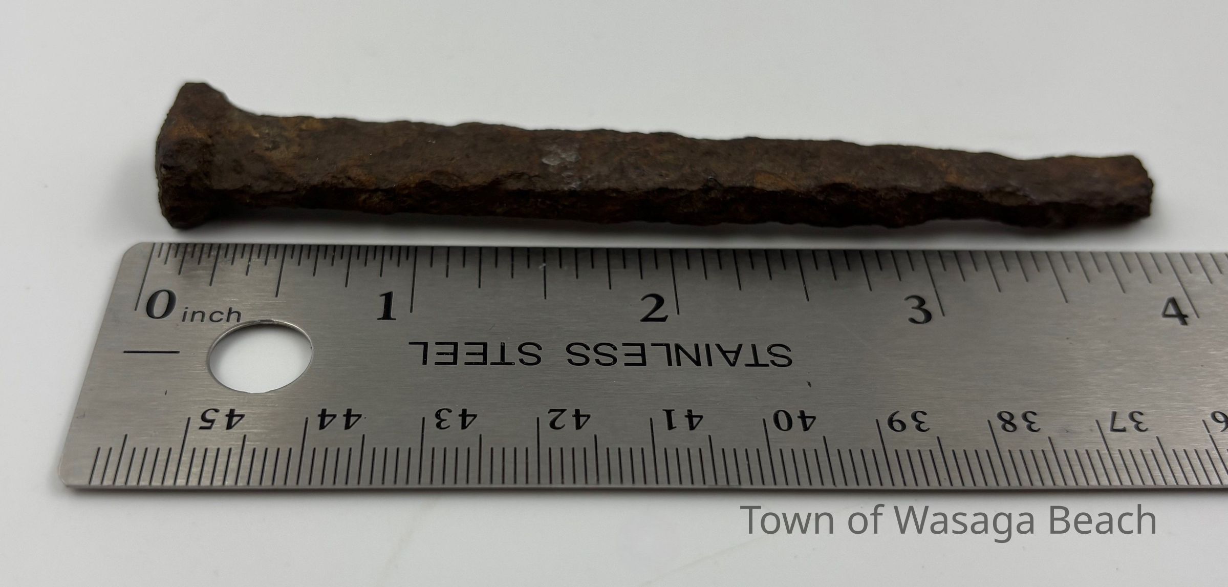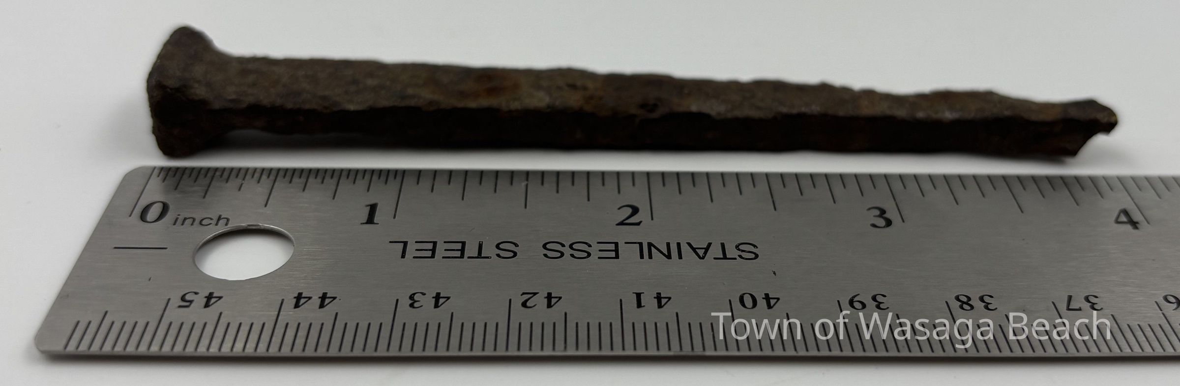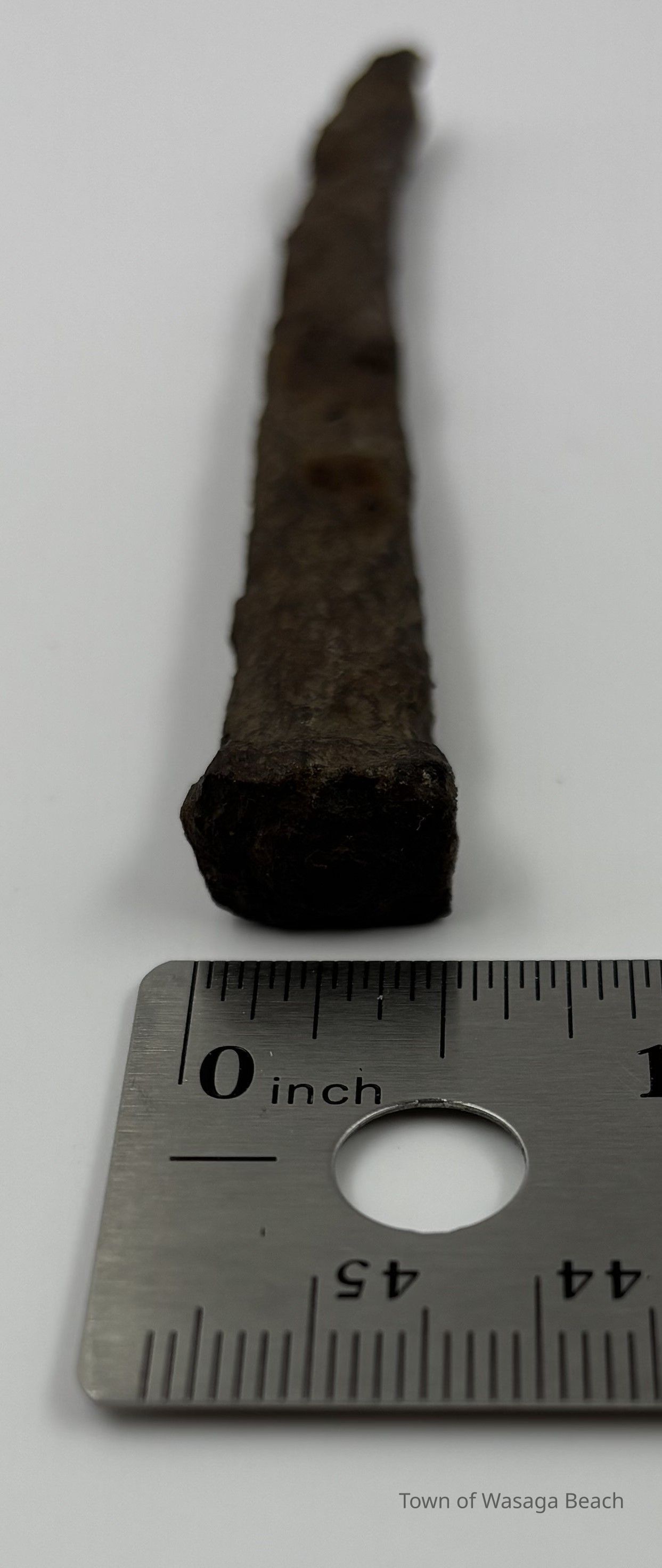 Hand wrought rectangular nail, circa 1800-1890, found at Beach Area 5, Wasaga Beach, OntarioContext