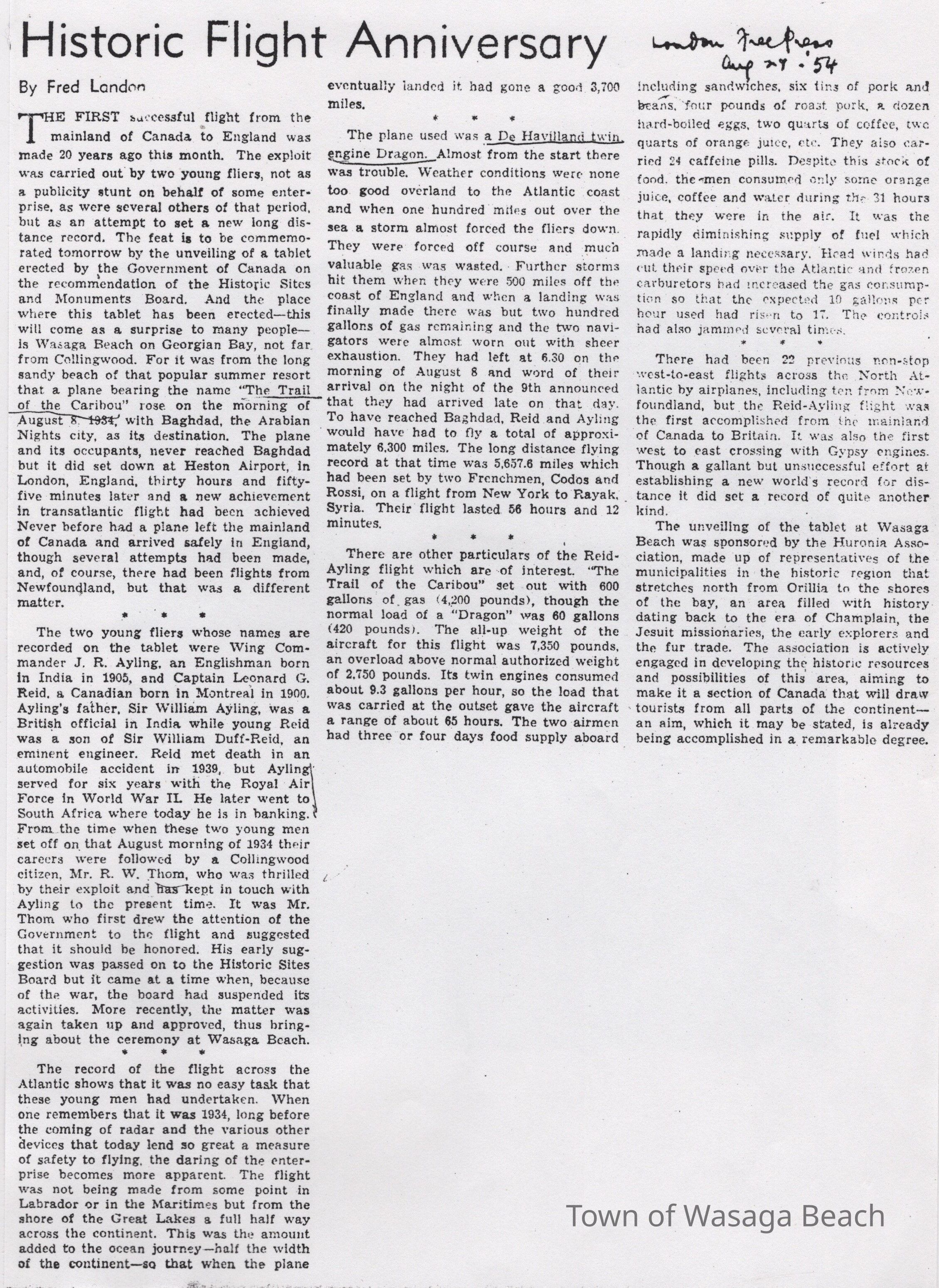 The article was written by Fred London for the London Free Press, commemorating the 20th Anniversary of the first non-stop flight from Canada to Great Britain in the "Trail of the Caribou", flown by Wing Commander James R. Ayling and Captain Leonard G. Reid on August 8, 1934. The article chronicles the trip from Wasaga Beach to Great Britain and includes historical details about the flight, the plane and the pilots. The article also provides information about the history of flight, the Huronia Association and the process that resulted in the placement of the Ayling & Reid Cairn at the Historic Nancy Island Site, Wasaga BeachAcquisition