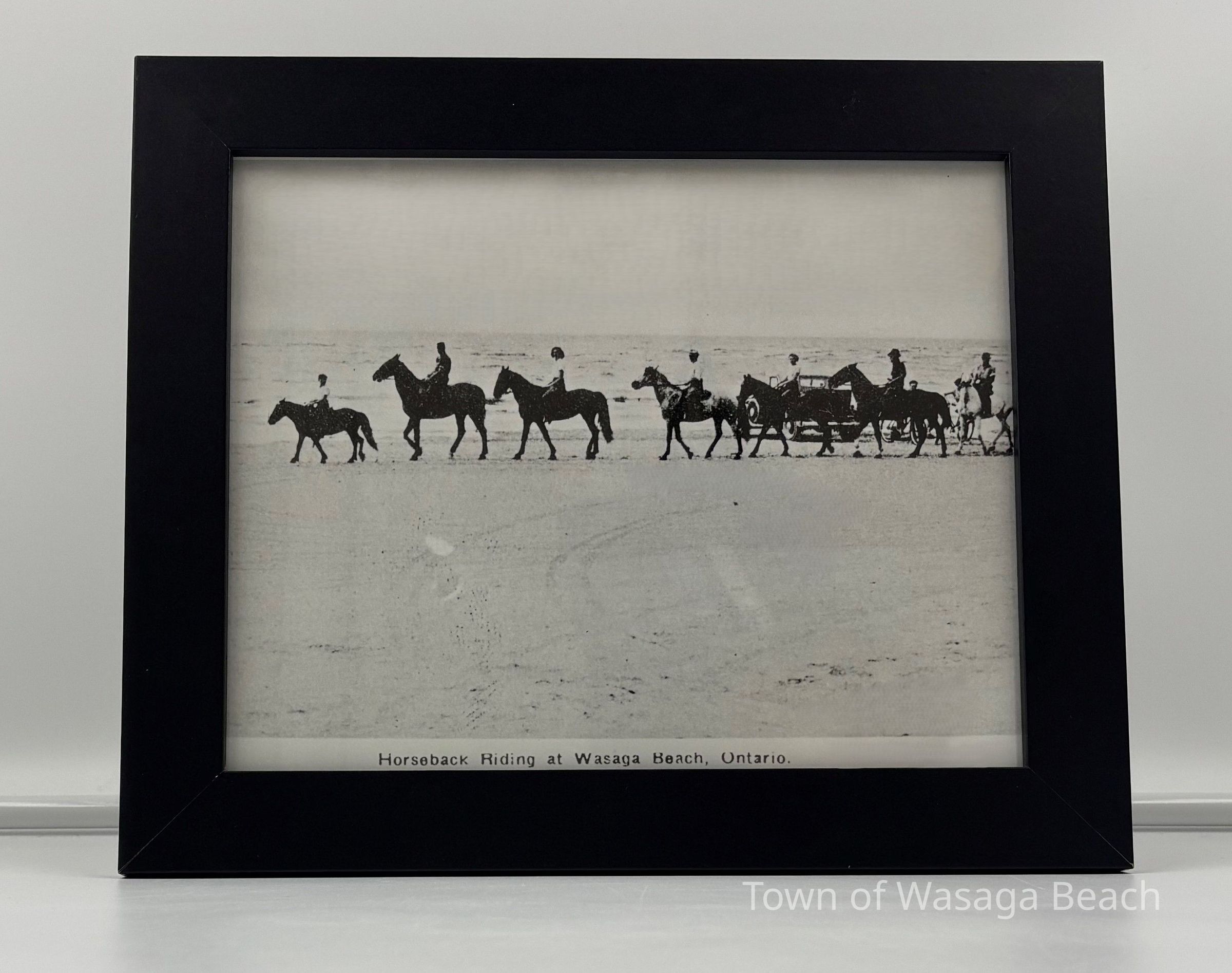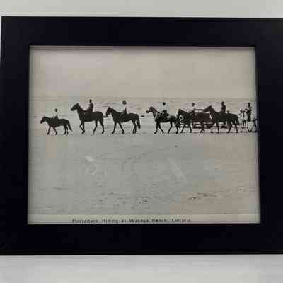 Framed photograph of horseback riding on the beach, copy of a postcardContext
