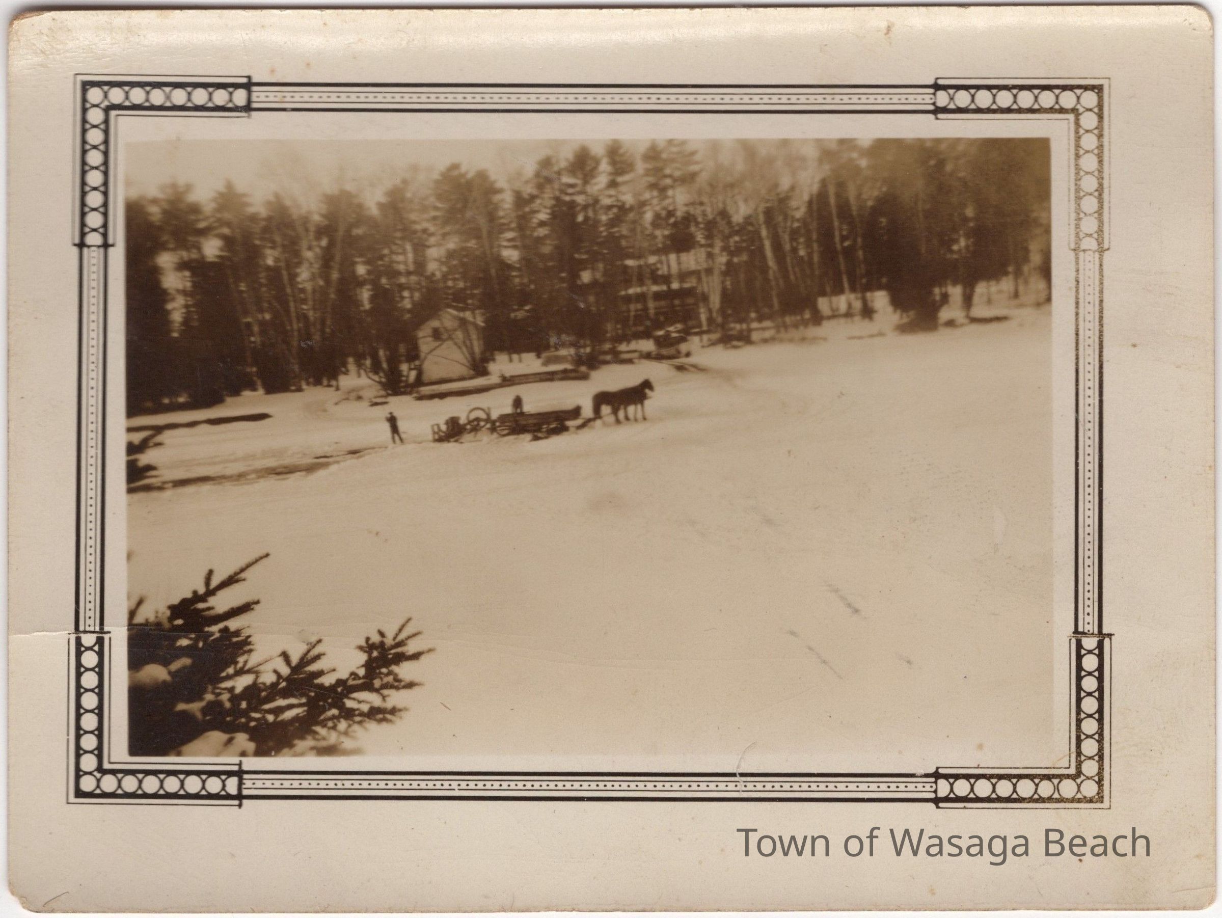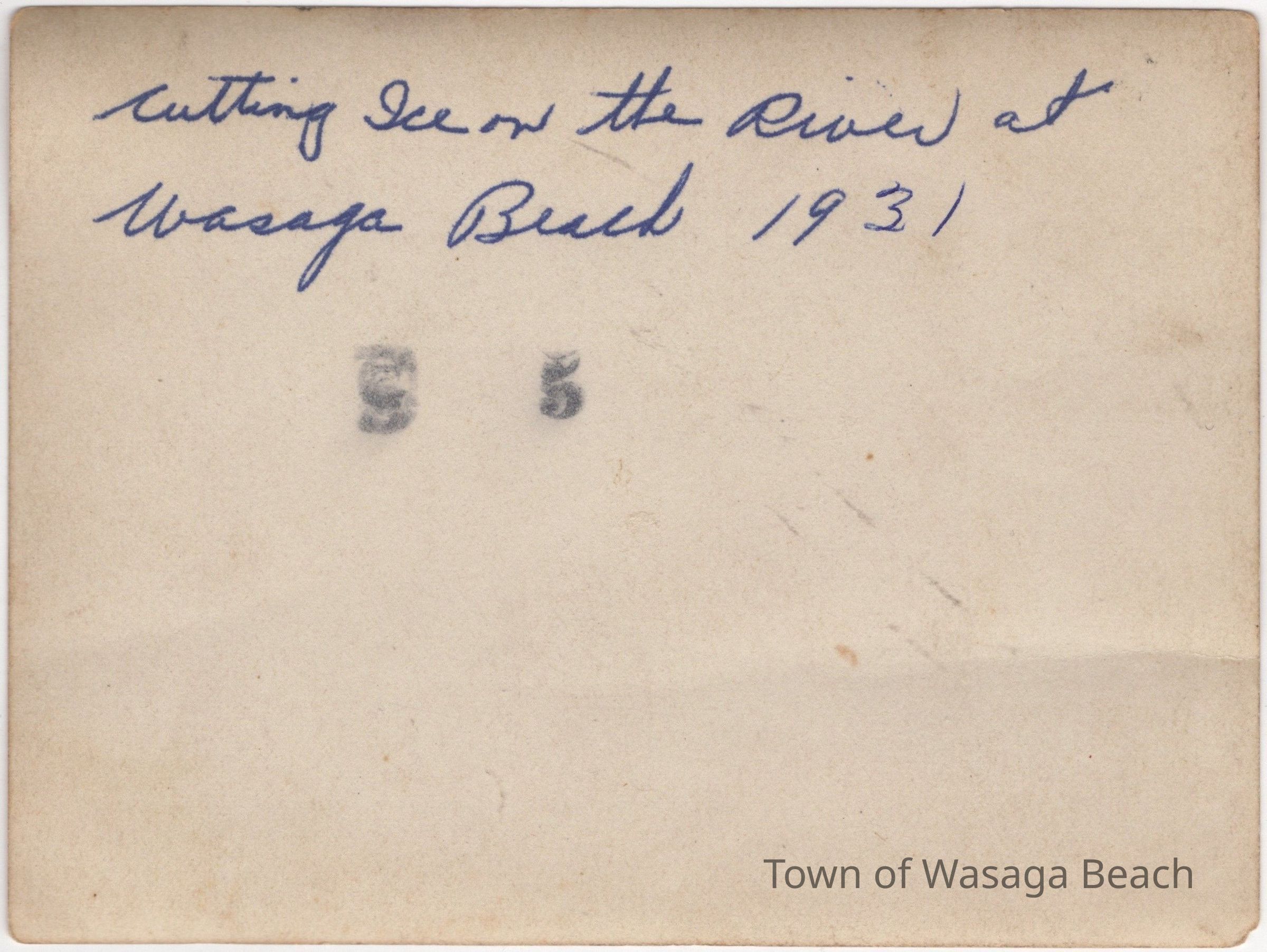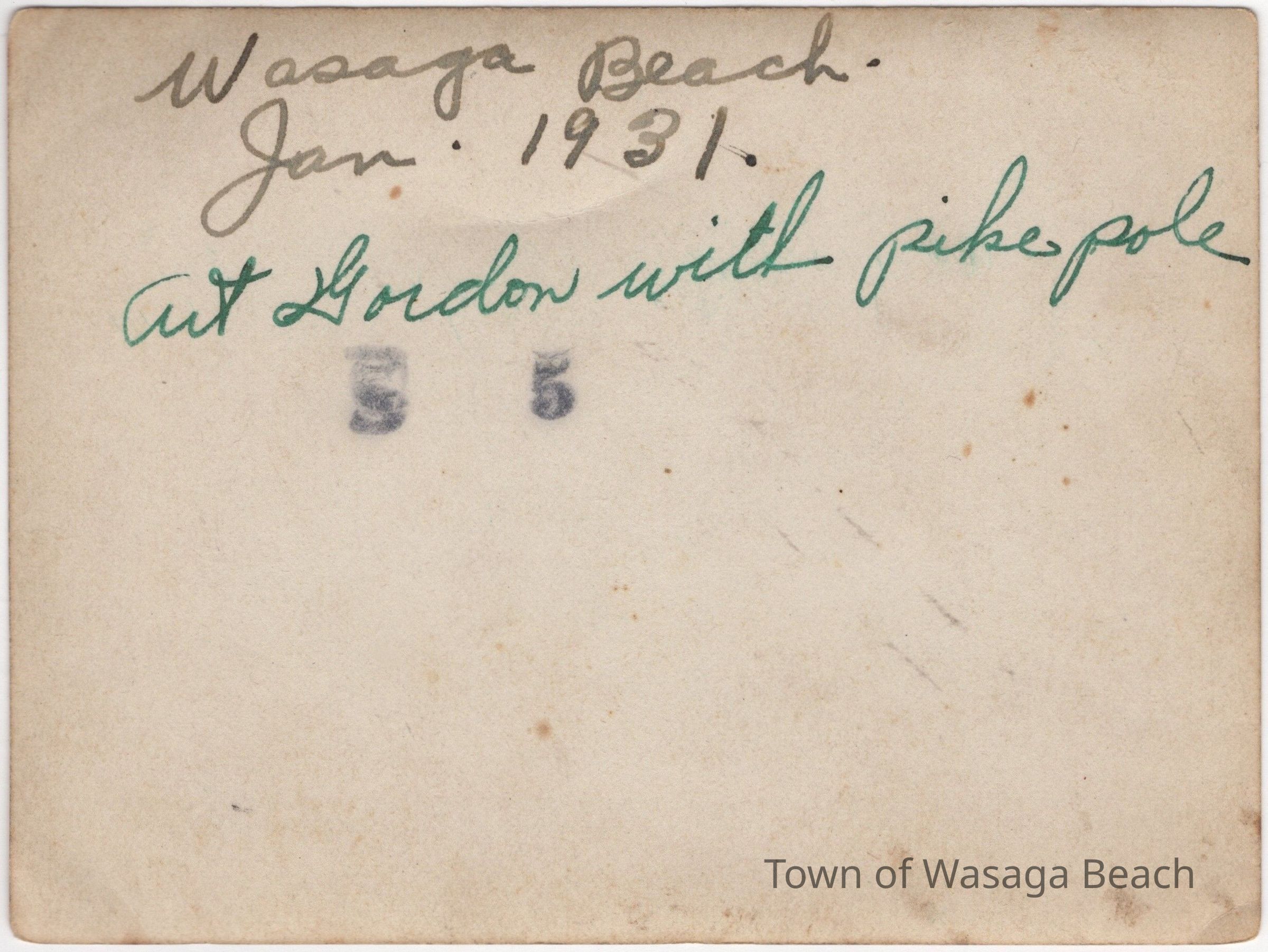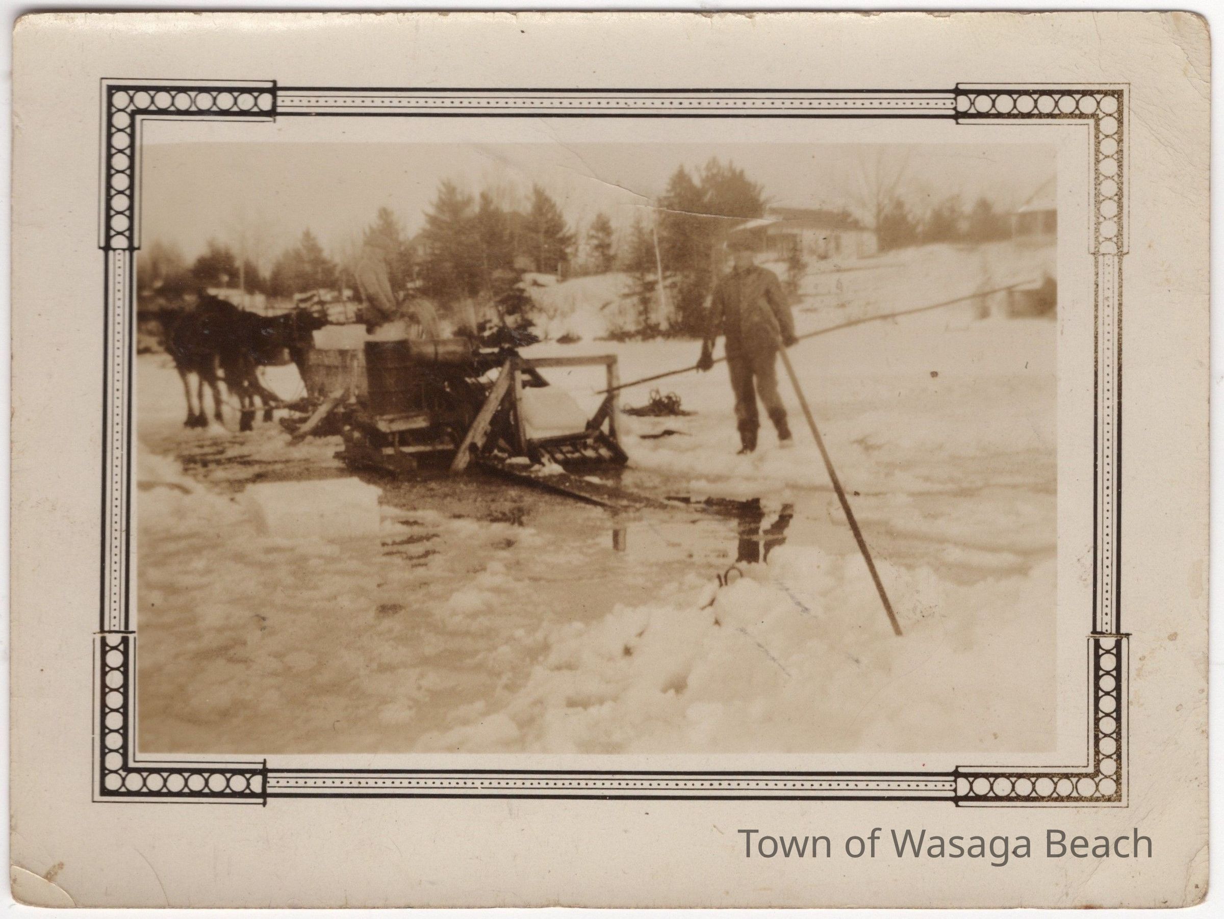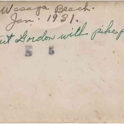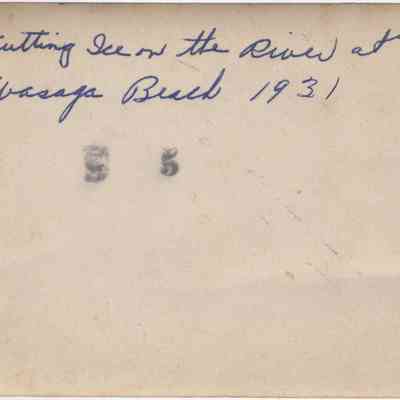 The photographs show scenes from ice cutting at Wasaga Beach in 1931. Ice blocks were cut from Georgian Bay, Marl Lake and the Nottawasaga River to sell to residents and visitors to keep food cold in ice boxes before refrigerators were popular. In photo #1, horses, men and ice cutting equipment can be seen on the river with houses in the background. From information written on the back of the photo #2, Art Gordon is shown holding a long pike pole, used in the ice cutting process. Arthur (Art) Gordon, 1912-1969, was Jean Whiteside’s brother. His wife was Dorothy (Price),1908-1987. Their daughter was Verna Gordon, 1941-2023.