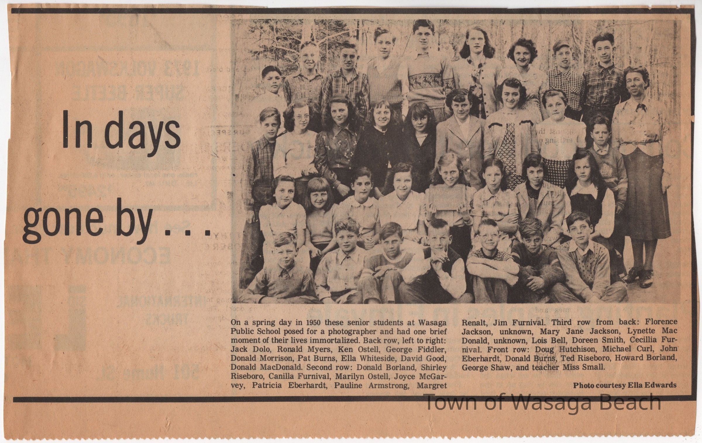 The article includes a classroom photograph of the senior students at Wasaga Beach Public School in the spring of 1950. The teacher was Miss Small and the student names are listed in the article. The photo is courtesy of Ella Edwards.