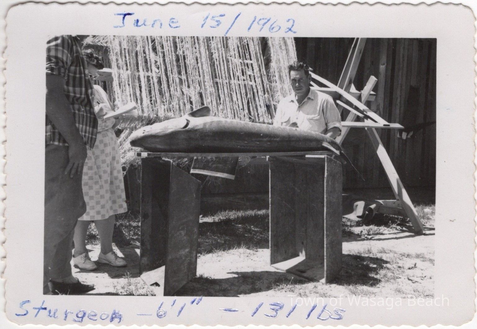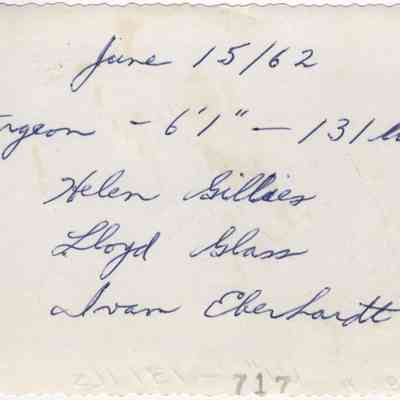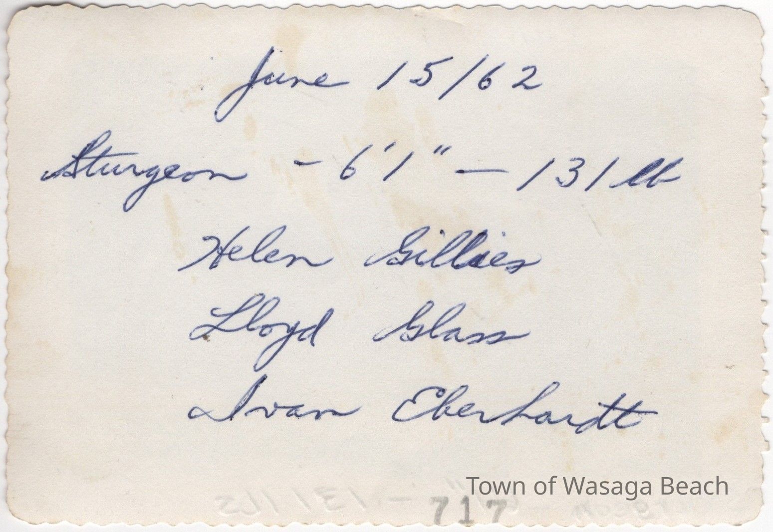 Lorraine Pomeroy (Eberhardt), donor of the photograph, is daughter of Ivan and Bessie Eberhardt, sister of Robert (Bob) and Harvey Eberhardt and granddaughter of Charles (Charlie) Eberhardt. The photograph, from June 15, 1962, shows Ivan Eberhardt, with a Sturgeon fish, 6'1" long weighing 131 lbs. Fishing was one of the businesses that the Eberhardt family operated. As noted on the back of the photo, also standing in the picture are Lloyd Glass and Helen Gillies. Helen Gillies was the first appointed Town Archivist, newspaper journalist and author.