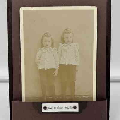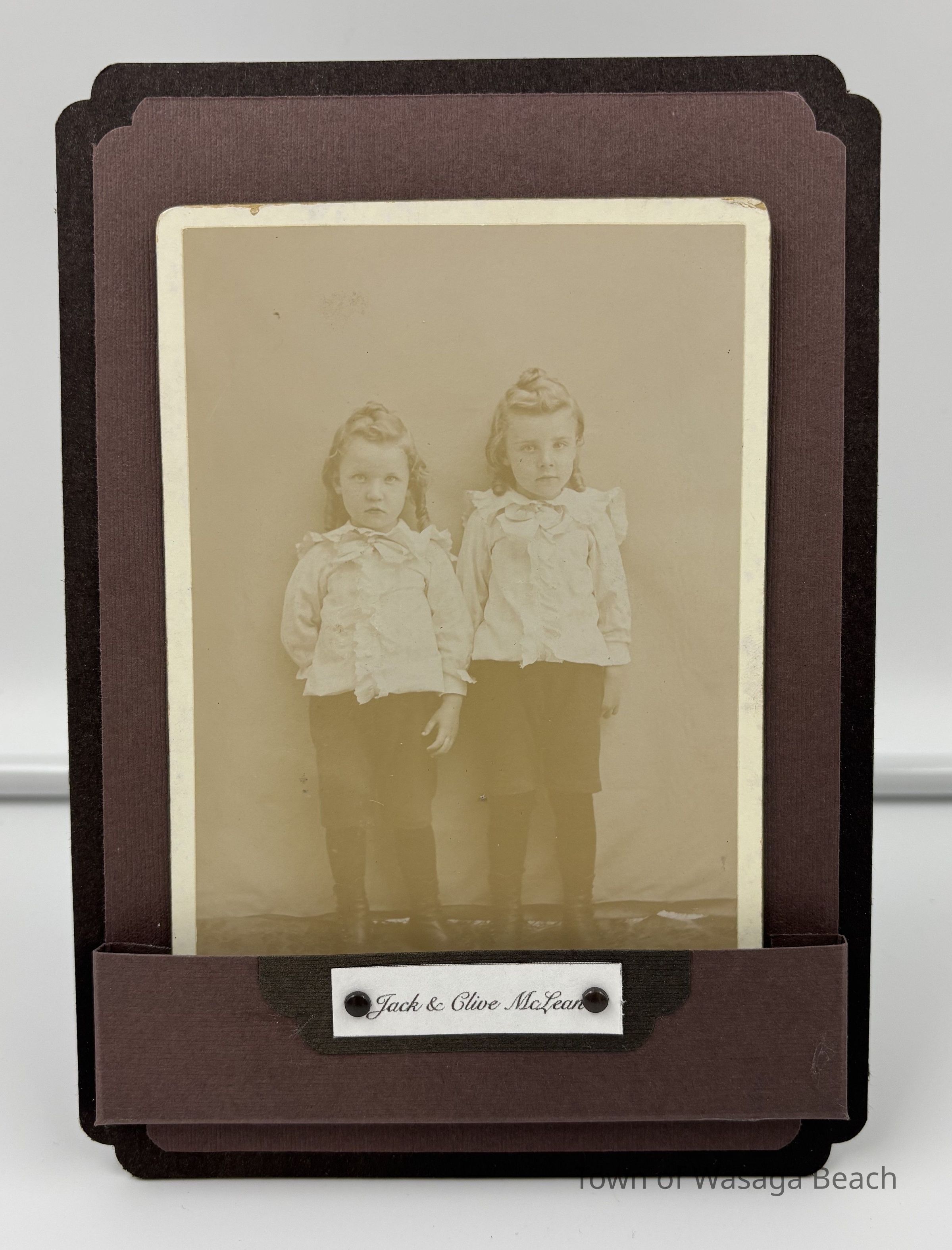 The photograph shows two children with curly hair standing side by side. The photograph is attached to heavy paper stock. Imprinted below the picture is the photographer name: "D. Reitzel, Massey". On the back of the card, handwritten in pencil: "Jack and Clive McLean".Acquisition