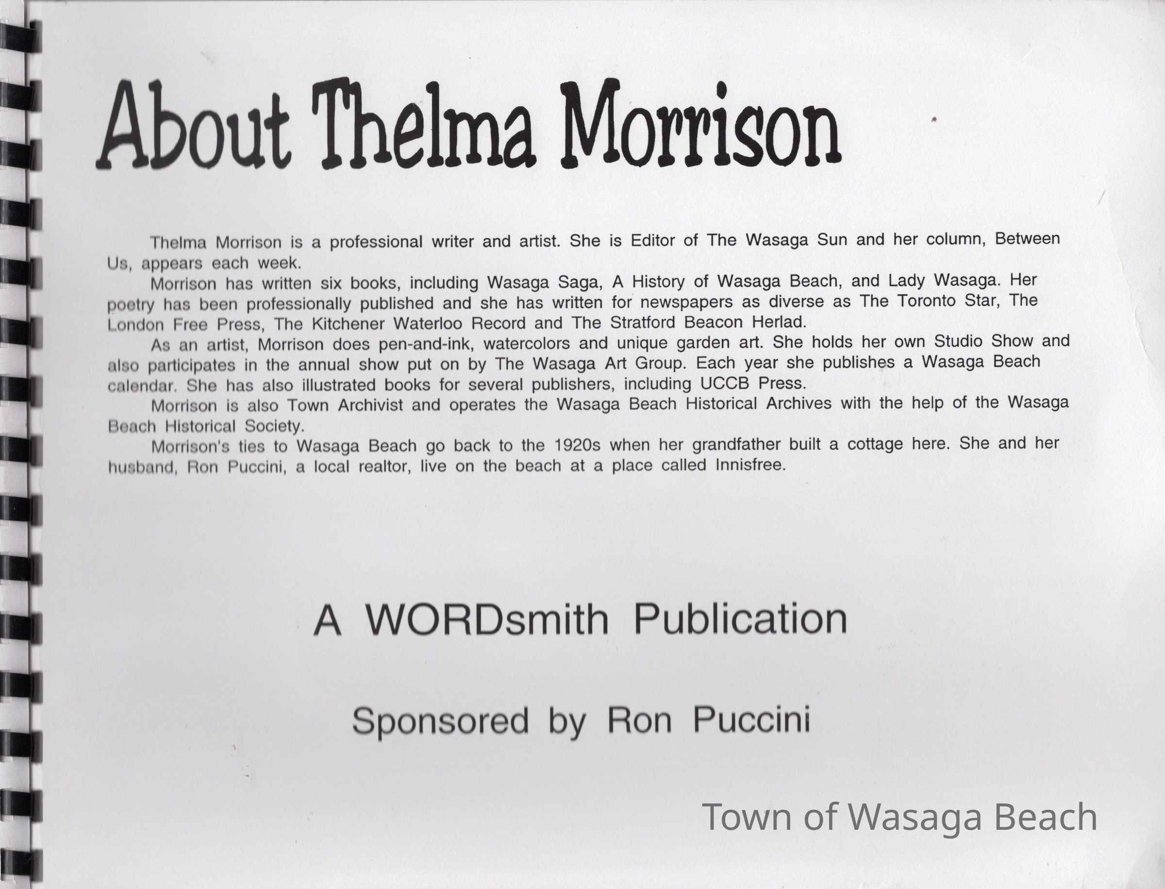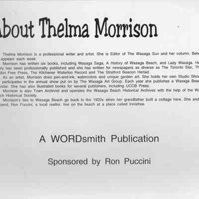 Thelma was a local journalist, entrepreneur, author, artist and volunteer Archivist for the Town of Wasaga Beach from 1997 until she retired in 2008.Acquisition