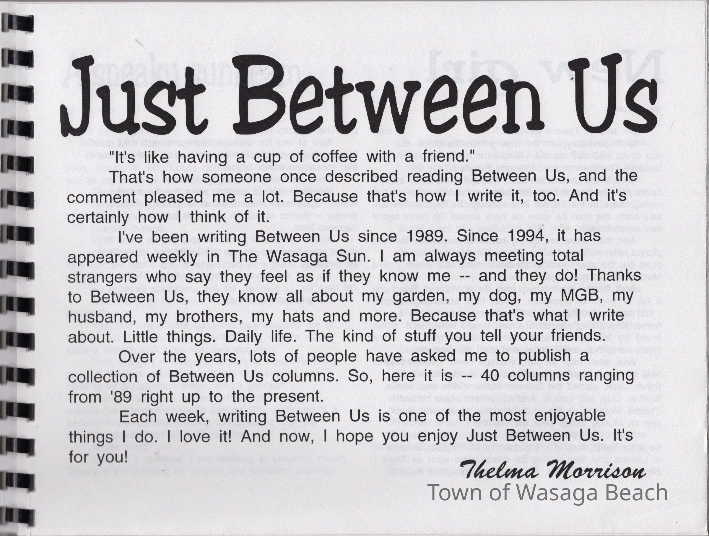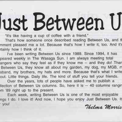 The book titled "Just Between Us", written by Thelma Morrison, is a collection of 40 columns Thelma wrote beginning in 1989. The book is a WORDsmith Publication and is sponsored by Ron Puccini, Thelma's husband.