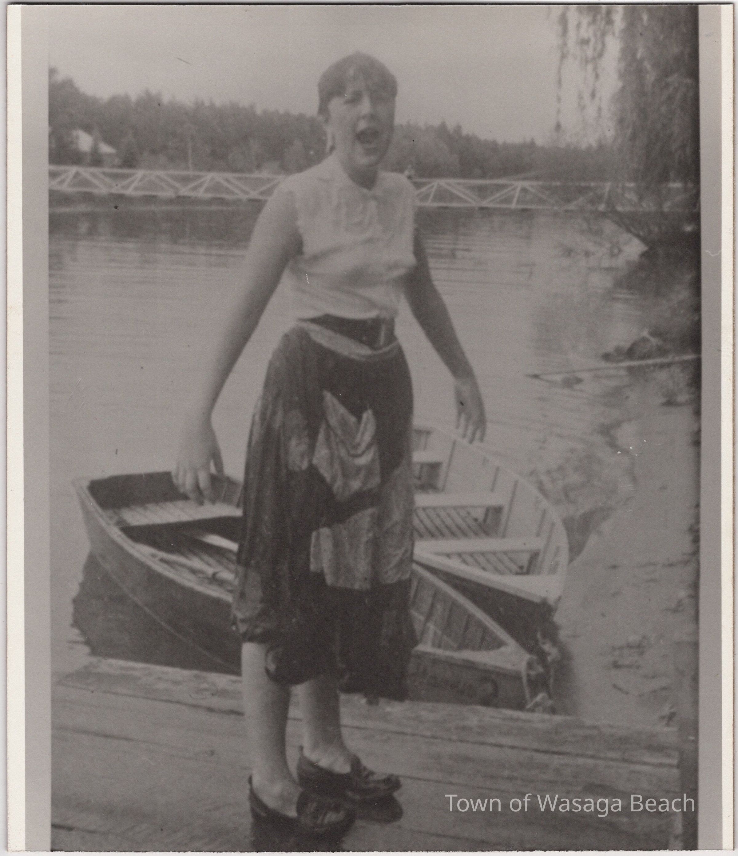 The photograph includes a lady who is soaking wet, standing on a dock on the river. There are two rowboats beside the dock with a bridge in the background.Acquisition