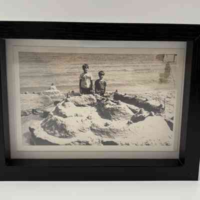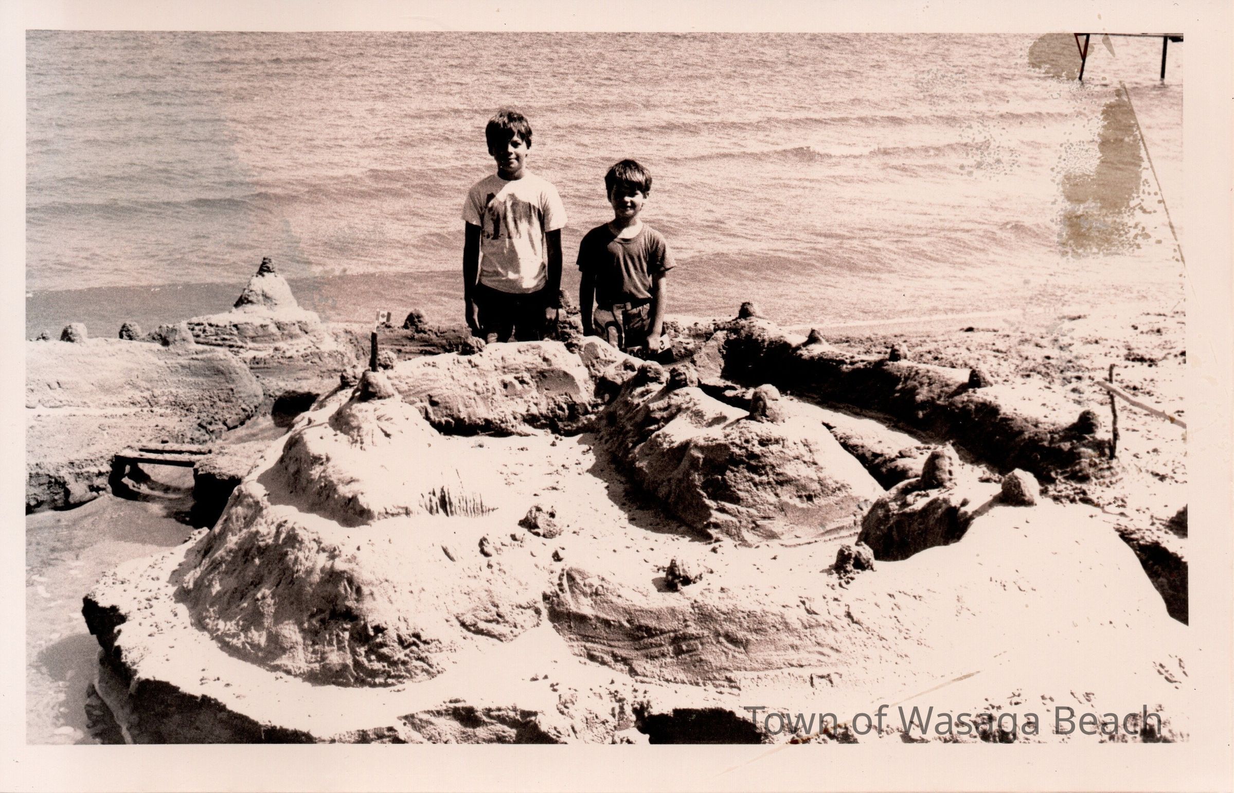 The black and white photograph shows two children standing on the beach near a large sandcastle. The beach water seen nearby in the background.Acquisition