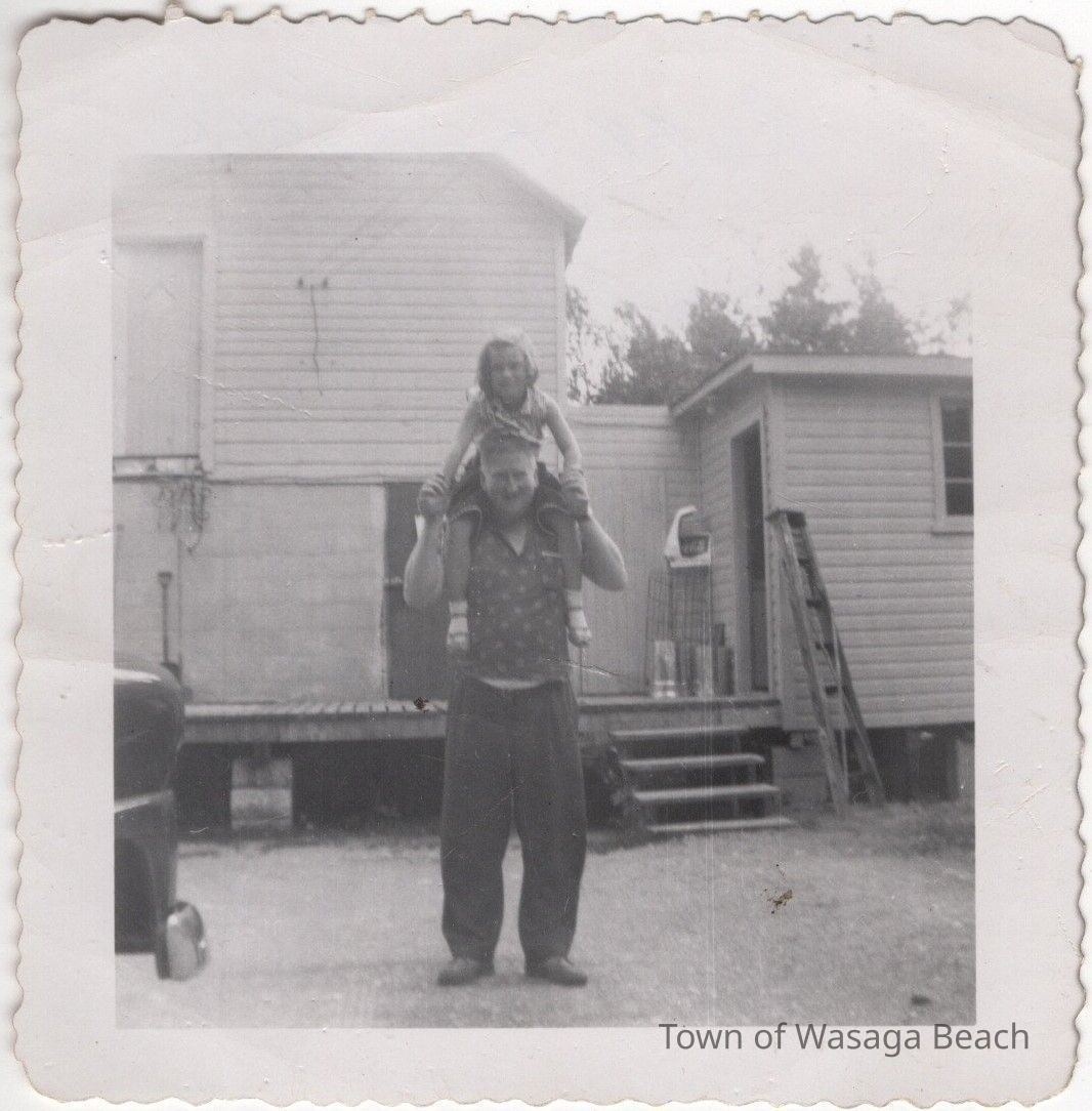 Lorraine Pomeroy (Eberhardt), donor of the photograph, is daughter of Ivan and Bessie Eberhardt, sister of Robert (Bob) and Harvey Eberhardt and granddaughter of Charles (Charlie) Eberhardt. Lorraine is shown in the photograph with Russ Kenwell and the Ice House on River Road West in the background. Russell Kenwell was the first Fire Chief for the Town of Wasaga Beach. He served on the Fire Department for 30 years including 20 years as Fire Chief. The record rainbow trout, weighing 29 lbs., 2 oz., was caught in the Nottawasaga River by Russell Kenwell, May 13, 1975. The rainbow trout held the world record in its class 1975-1988.