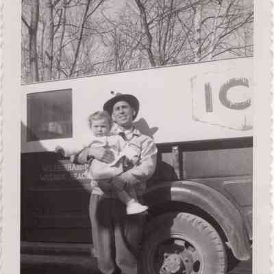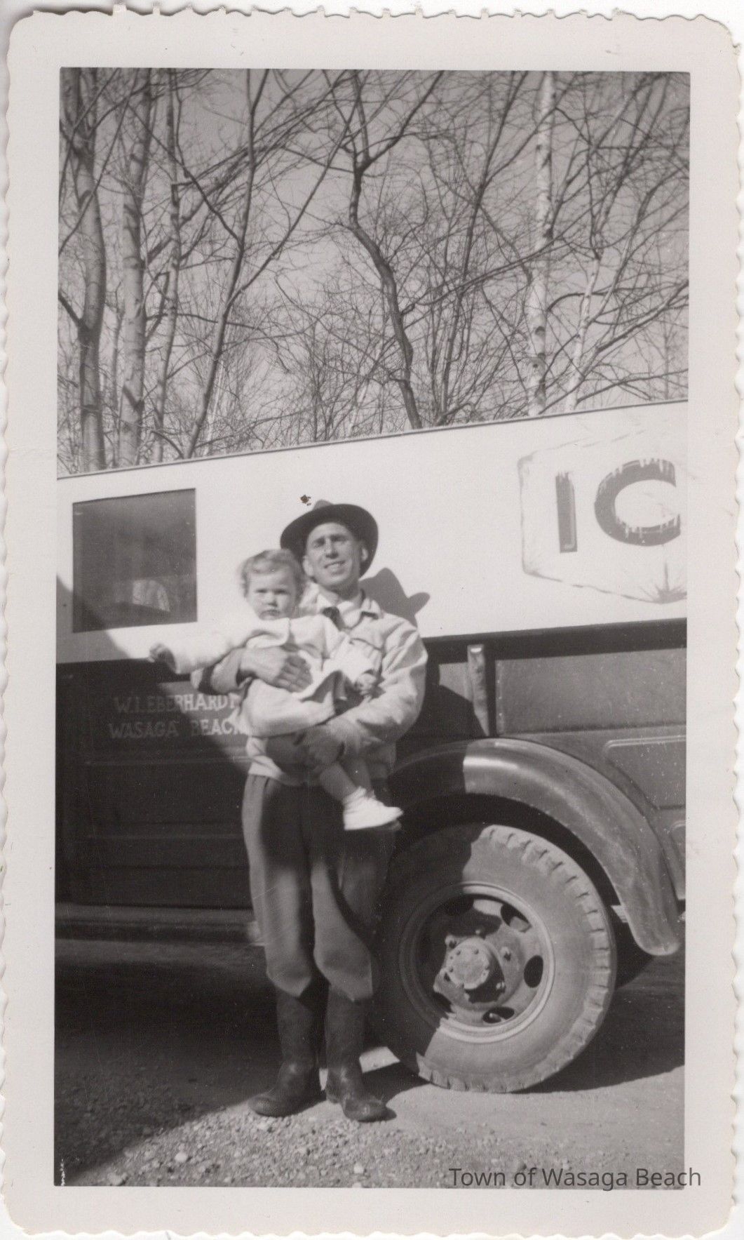 Charlie Eberhardt was one of Wasaga’s early entrepreneurs who moved to the area around 1905. Mr. Eberhardt caught fish and sold them to neighbours and summer visitors. He also operated an ice cutting business. The Eberhardt family lived at the corner of River Road West and Beck Street where Gough’s landing is now located, also the location of the featured photographs. There was a large barn behind their house where the ice was stored; covered with sawdust and woodchips. Part of the original barn was incorporated into the Gough's Landing condo complex when it was built. Ice blocks were cut from Marl Lake and Nottawasaga Bay in the winter to sell to locals and tourists to keep their food cold as refrigerators were not common then. Charles also built a general store located at the northwest end of the Main Street Bridge. He then added a second floor and began renting rooms to tourists and year-round visitors. The top floor of the store eventually became a classroom for students. The Eberhardt family also ferried people up and down the river and across the bay from Wasaga to Collingwood. In later years they operated a taxi business and a miniature golf. Ivan Eberhardt took over the ice business from his father, Charles Eberhardt in 1952.