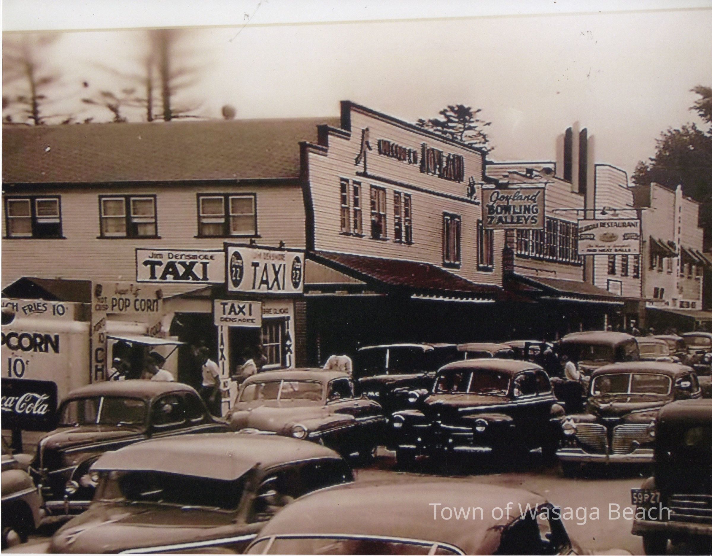 A photo of the Main Street of Wasaga Beach, circa 1940's - 1950's showing vintage cars parked and driving along the street. A business "Taxi" sign and "Joyland Bowling 7 Alleys" sign are visible.Acquisition