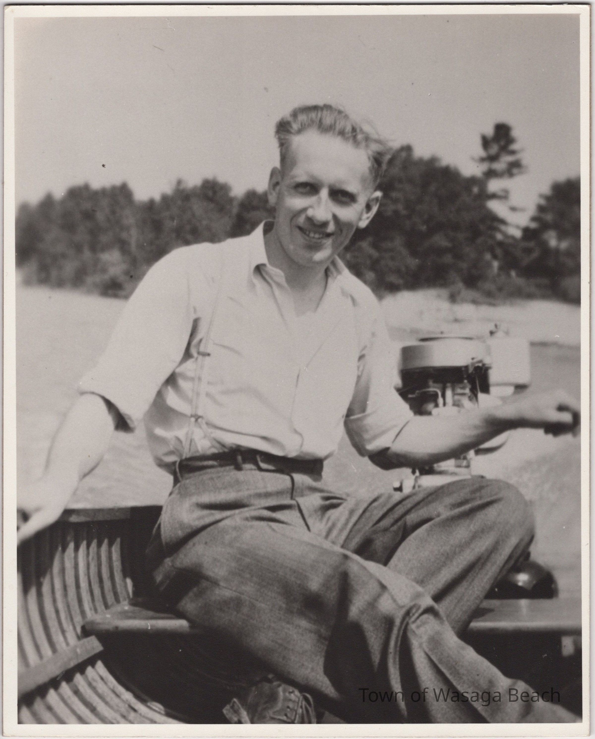 The photograph shows a man sitting as he drives a small boat.Acquisition