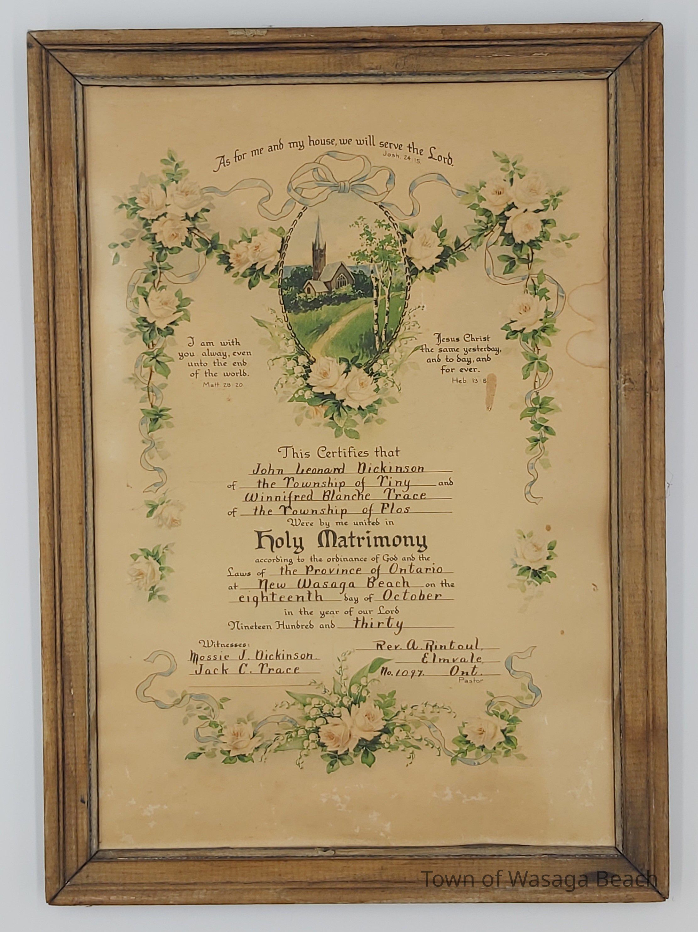 Photo of a framed marriage certificate of the first wedding at Allenwood Church on October 18, 1930Context
