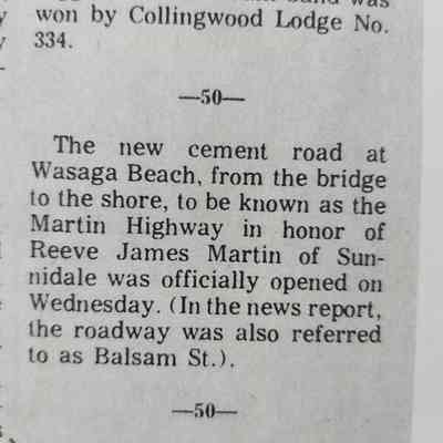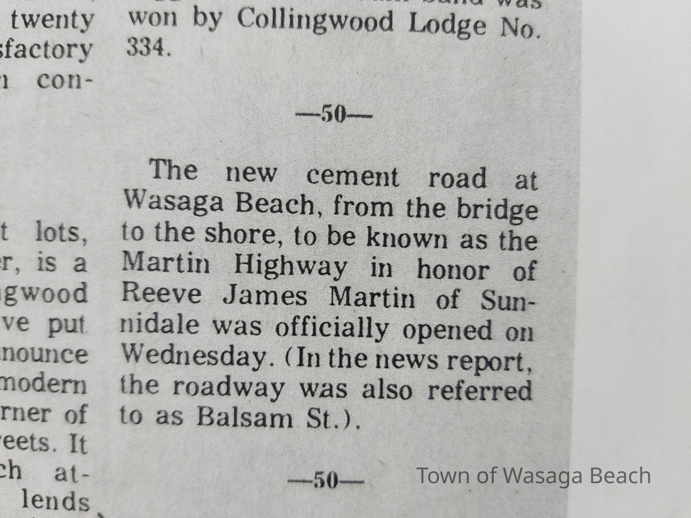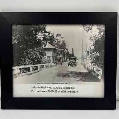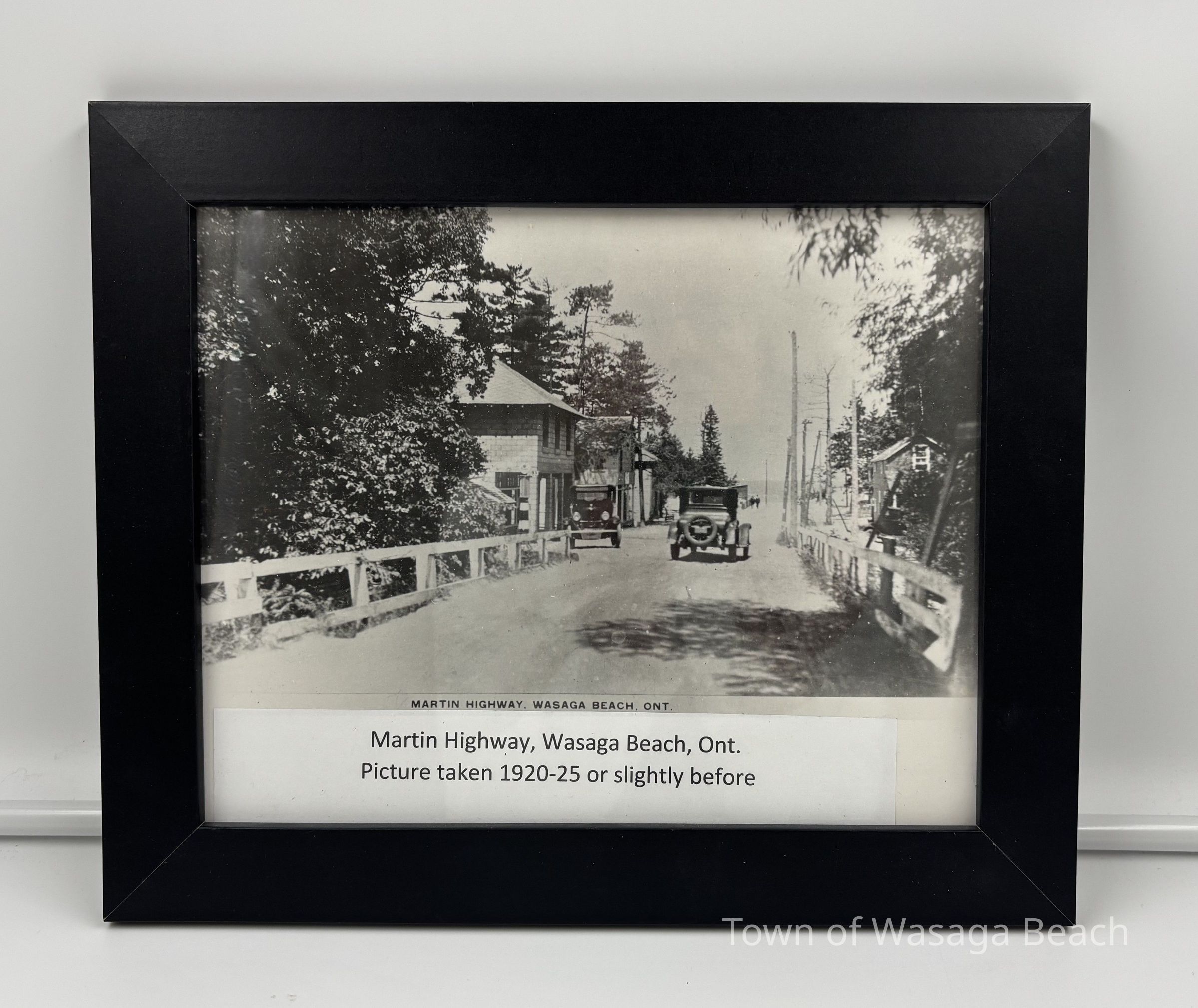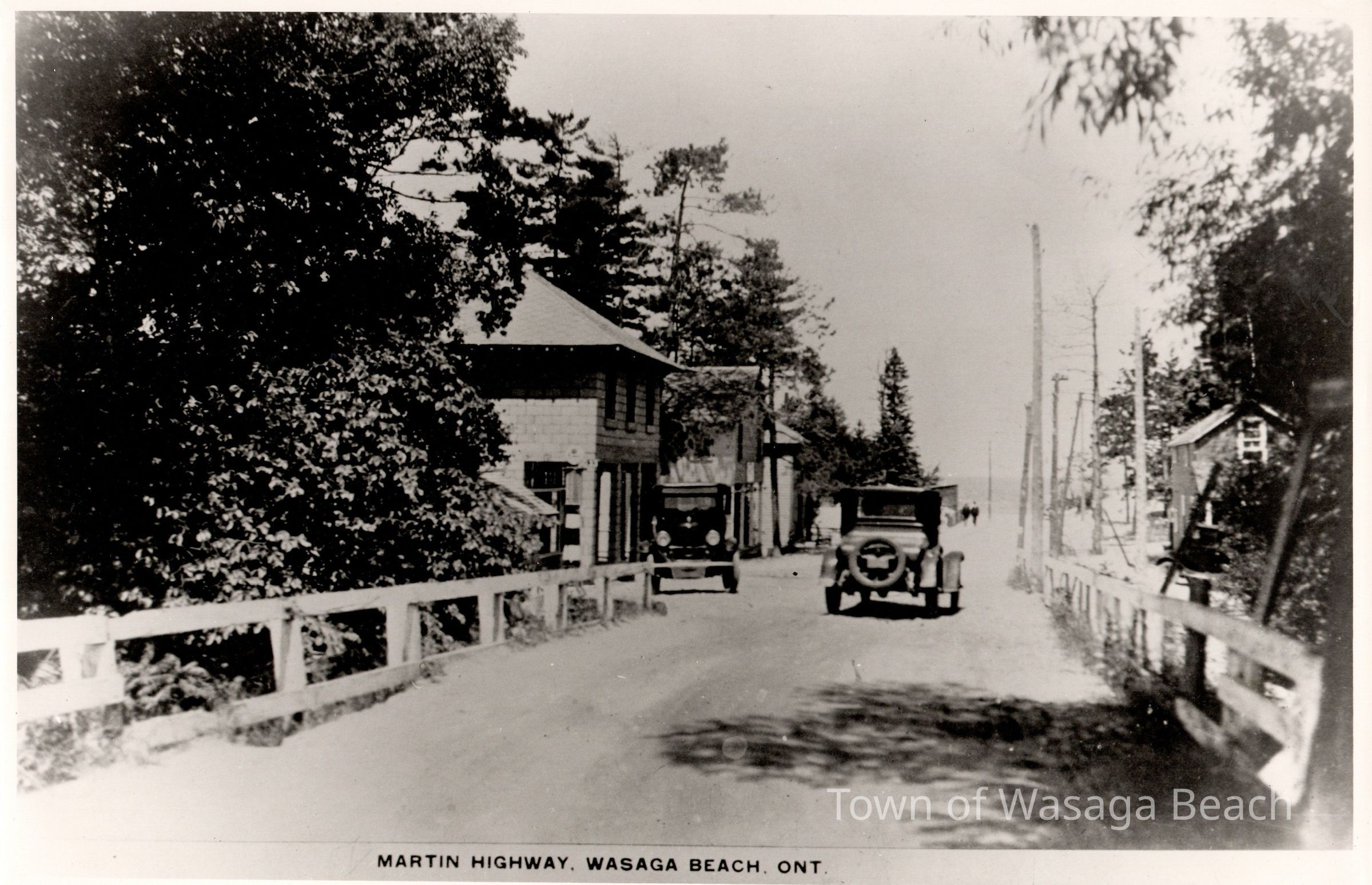 As noted on the label attached to the back of the photograph, the photograph was taken circa 1920-1925 or prior showing Martin Highway. Information from a newspaper article indicates Martin Highway was named in honor of Reeve James Martin of Sunnidale. The roadway was also known as Balsam Street and eventually Main Street. The picture is from the north end of the steel bridge, built in 1909, looking towards the beach along the original "Main Street.Acquisition