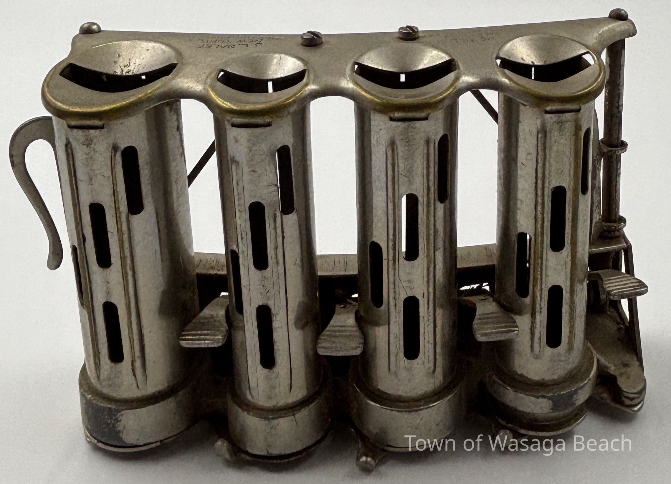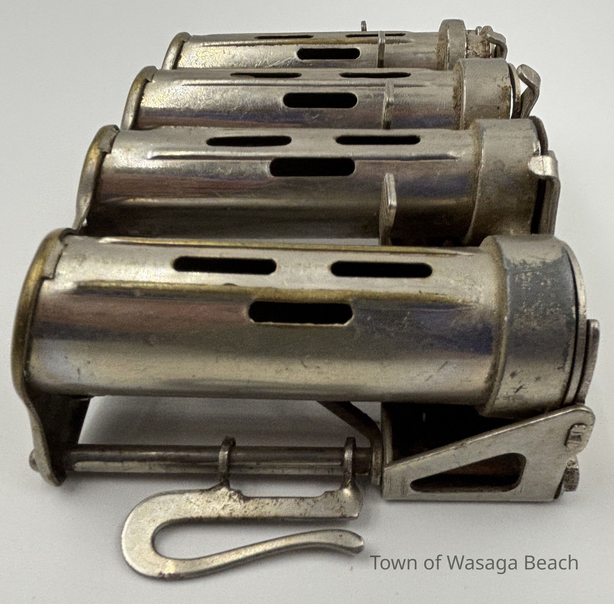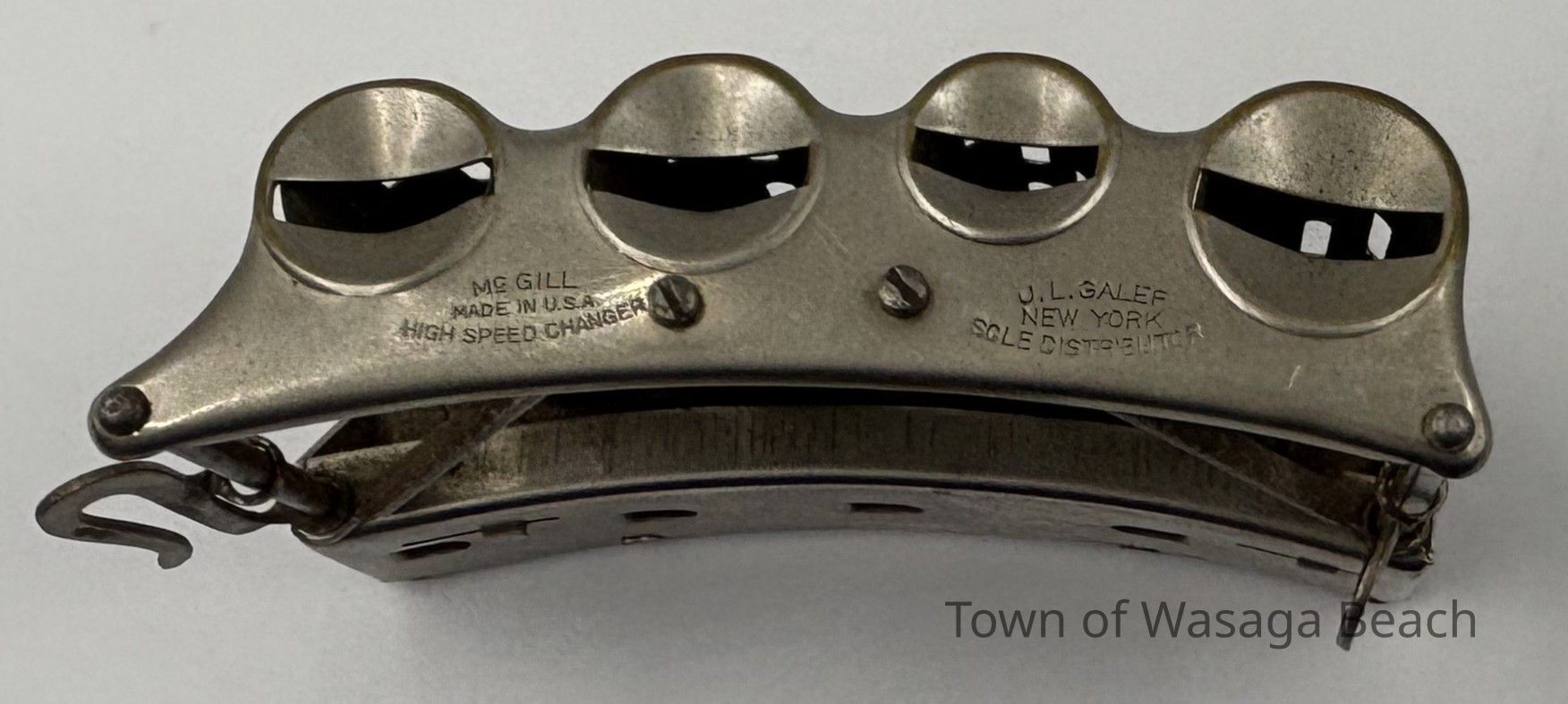 The metal coin changer was manufactured by McGill Manufacturing Company and was distributed by J.L. Galef & Co., New York. The featured coin changer was used by the Eberhardt family to dispense change when delivering ice to area residents and visitors prior to the use of refrigerators.