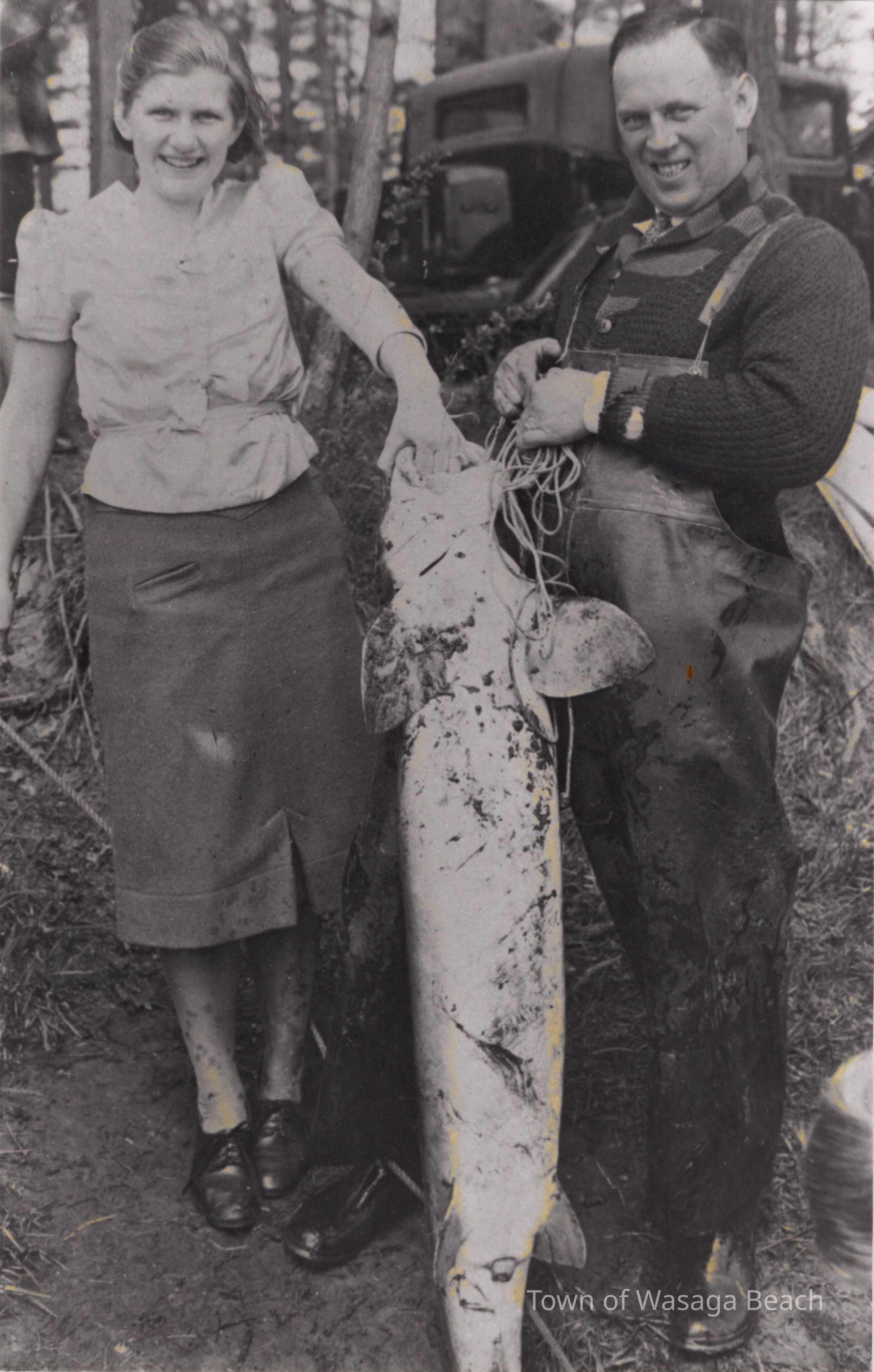 Black and white photo of Ivan and his sister Minnie Eberhardt (Speers) with a sturgeon fish caught in the Nottawasaga RiverContext