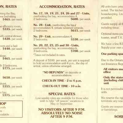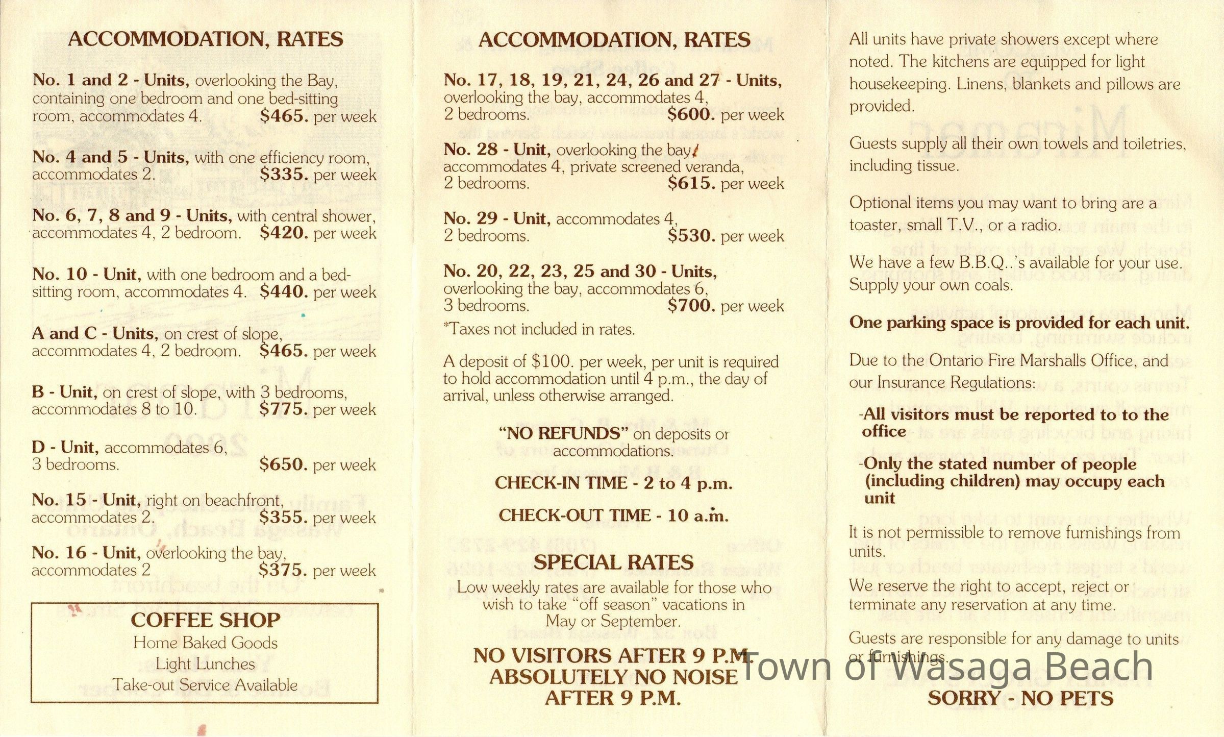 The inside pages of the pamphlet, lists information about amenities included, accommodation rates, check-in and check-out times, parking, pets, and refunds. It also notes there is a Coffee Shop with home baked goods and light lunches with a take-out service available.Acquisition