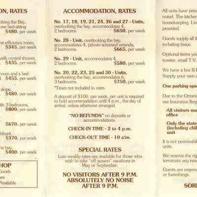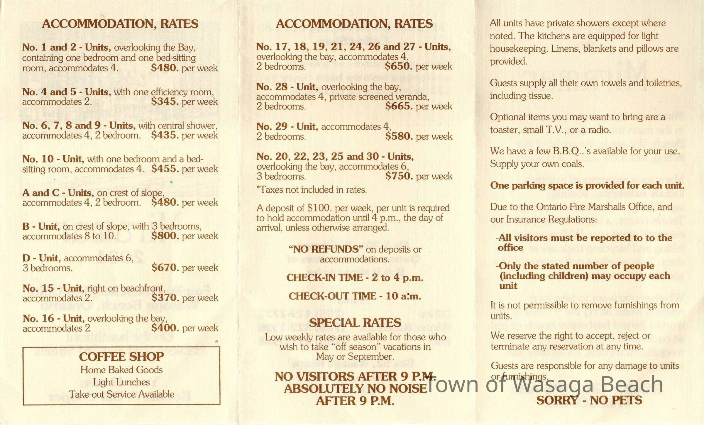 The inside pages of the pamphlet, lists information about amenities included, accommodation rates, check-in and check-out times, parking, pets, and refunds. It also notes there is a Coffee Shop with home baked goods and light lunches with a take-out service availabAcquisition