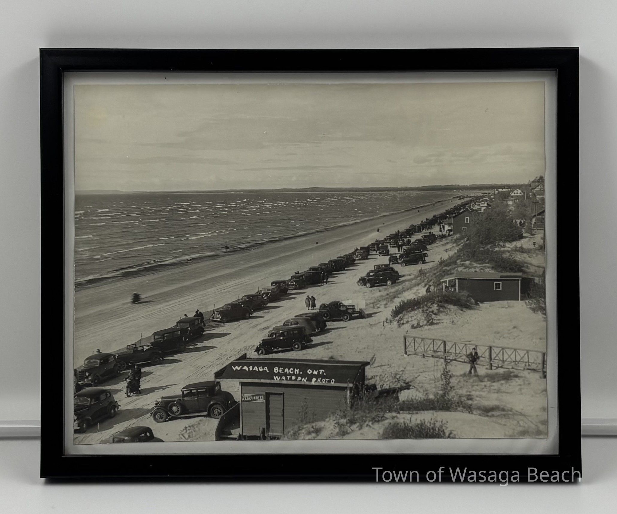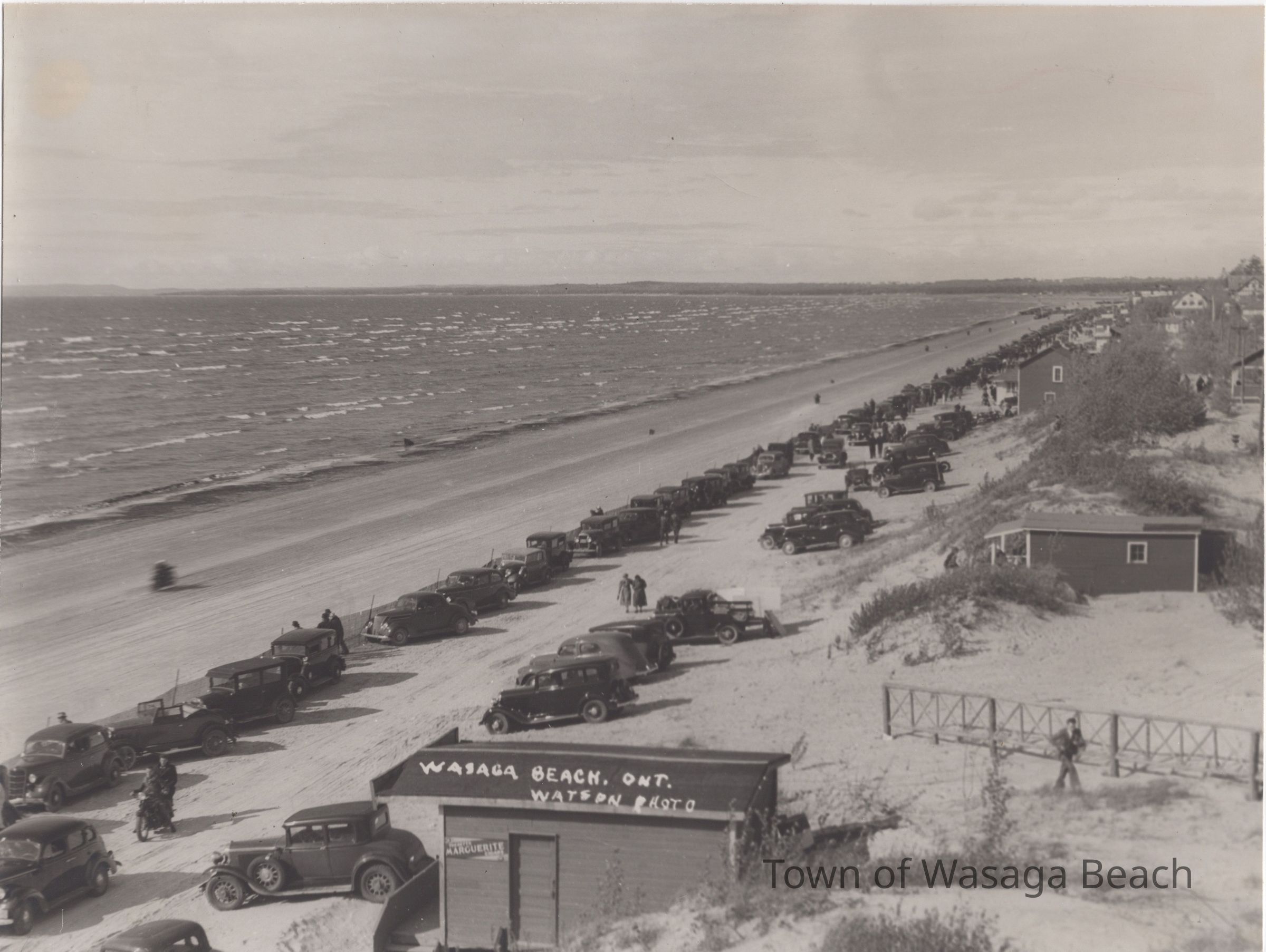 The original vintage photograph looks north-eastward along the beachfront at Wasaga Beach. Vehicles and spectators are contained behind a fence that stretches along the beach where motorcycles are racing.