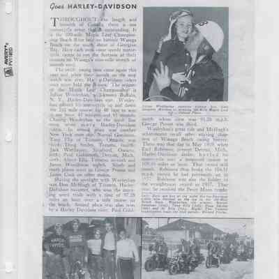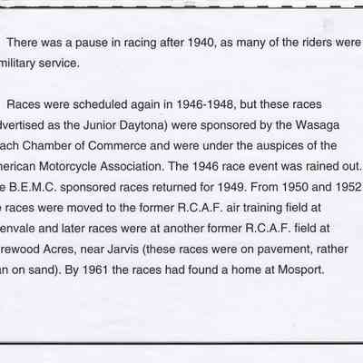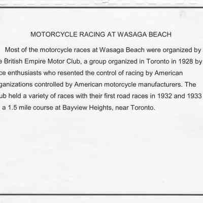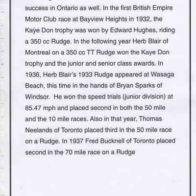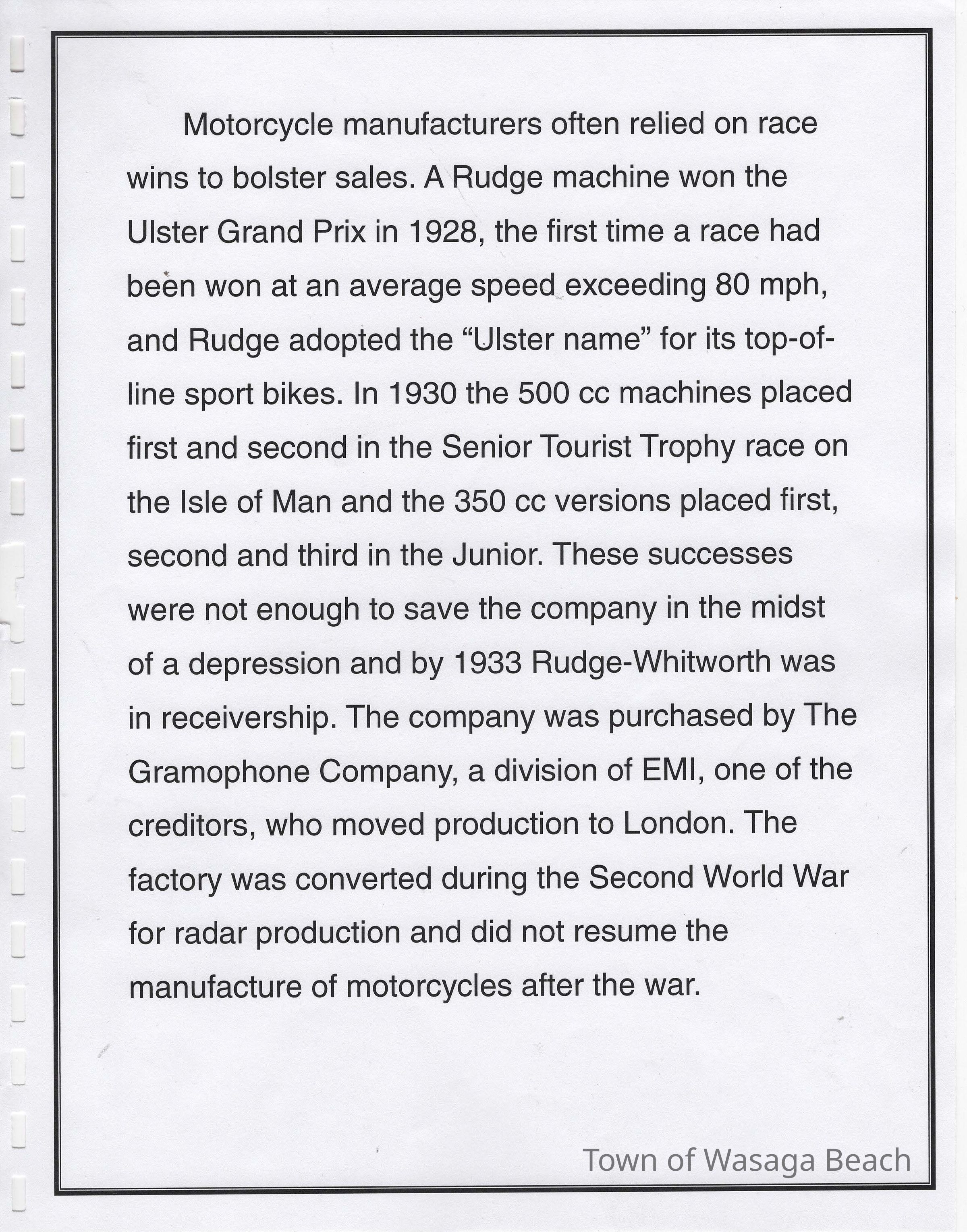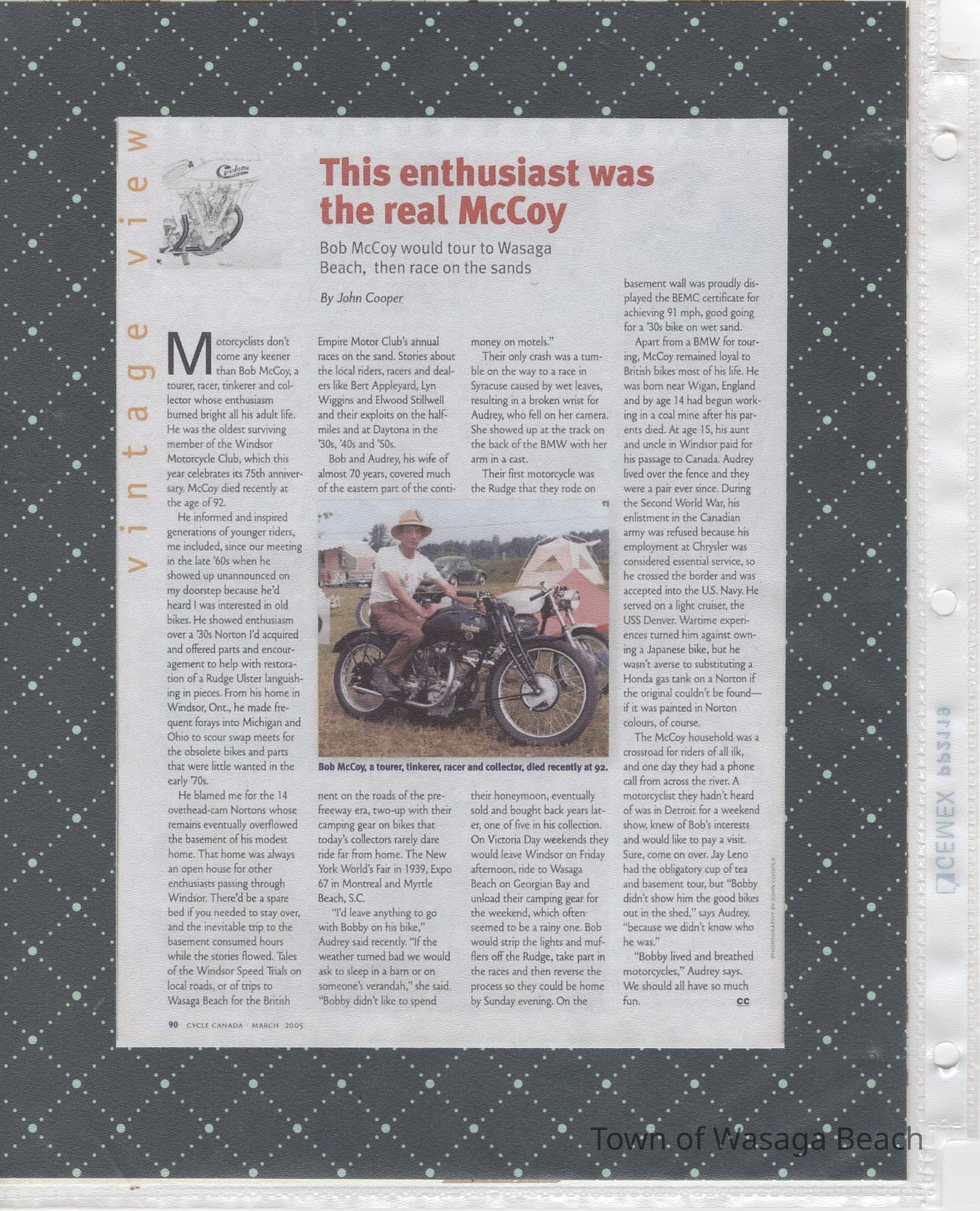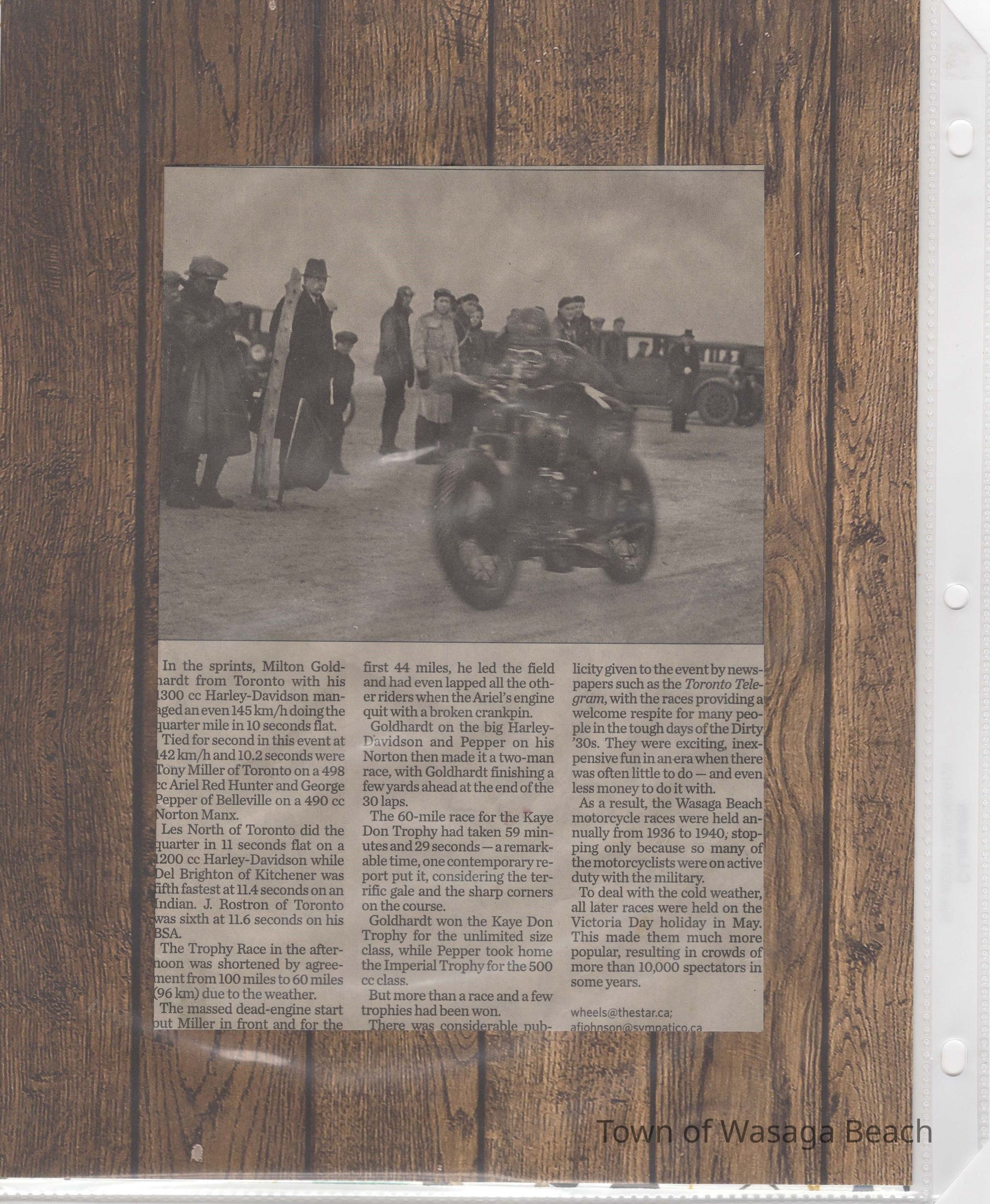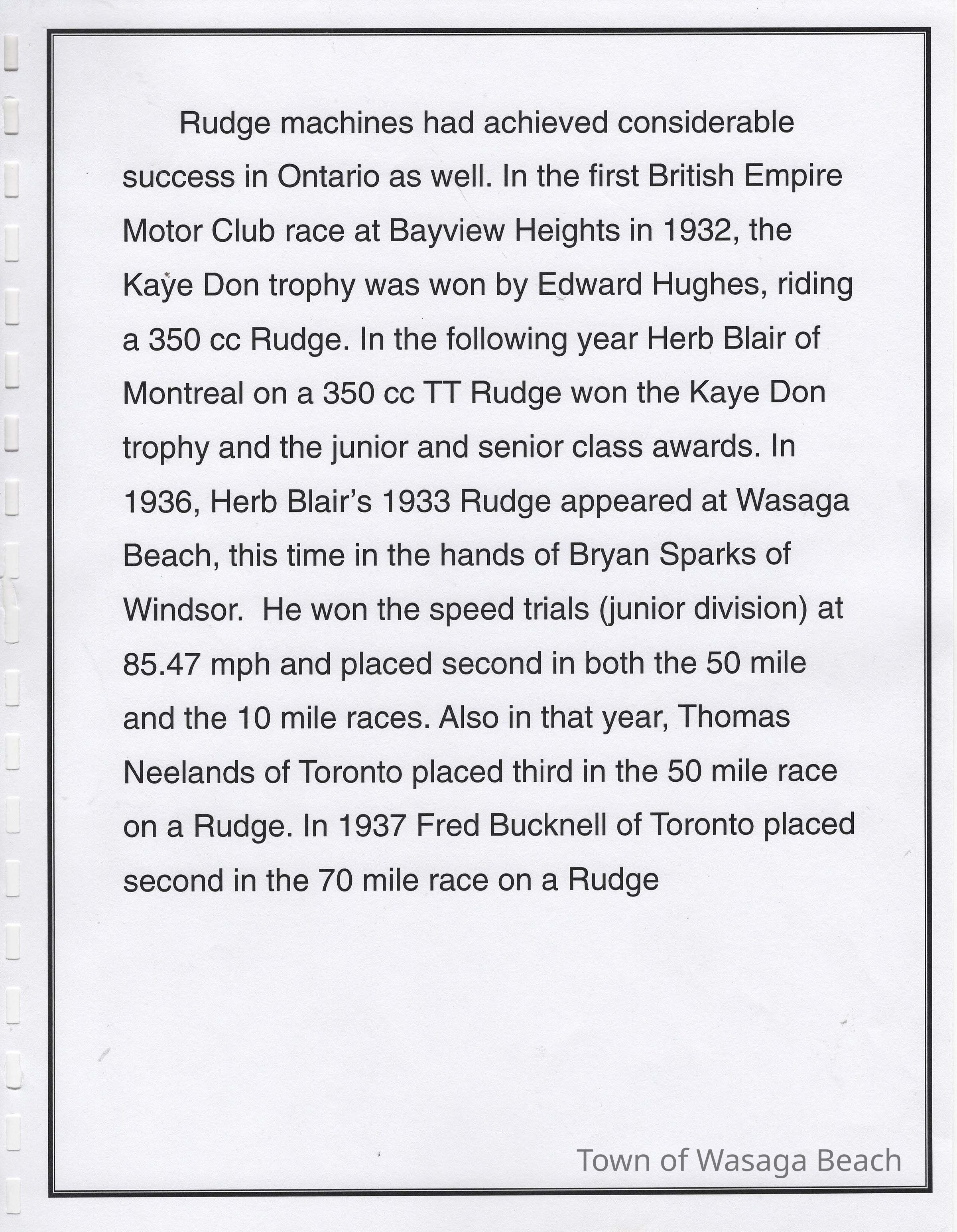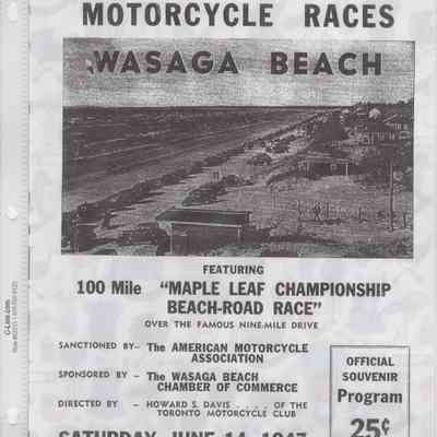 In 2014, the Town of Wasaga Beach purchased a rare vintage 1935 Rudge Ulster motorcycle that was originally owned and raced along the beach by Bob McCoy in 1937, reaching a speed of 89mph. Bob McCoy and the history of the Rudge motorcycle are featured in the album including various newspaper articles and a program from the "100 Mile "MAPLE LEAF CHAMPIONSHIP BEACH-ROAD RACE" held Saturday, June 14, 1947 including a welcome from the Executive of the Chamber of Commerce.