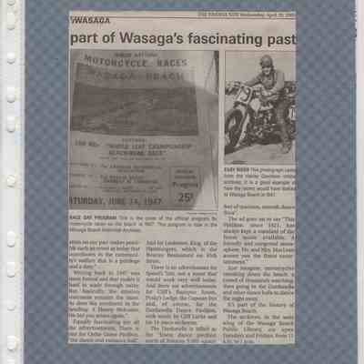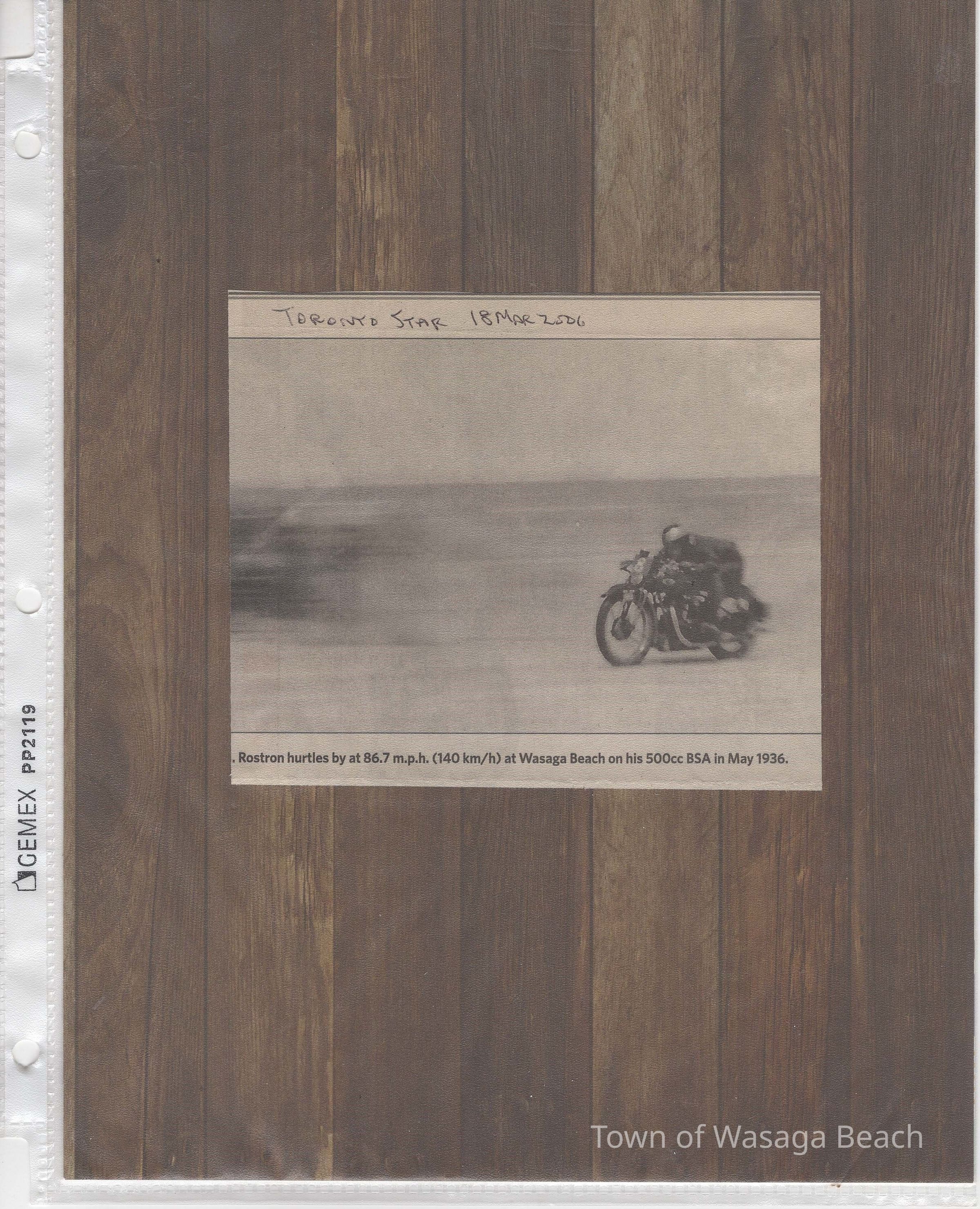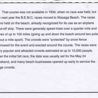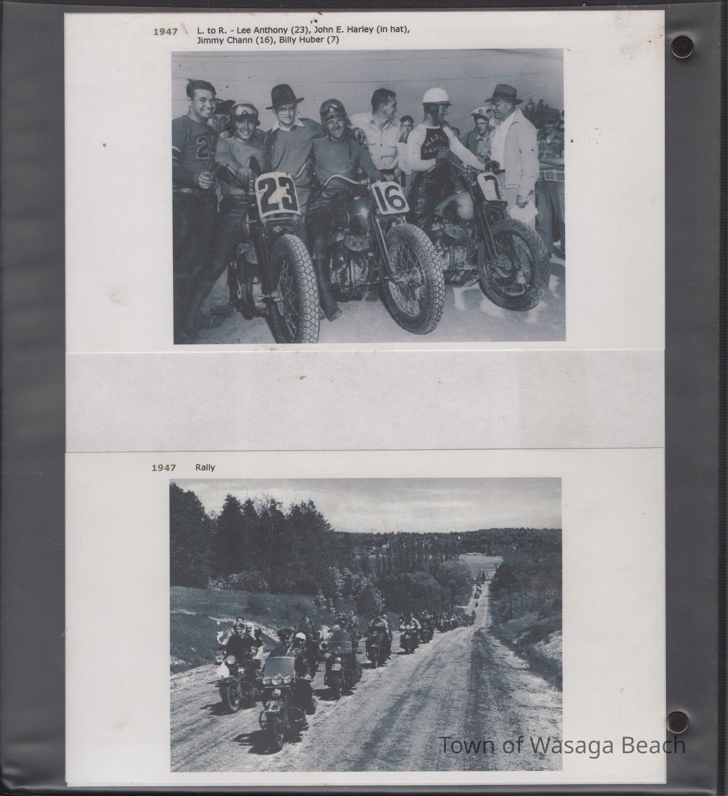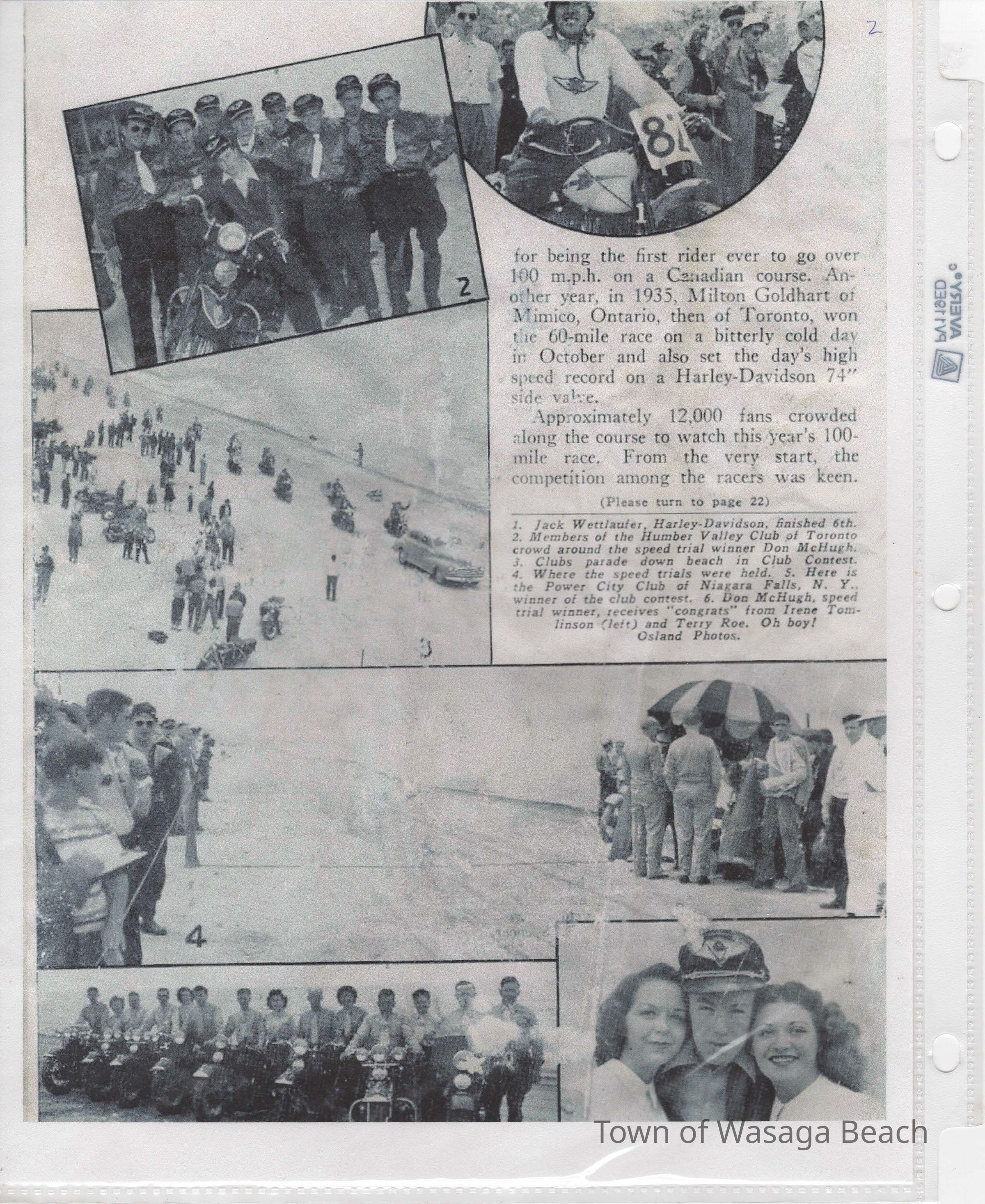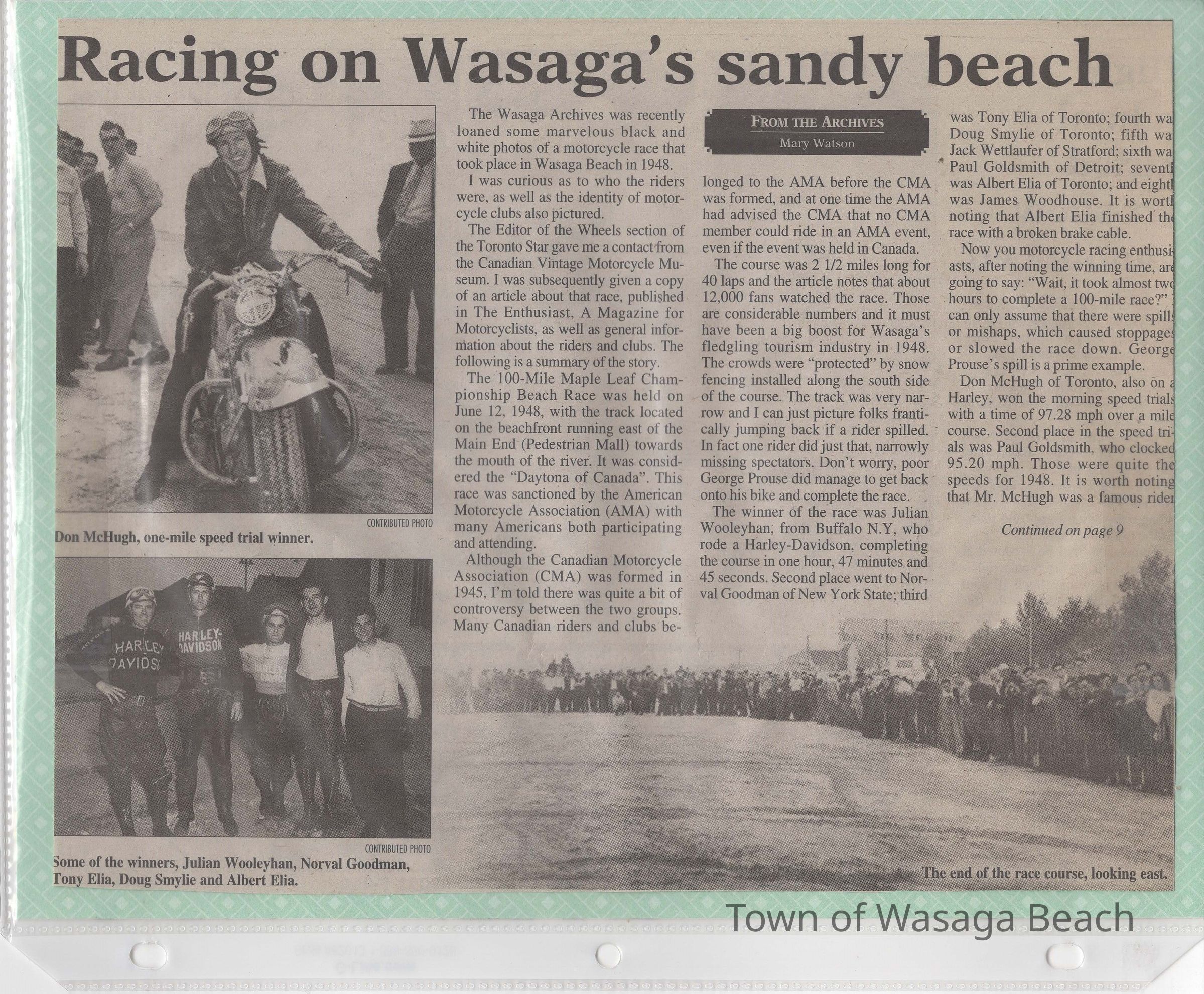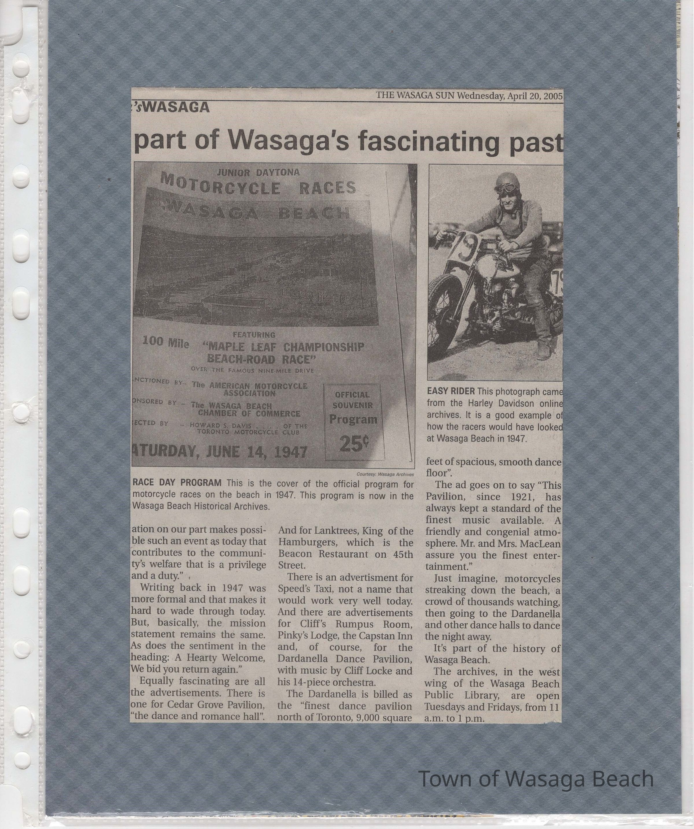 In 2014, the Town of Wasaga Beach purchased a rare vintage 1935 Rudge Ulster motorcycle that was originally owned and raced along the beach by Bob McCoy in 1937, reaching a speed of 89mph. Bob McCoy and the history of the Rudge motorcycle are featured in the album including various newspaper articles and a program from the "100 Mile "MAPLE LEAF CHAMPIONSHIP BEACH-ROAD RACE" held Saturday, June 14, 1947 including a welcome from the Executive of the Chamber of Commerce.