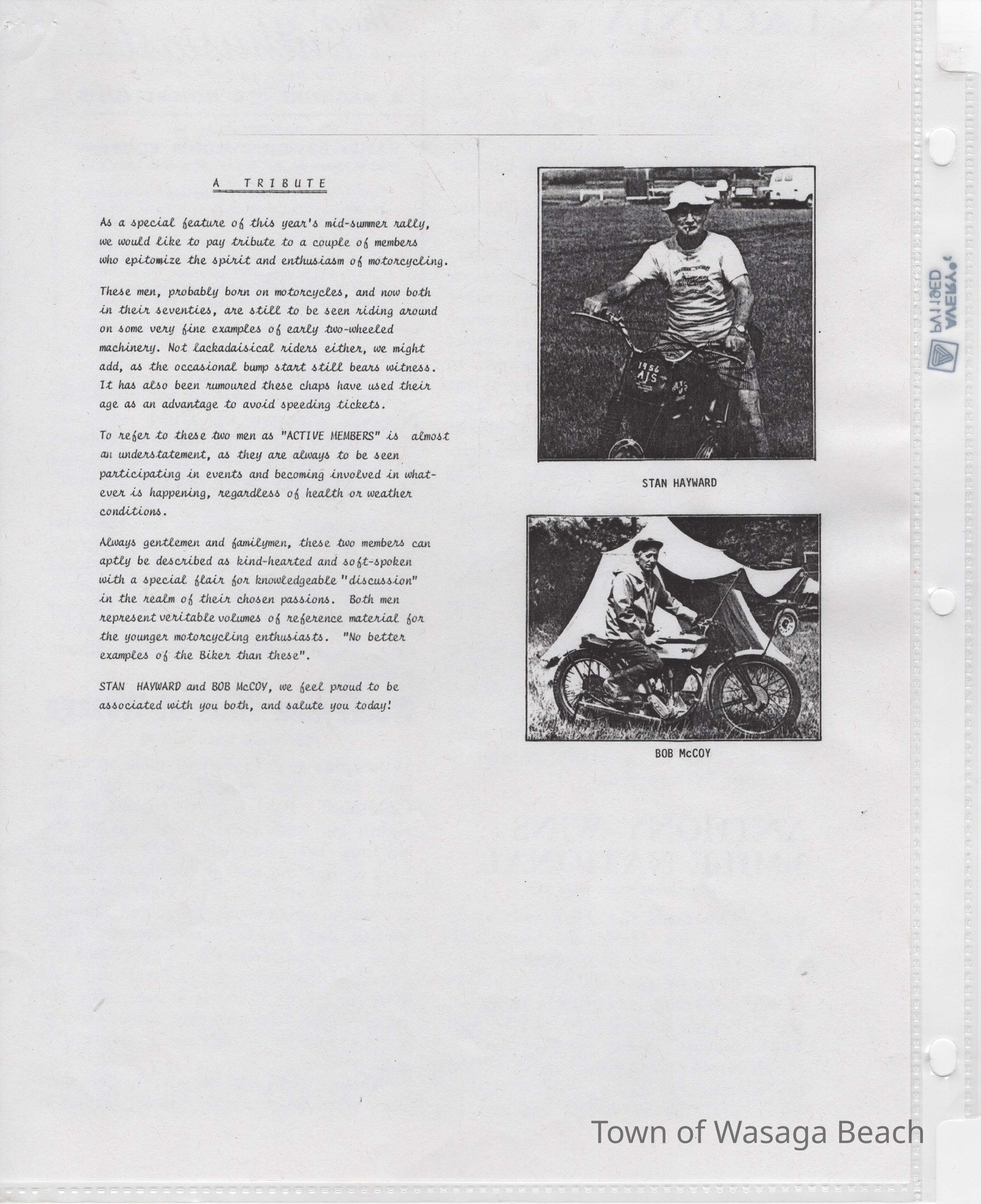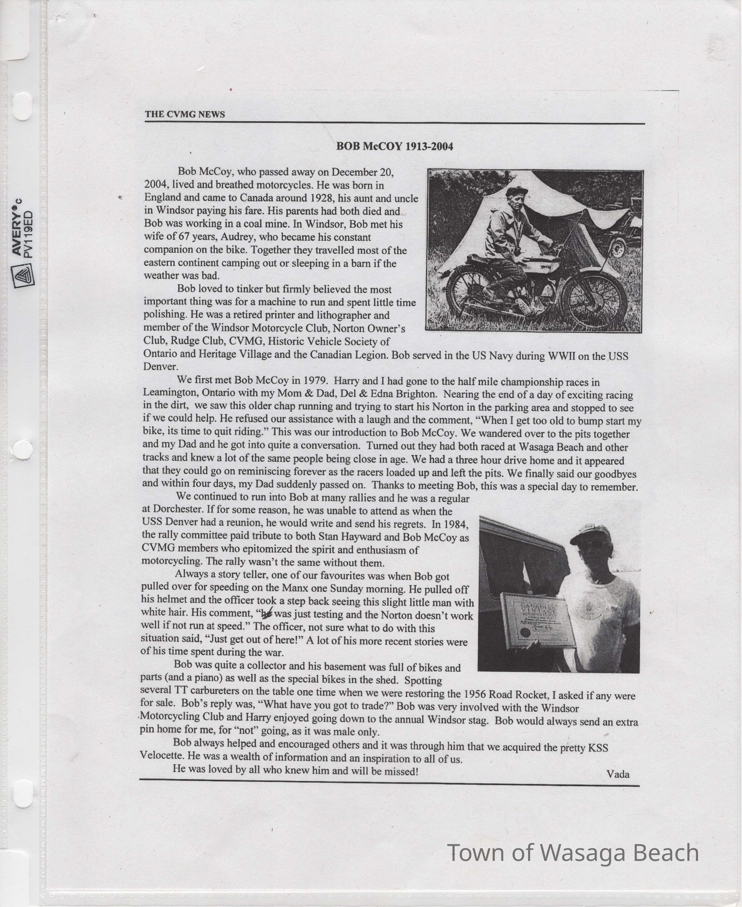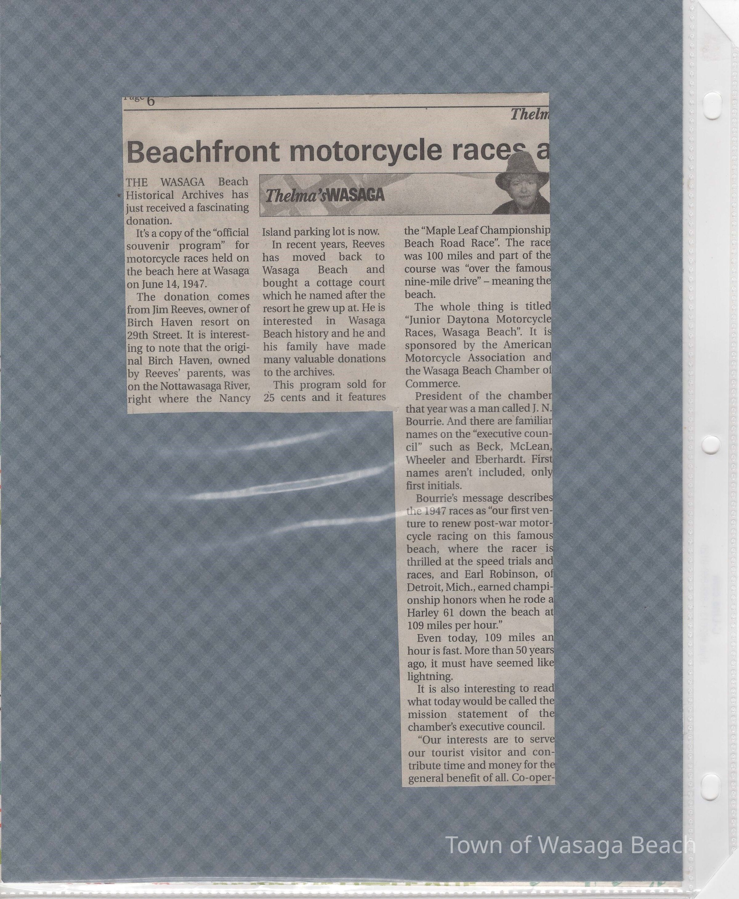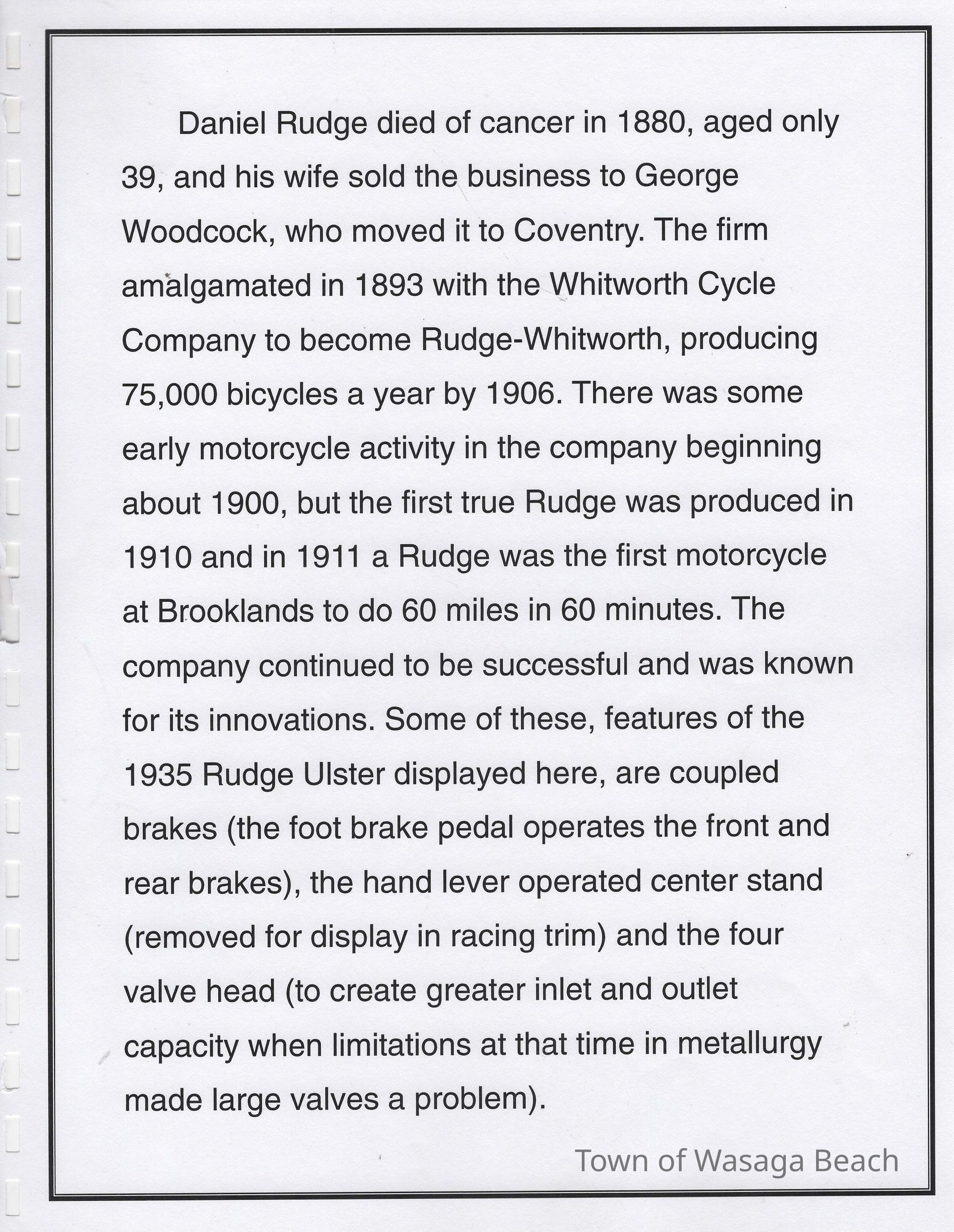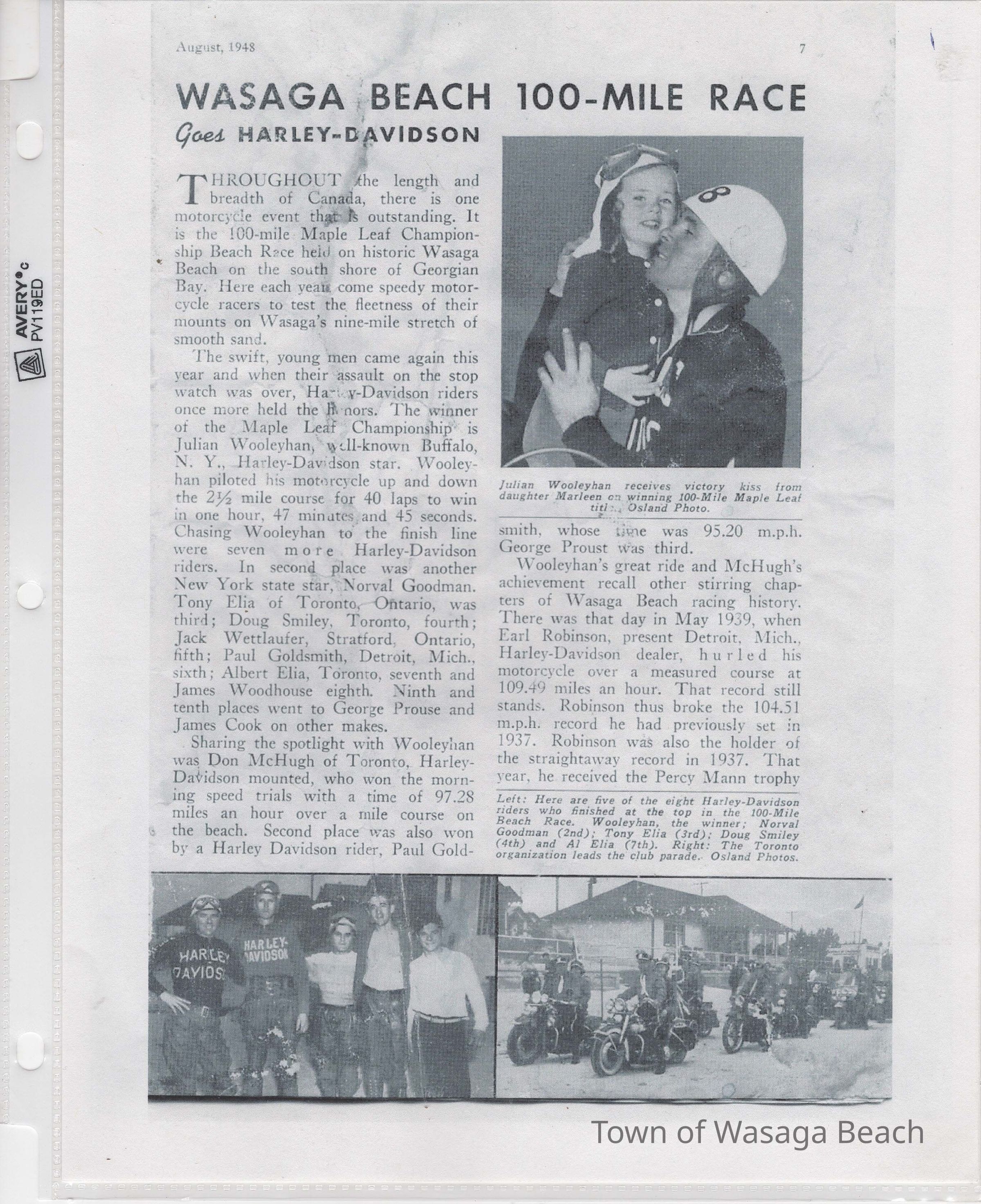 In 2014, the Town of Wasaga Beach purchased a rare vintage 1935 Rudge Ulster motorcycle that was originally owned and raced along the beach by Bob McCoy in 1937, reaching a speed of 89mph. Bob McCoy and the history of the Rudge motorcycle are featured in the album including various newspaper articles and a program from the "100 Mile "MAPLE LEAF CHAMPIONSHIP BEACH-ROAD RACE" held Saturday, June 14, 1947 including a welcome from the Executive of the Chamber of Commerce.