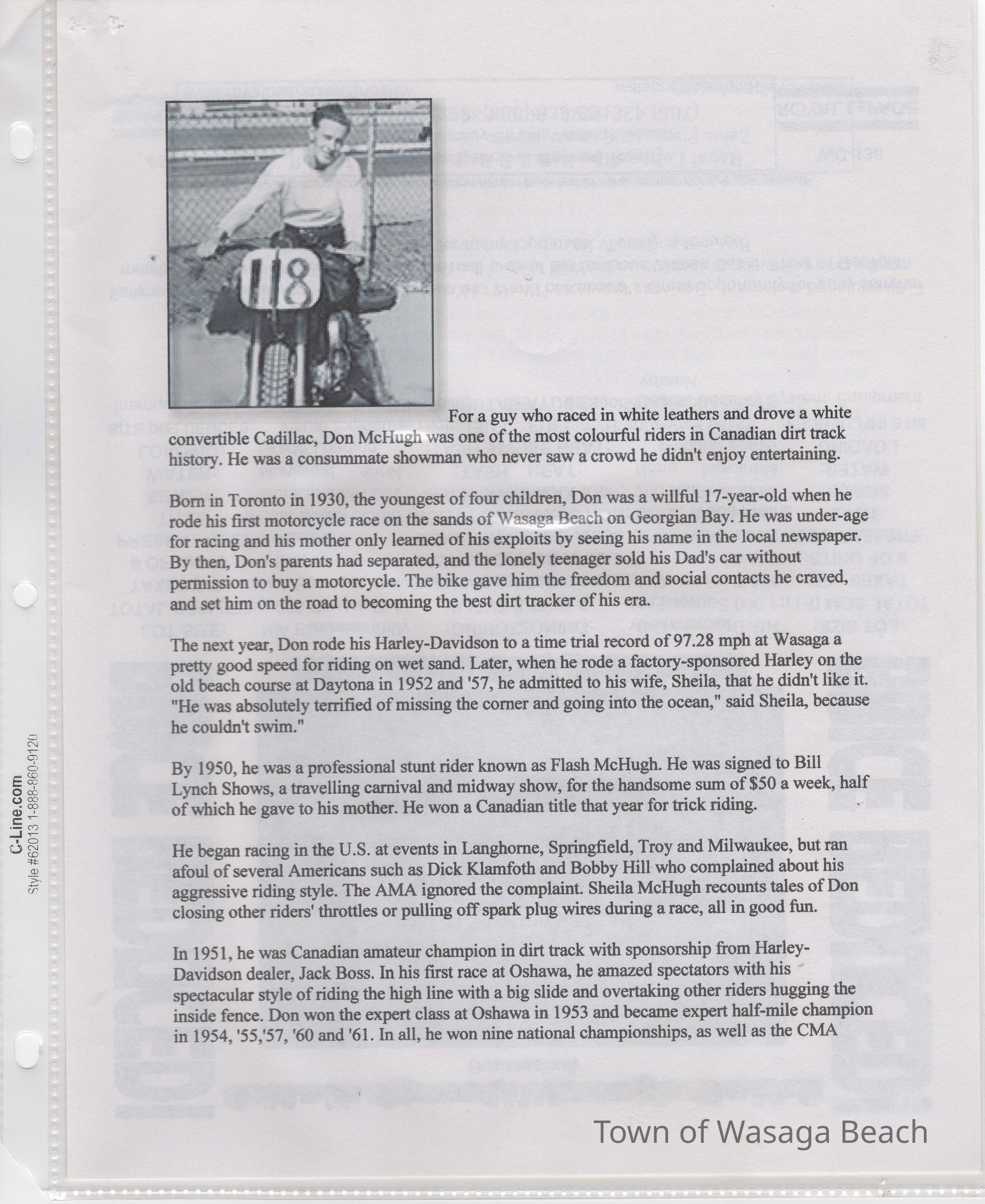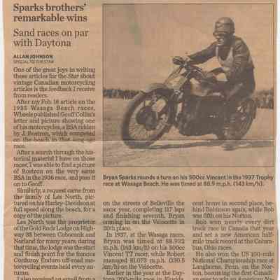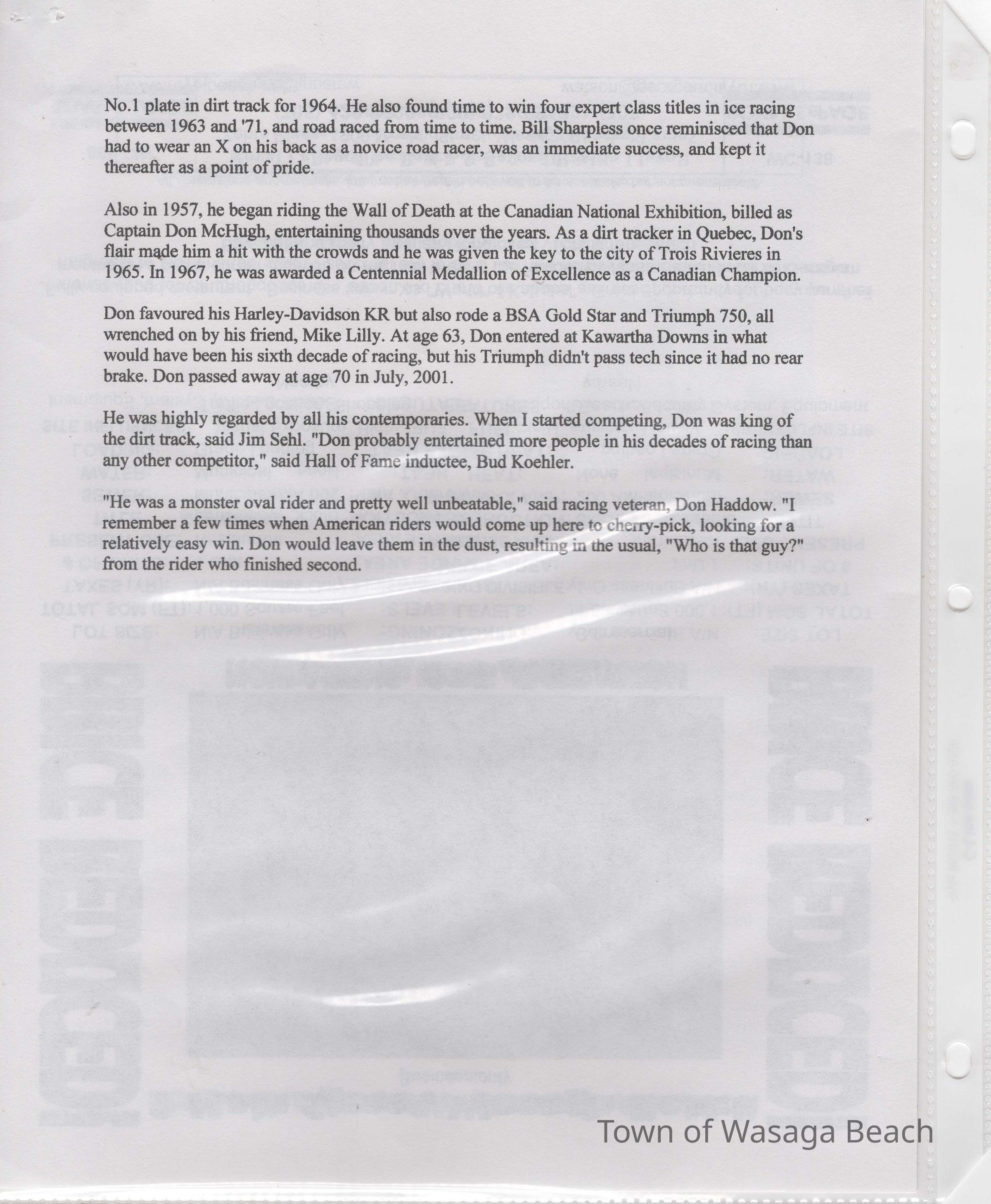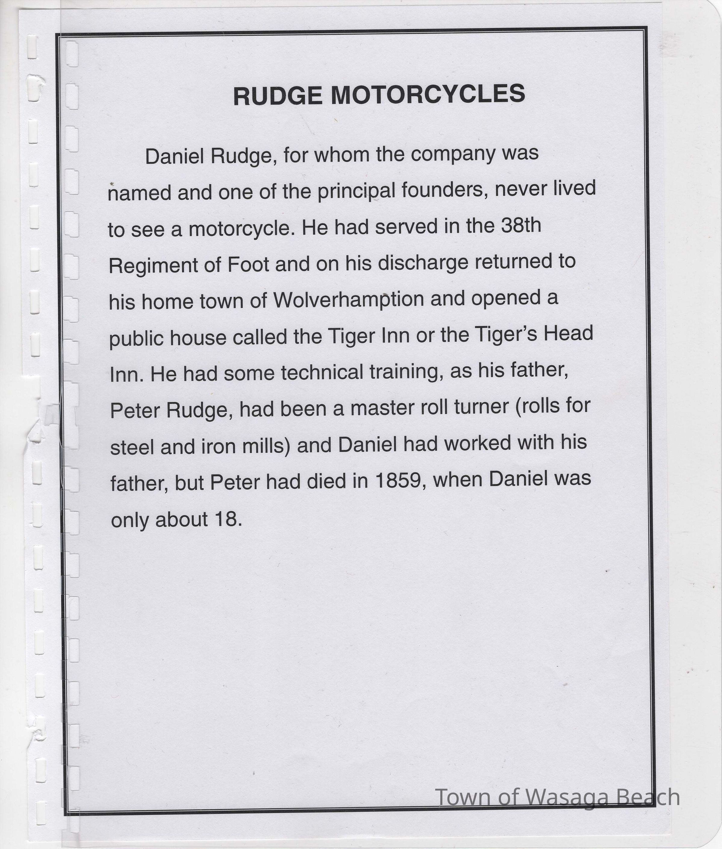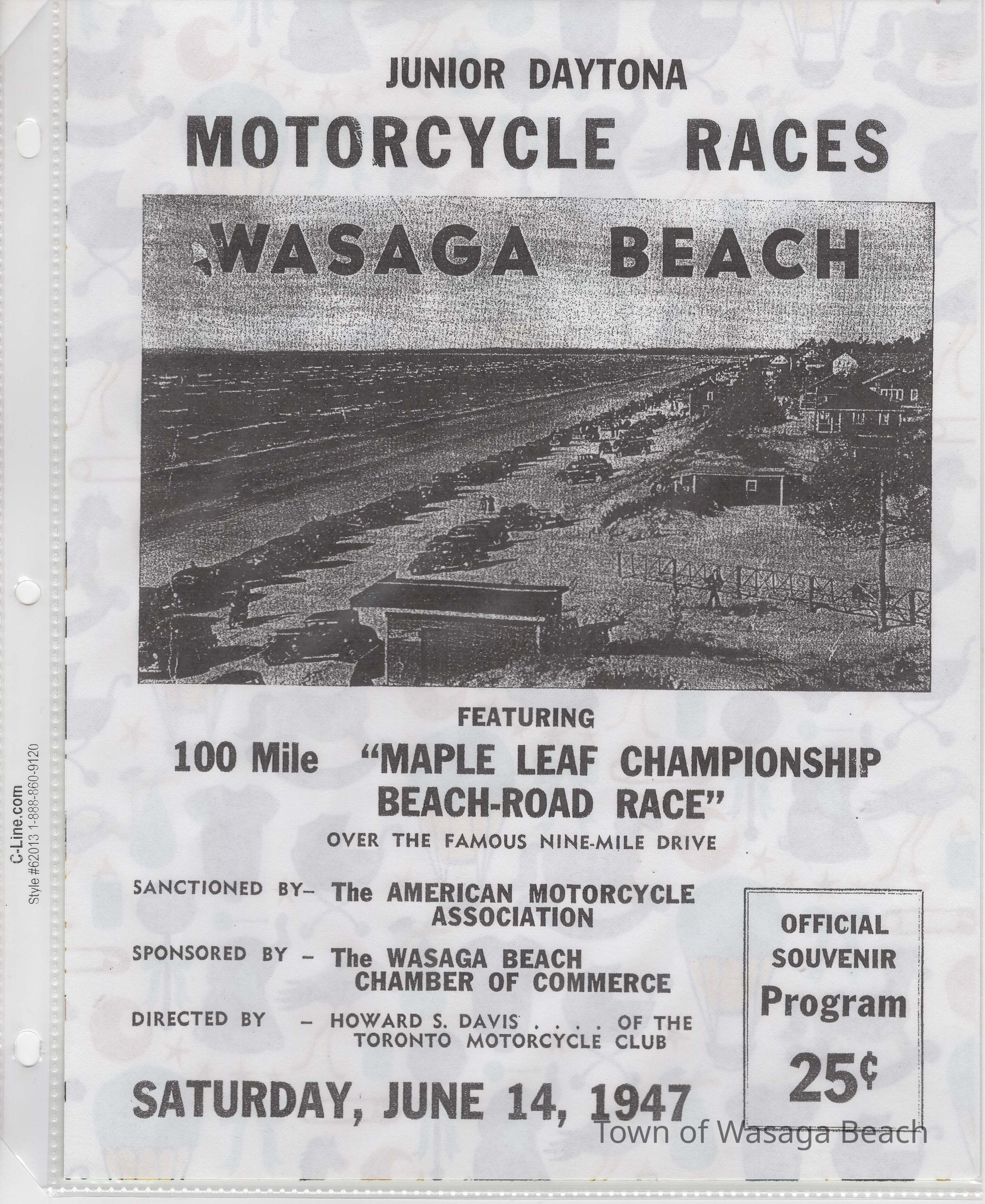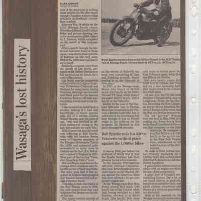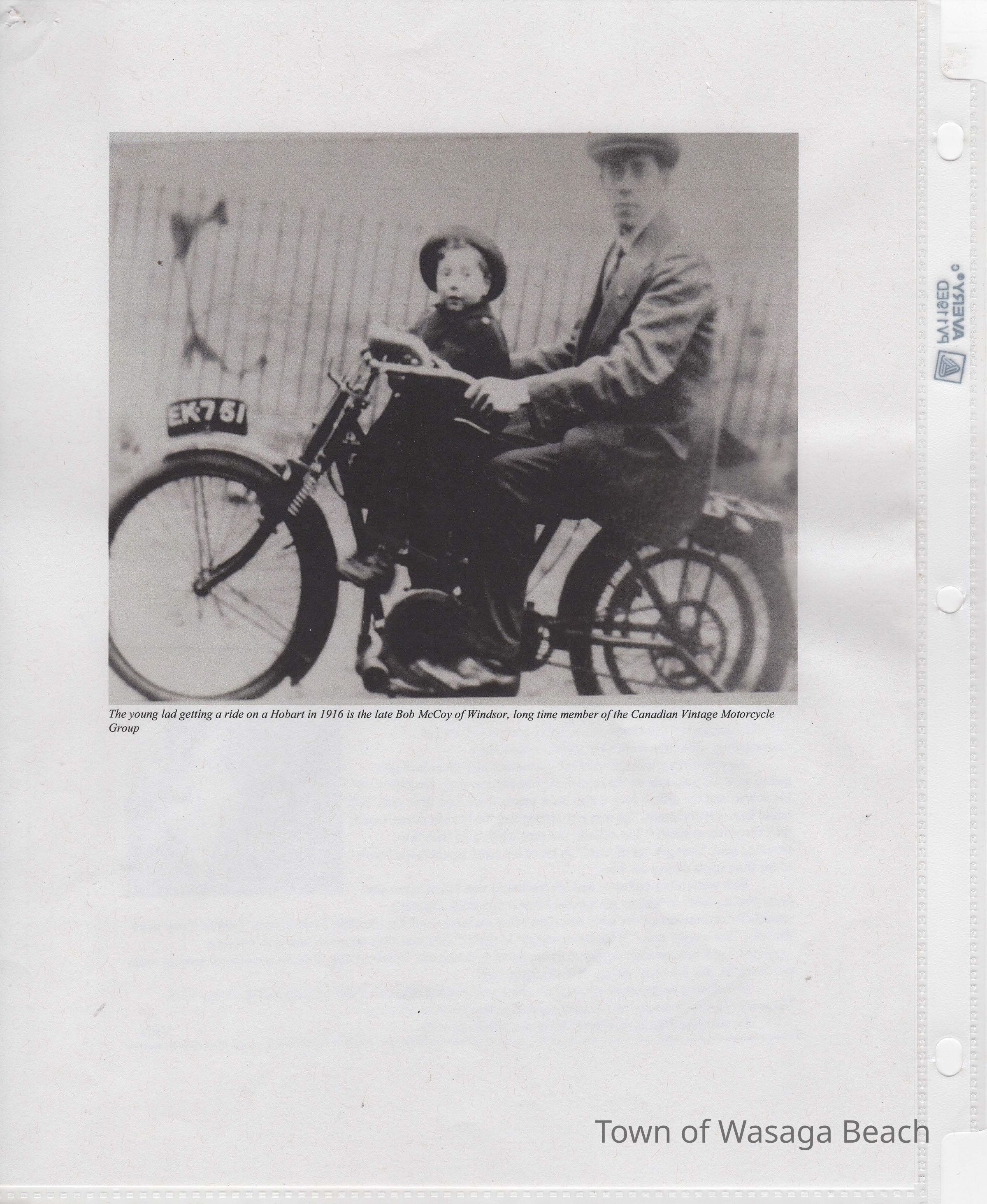 In 2014, the Town of Wasaga Beach purchased a rare vintage 1935 Rudge Ulster motorcycle that was originally owned and raced along the beach by Bob McCoy in 1937, reaching a speed of 89mph. Bob McCoy and the history of the Rudge motorcycle are featured in the album including various newspaper articles and a program from the "100 Mile "MAPLE LEAF CHAMPIONSHIP BEACH-ROAD RACE" held Saturday, June 14, 1947 including a welcome from the Executive of the Chamber of Commerce.