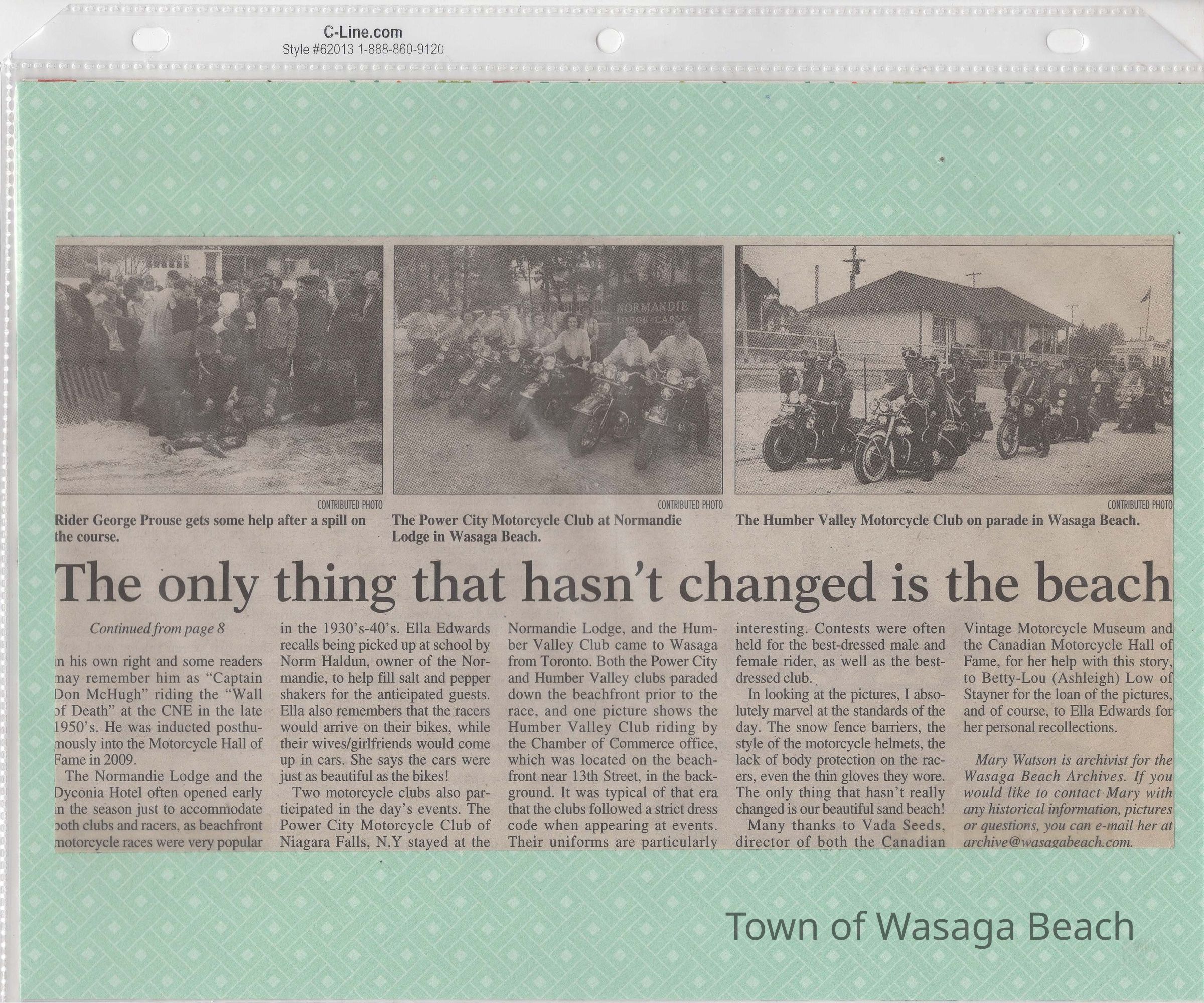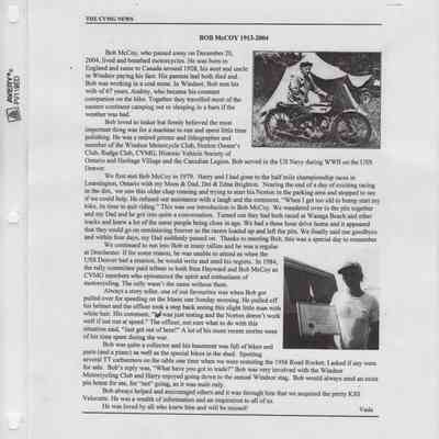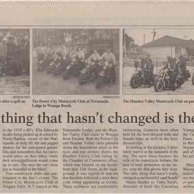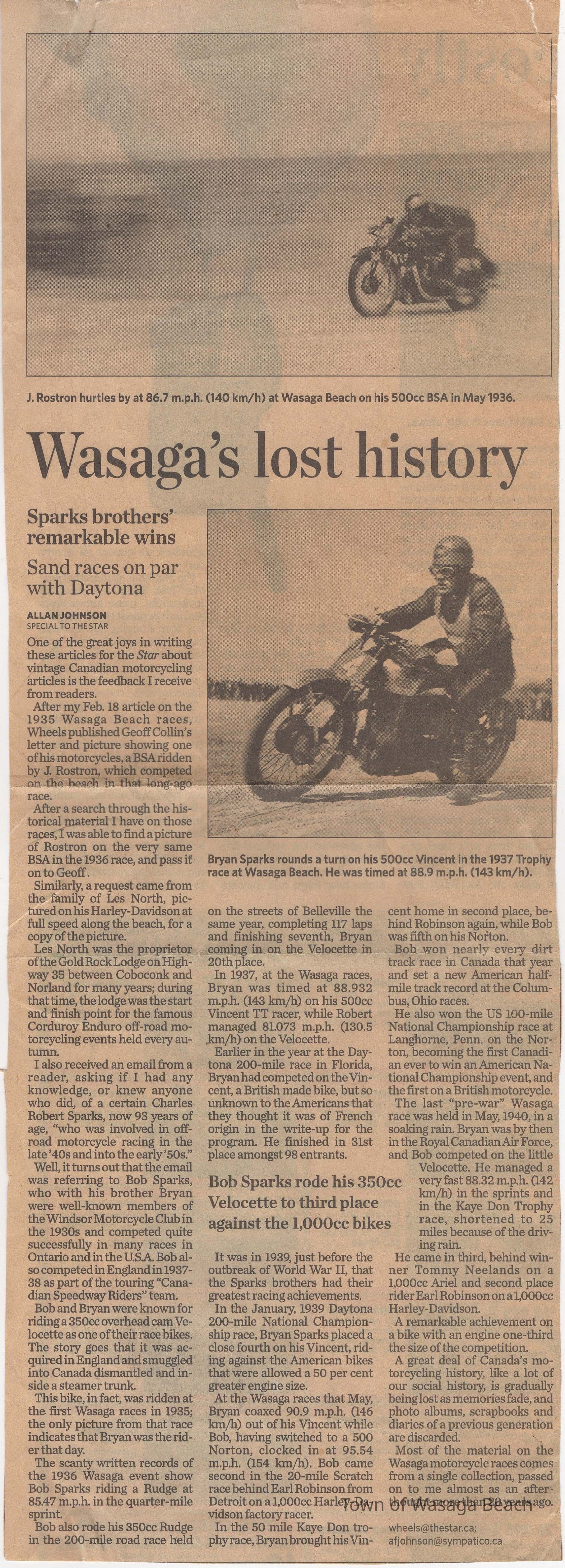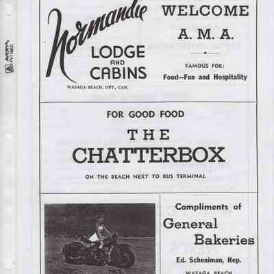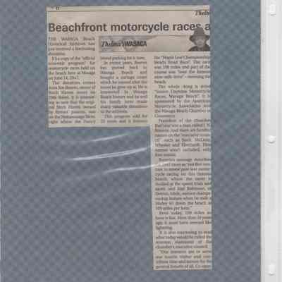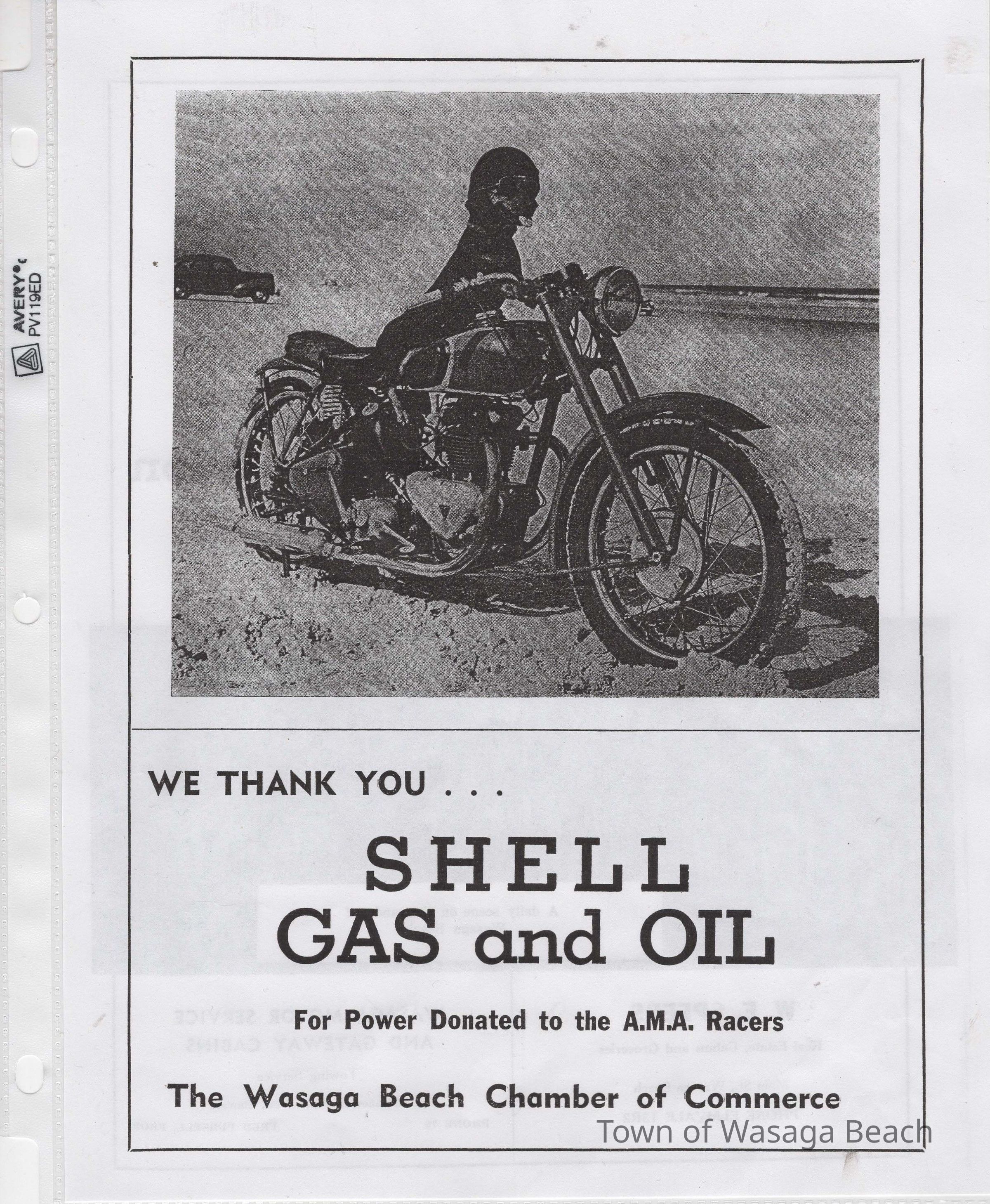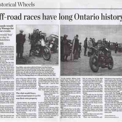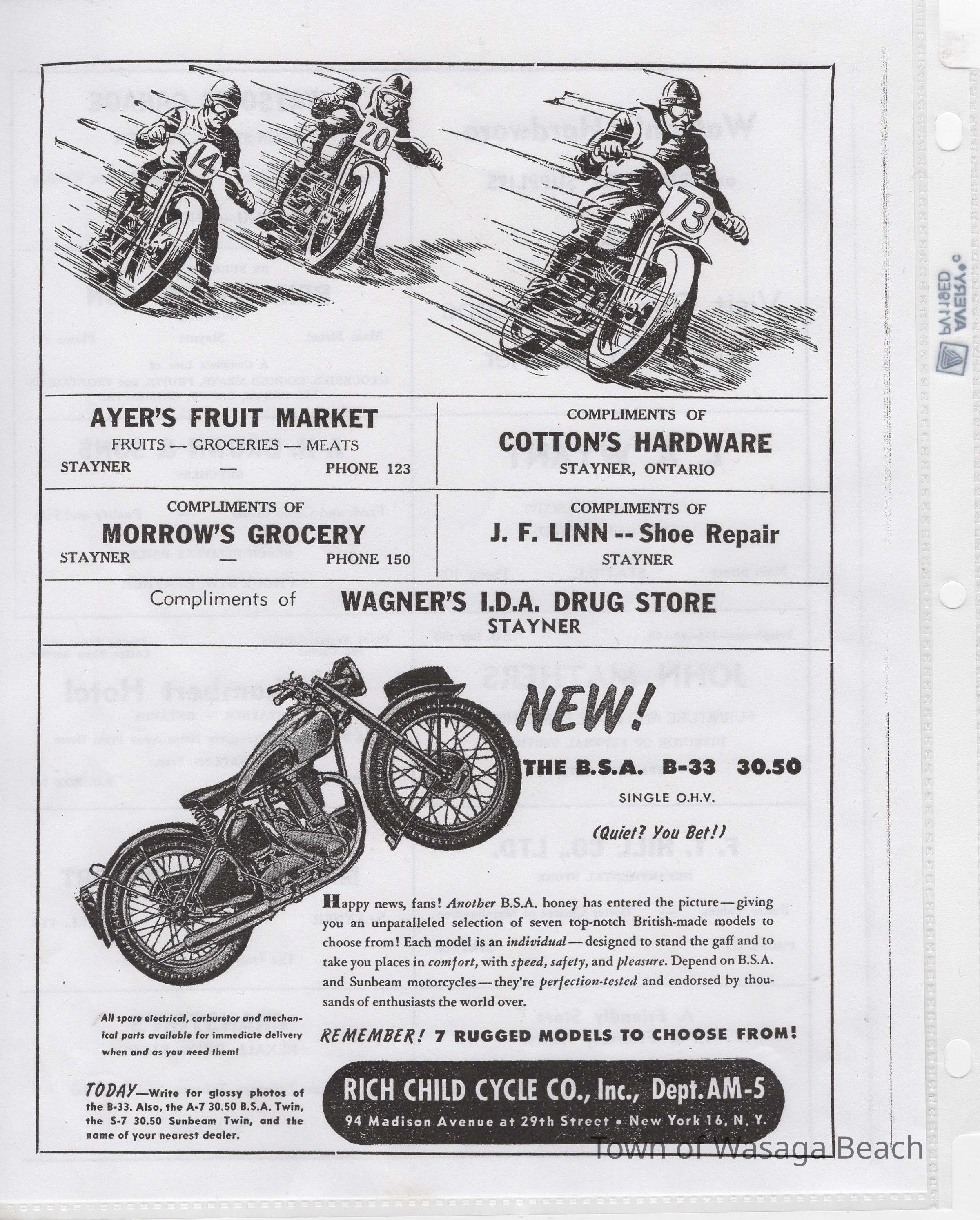 In 2014, the Town of Wasaga Beach purchased a rare vintage 1935 Rudge Ulster motorcycle that was originally owned and raced along the beach by Bob McCoy in 1937, reaching a speed of 89mph. Bob McCoy and the history of the Rudge motorcycle are featured in the album including various newspaper articles and a program from the "100 Mile "MAPLE LEAF CHAMPIONSHIP BEACH-ROAD RACE" held Saturday, June 14, 1947 including a welcome from the Executive of the Chamber of Commerce.