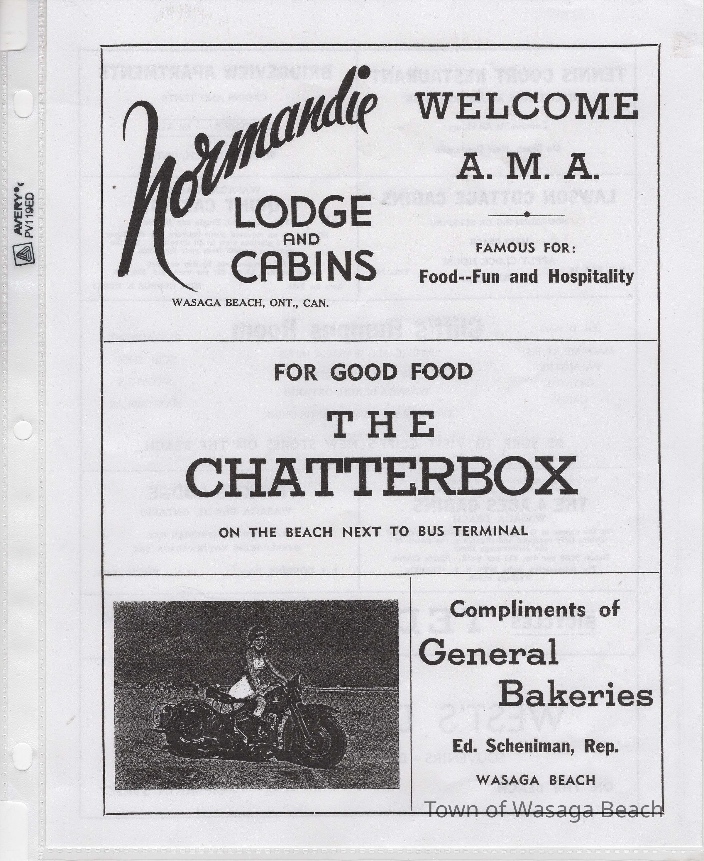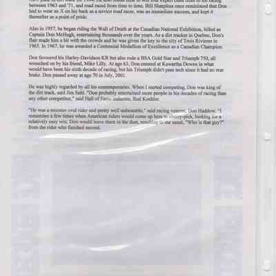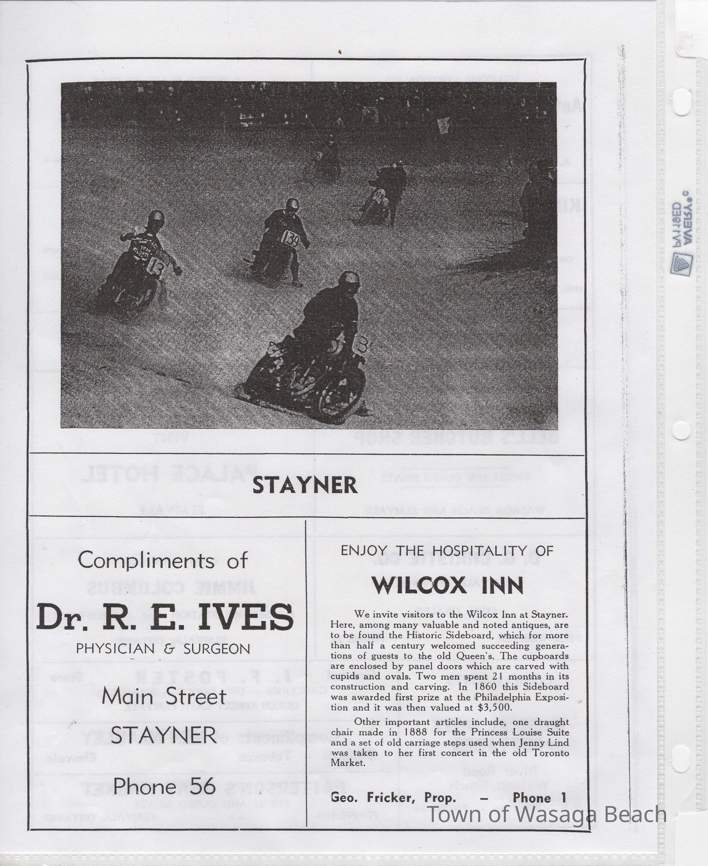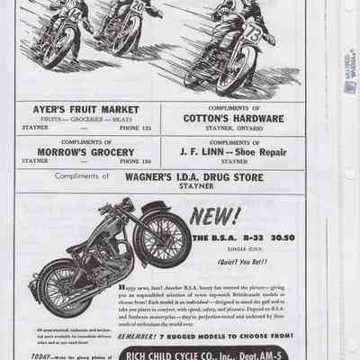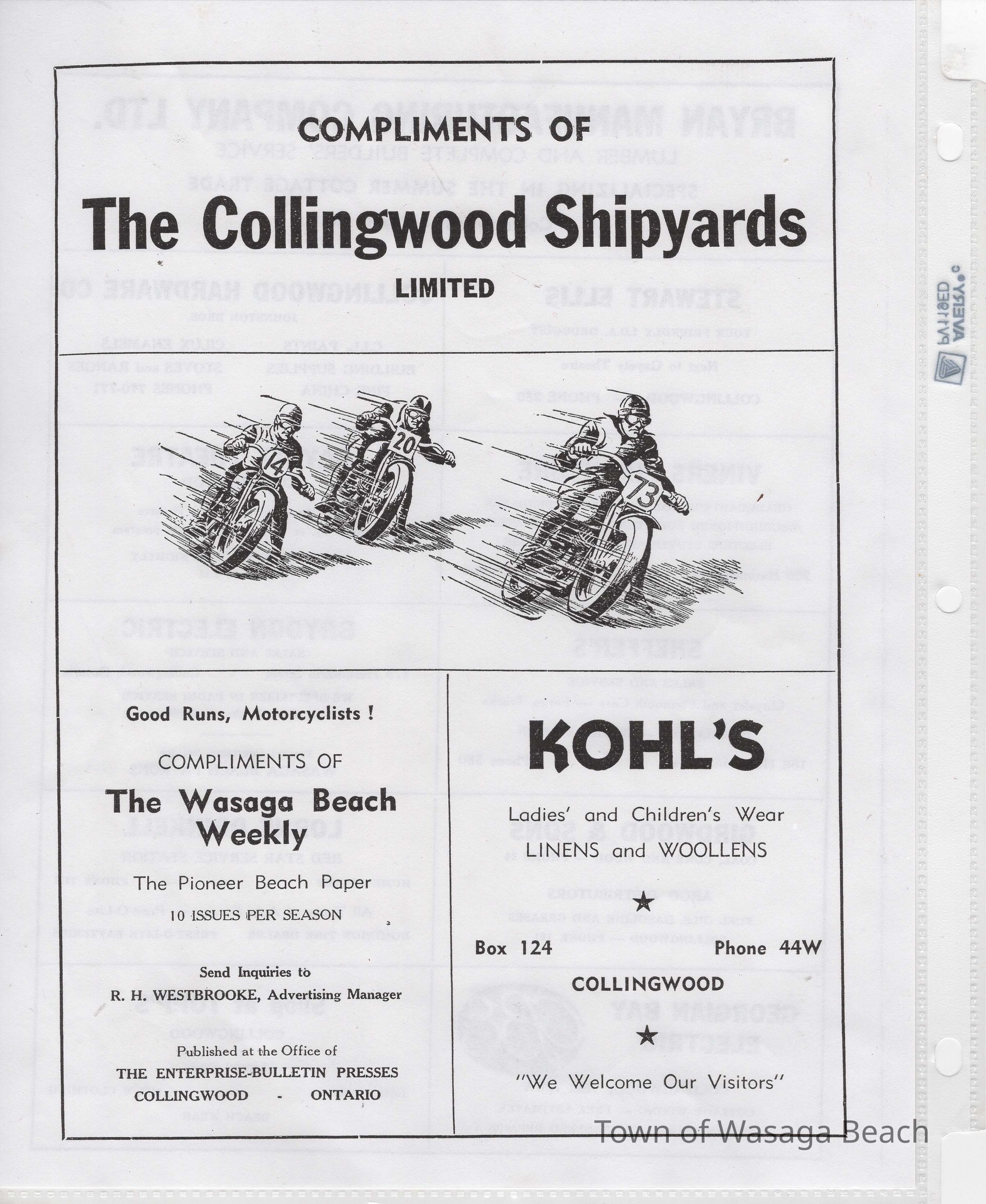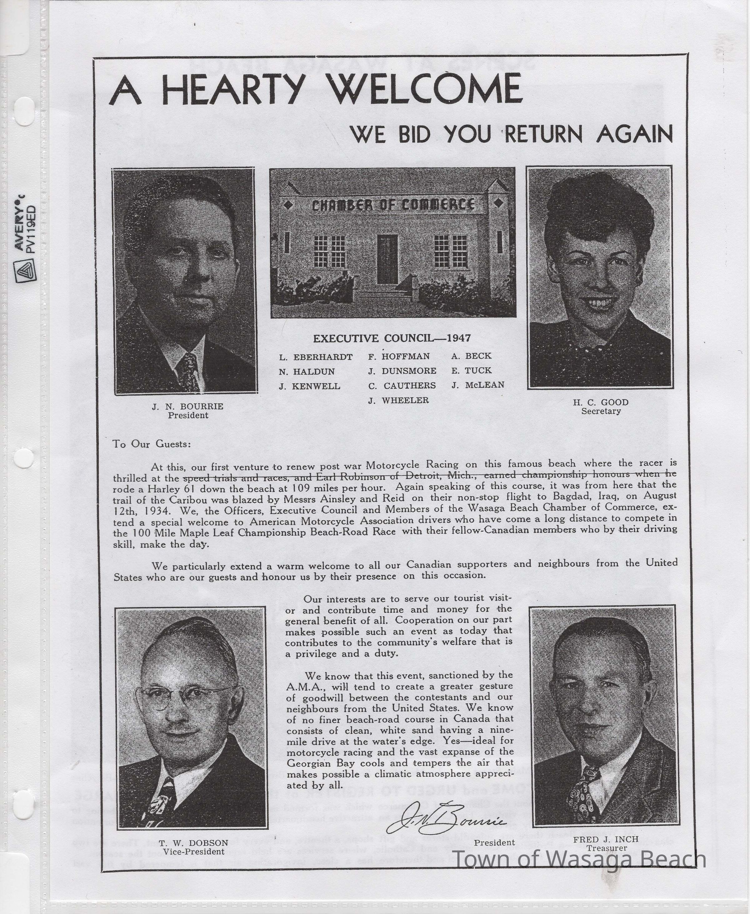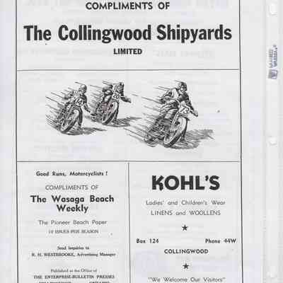 In 2014, the Town of Wasaga Beach purchased a rare vintage 1935 Rudge Ulster motorcycle that was originally owned and raced along the beach by Bob McCoy in 1937, reaching a speed of 89mph. Bob McCoy and the history of the Rudge motorcycle are featured in the album including various newspaper articles and a program from the "100 Mile "MAPLE LEAF CHAMPIONSHIP BEACH-ROAD RACE" held Saturday, June 14, 1947 including a welcome from the Executive of the Chamber of Commerce.