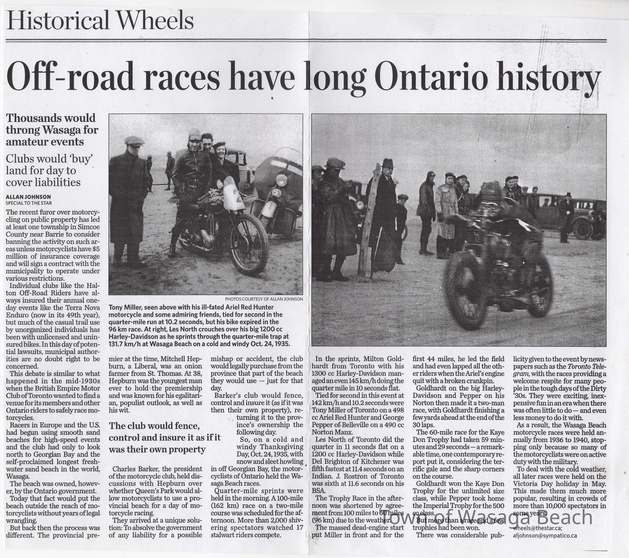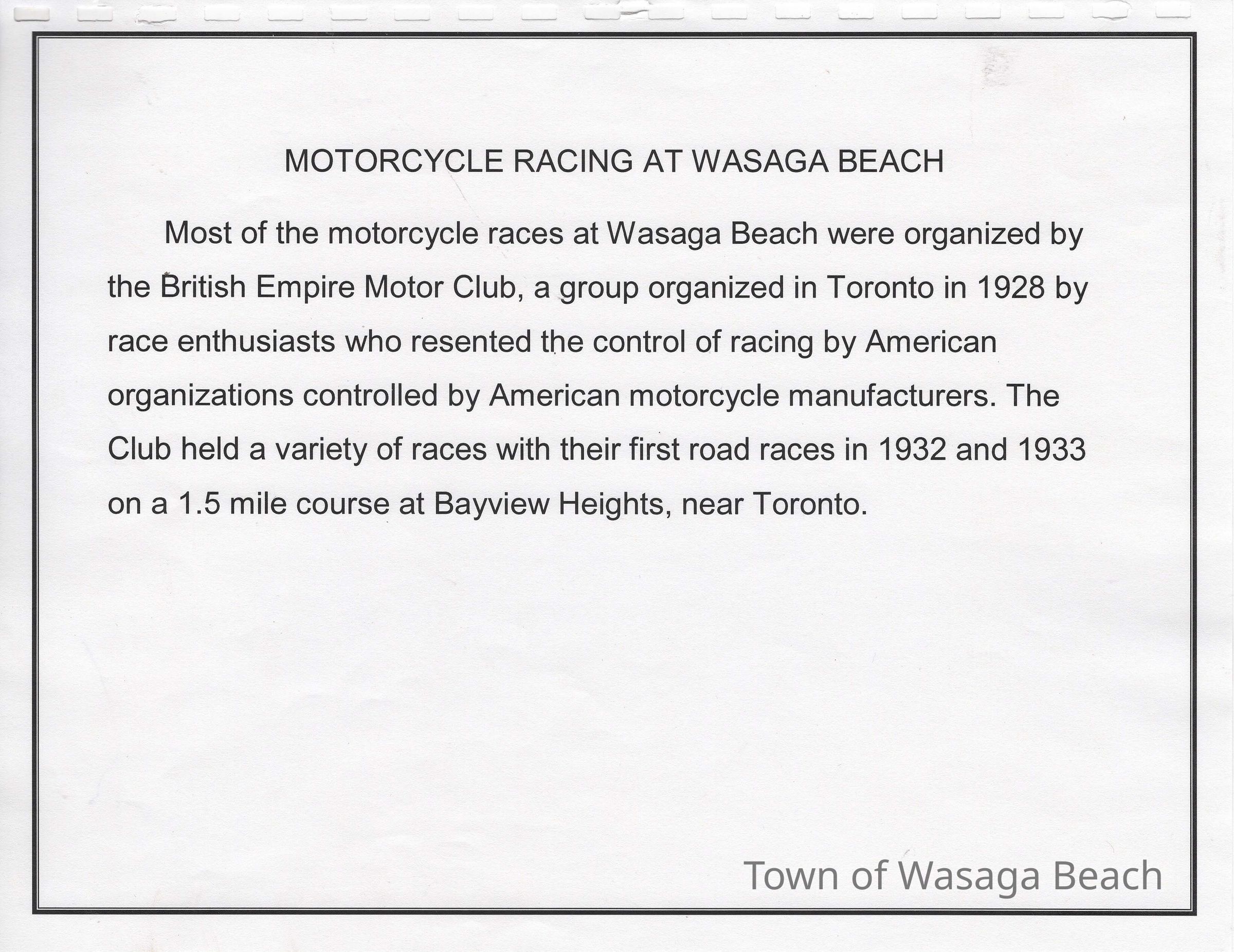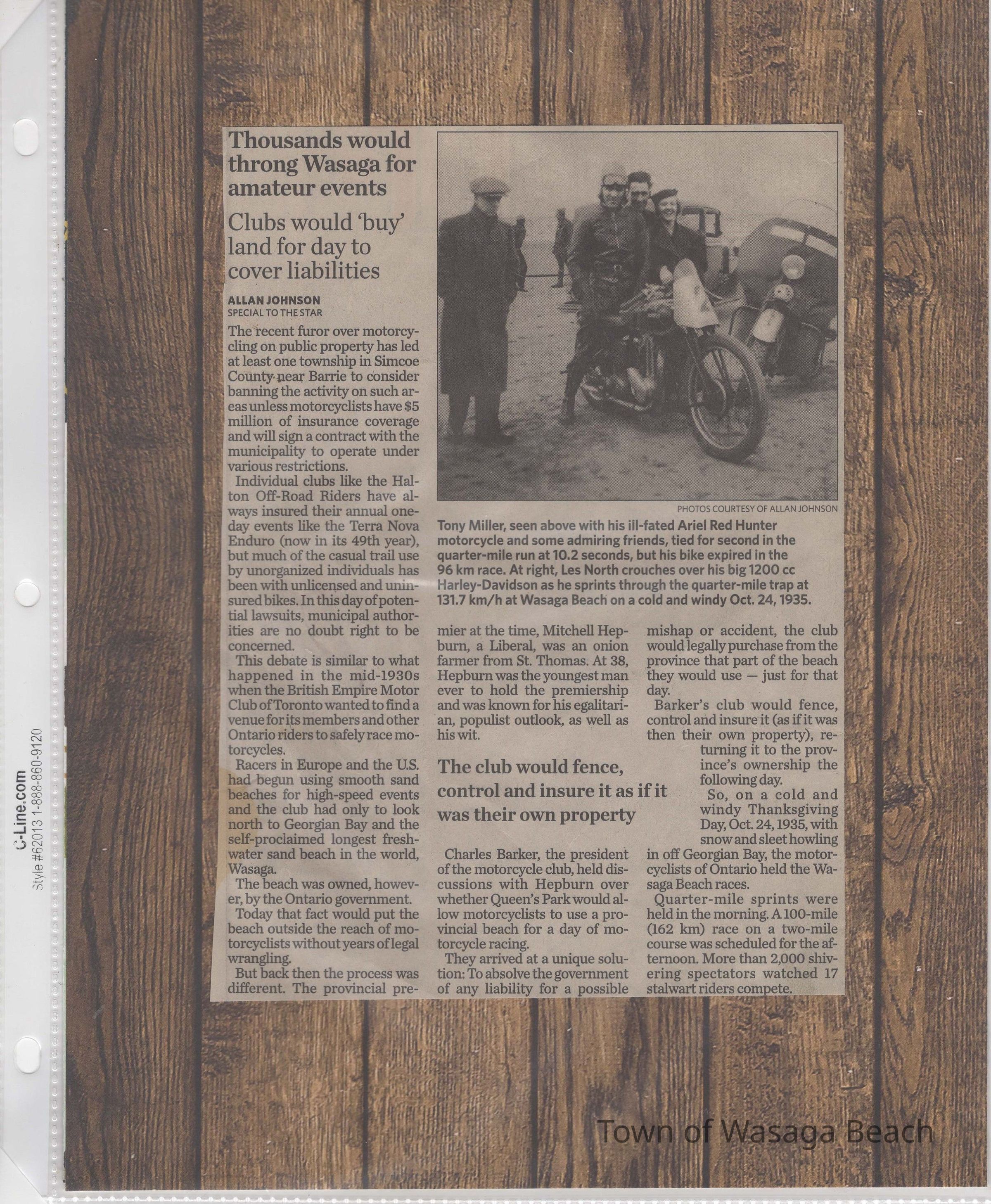 During the 1930’s the beachfront was used for motorcycle races. Racers in Europe & US had been using sand beaches for motorcycle races and the British Empire Motorcycle Club found Wasaga Beach to be a perfect Canadian destination for races. The first race was held on the beachfront on October 24, 1935 starting with ¼ mile sprints. A planned 100 mile race was shortened to 60 miles due to inclement weather. 2000 spectators were in attendance. The next year, to avoid adverse weather conditions, the races were moved from Thanksgiving to Victoria Day weekend. Spectators in attendance increased to 10,000 by 1937. The courses ran from the east end of Beach Area 1 west to about 13th street. Bales of hay and snow fence were used to protect the crowds. The Wasaga Beach races were the biggest events in Canada at the time and drew top American riders. The races continued to run on the beach, with some gaps due to participants’ involvement in WWII, until 1949 when new safety regulations coupled with the cost of liability insurance brought an end to motorcycle racing on the beach. Motorcycle races were then held where Edenvale Airport is now located.Acquisition