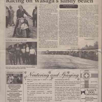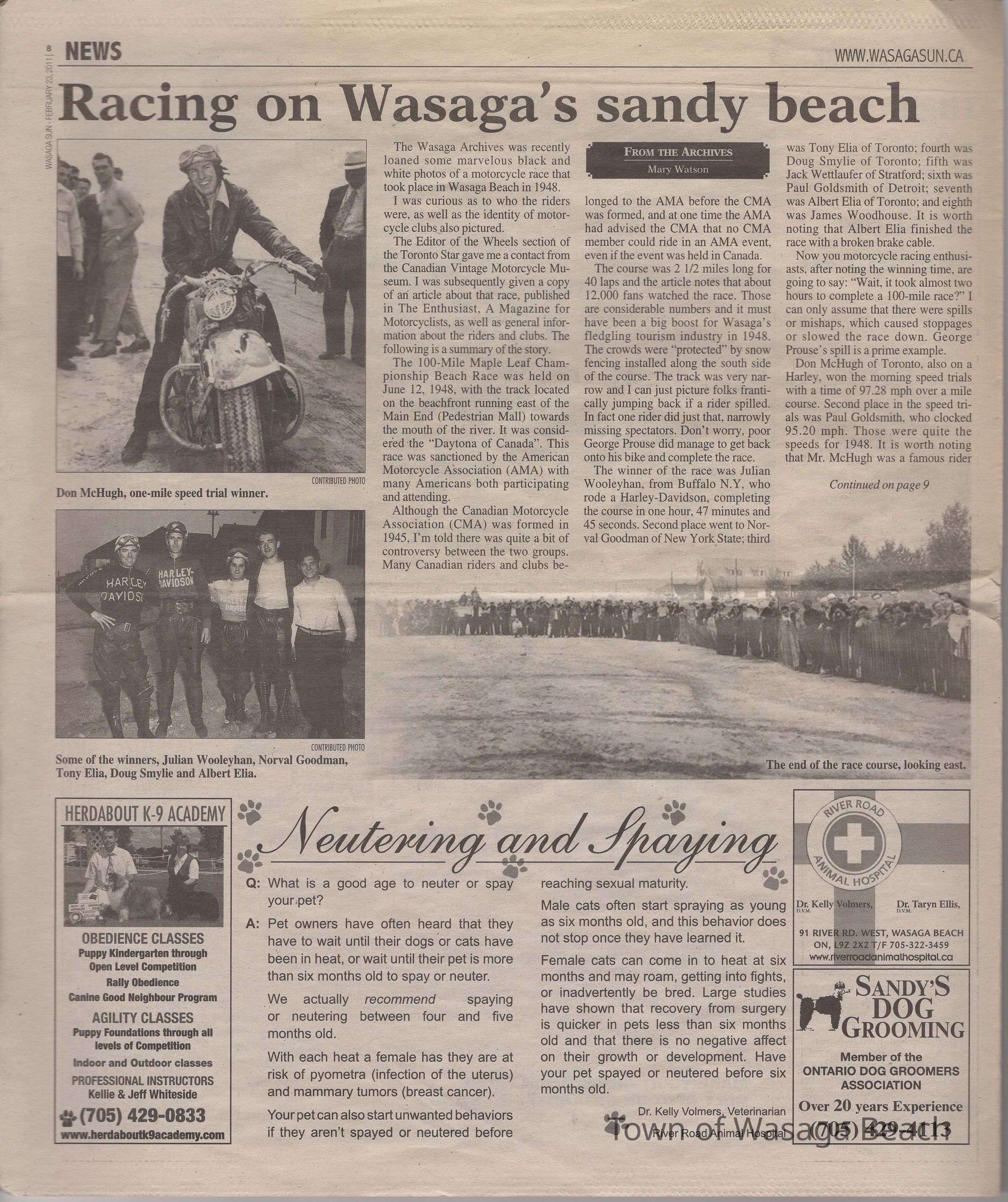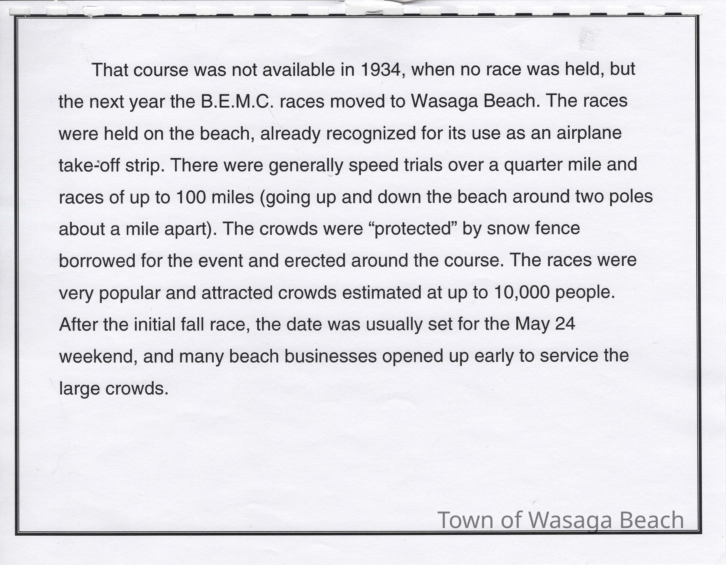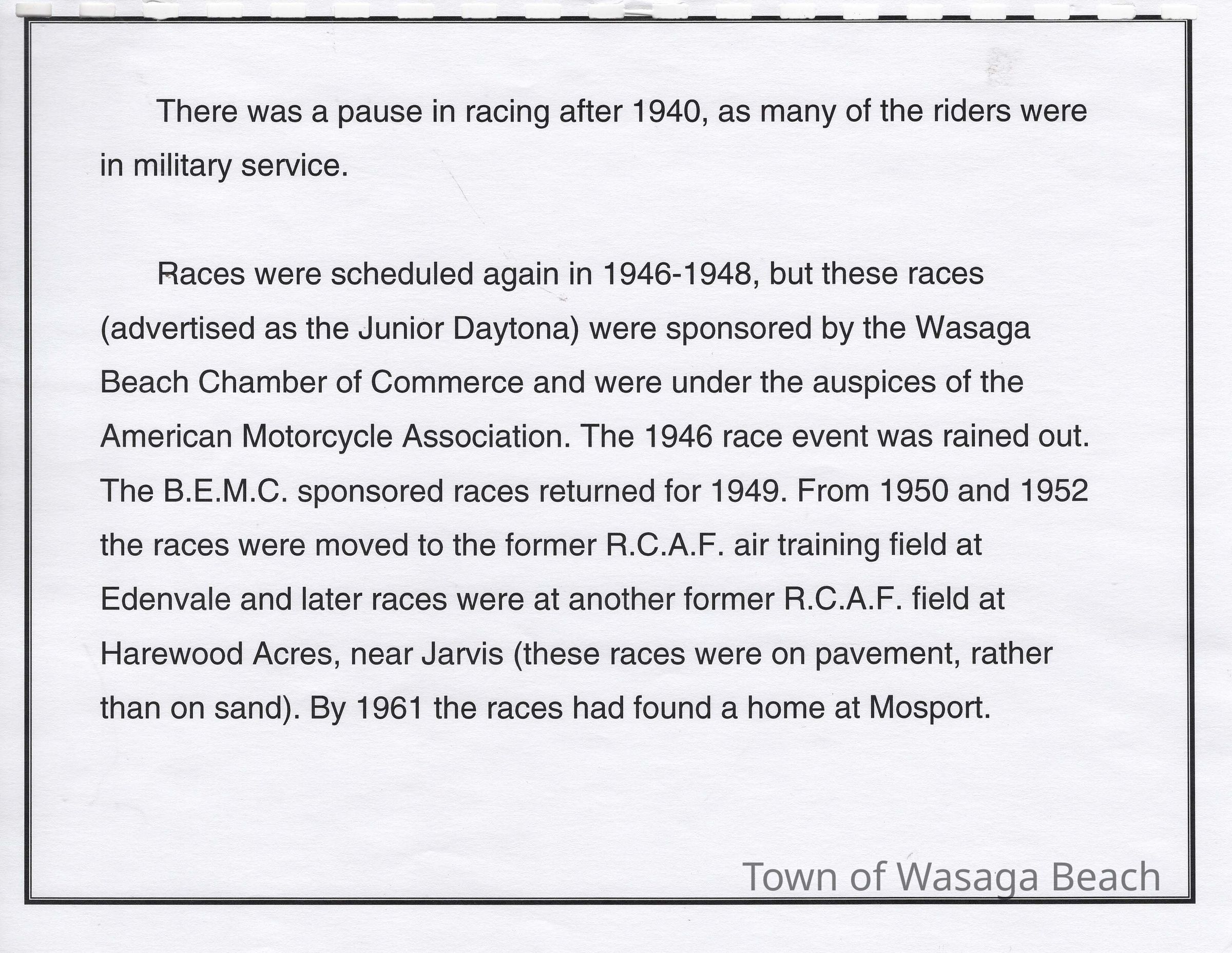 During the 1930’s the beachfront was used for motorcycle races. Racers in Europe & US had been using sand beaches for motorcycle races and the British Empire Motorcycle Club found Wasaga Beach to be a perfect Canadian destination for races. The first race was held on the beachfront on October 24, 1935 starting with ¼ mile sprints. A planned 100 mile race was shortened to 60 miles due to inclement weather. 2000 spectators were in attendance. The next year, to avoid adverse weather conditions, the races were moved from Thanksgiving to Victoria Day weekend. Spectators in attendance increased to 10,000 by 1937. The courses ran from the east end of Beach Area 1 west to about 13th street. Bales of hay and snow fence were used to protect the crowds. The Wasaga Beach races were the biggest events in Canada at the time and drew top American riders. The races continued to run on the beach, with some gaps due to participants’ involvement in WWII, until 1949 when new safety regulations coupled with the cost of liability insurance brought an end to motorcycle racing on the beach. Motorcycle races were then held where Edenvale Airport is now located.Acquisition