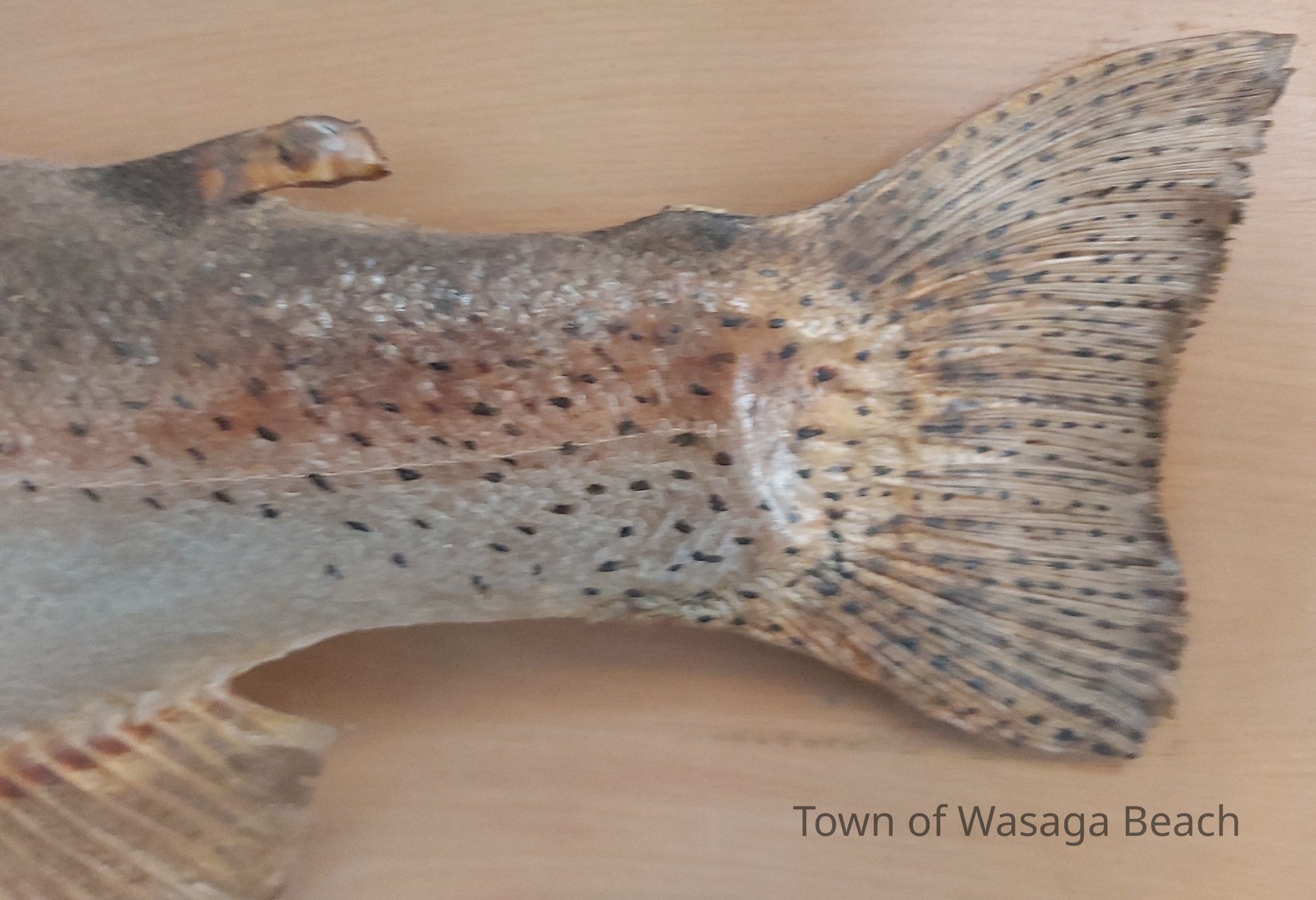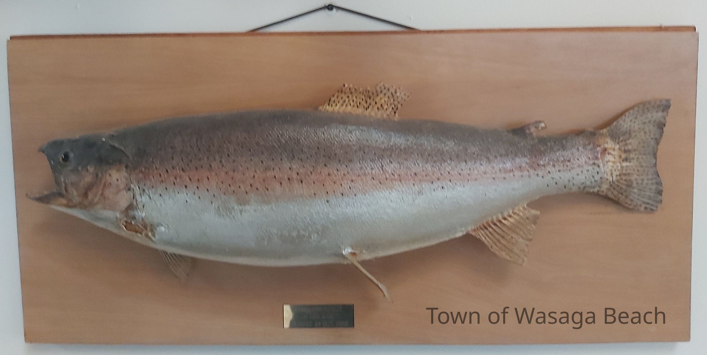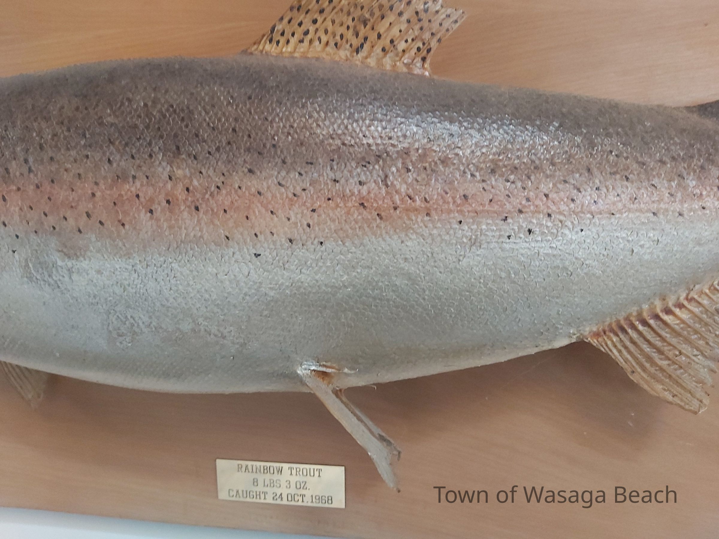Mounted 8 lb 3oz Rainbow Trout caught in the Nottawasaga River, October 24, 1968 by Kazo Ken Kitagawa - Grandpa of Lesley & Linda submitted by Victor Kitagawa March 31, 2006 (note on back of fish)Acquisition