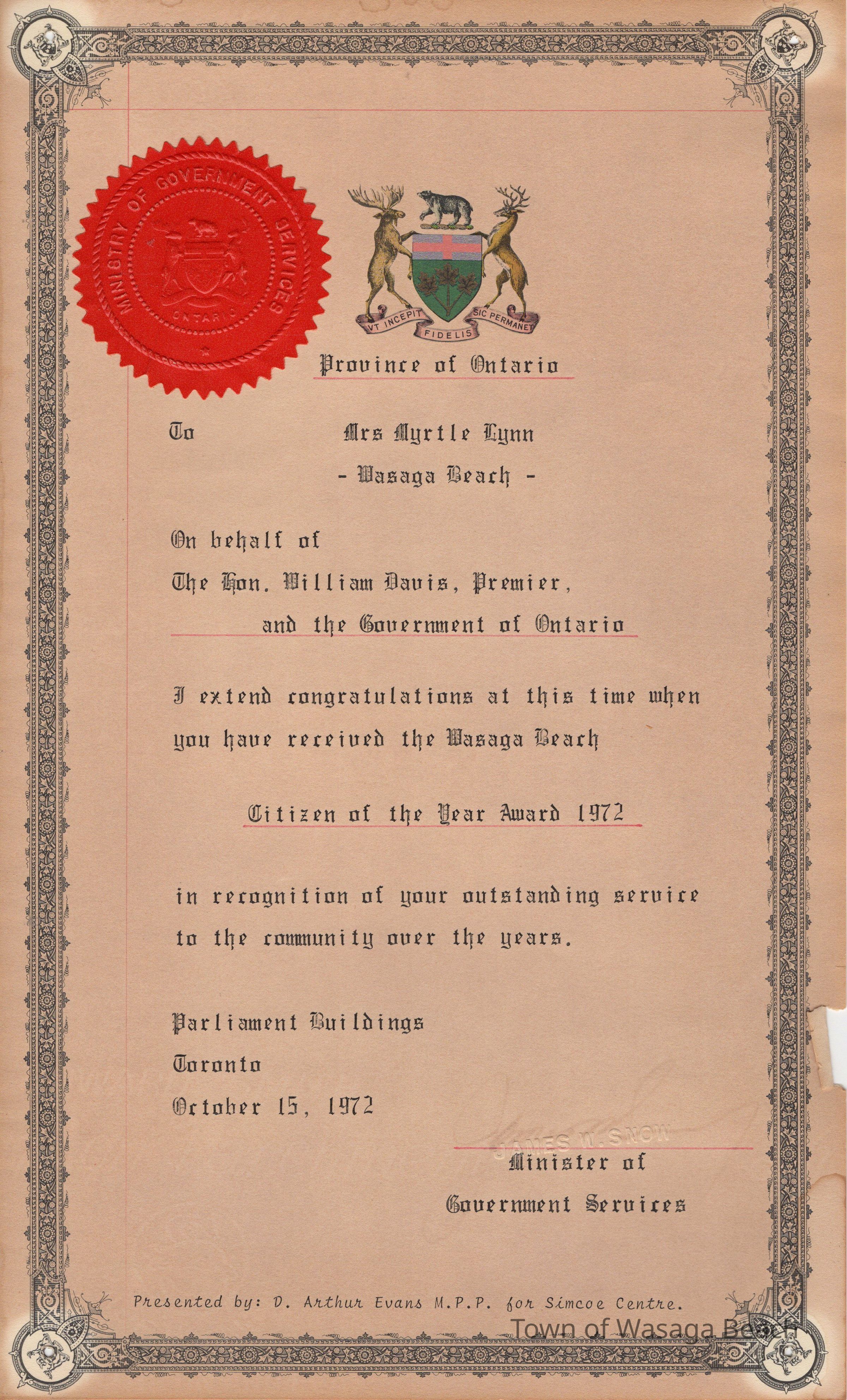 Myrtle Lynn Citizen of the Year Award 1972Entry/Object ID