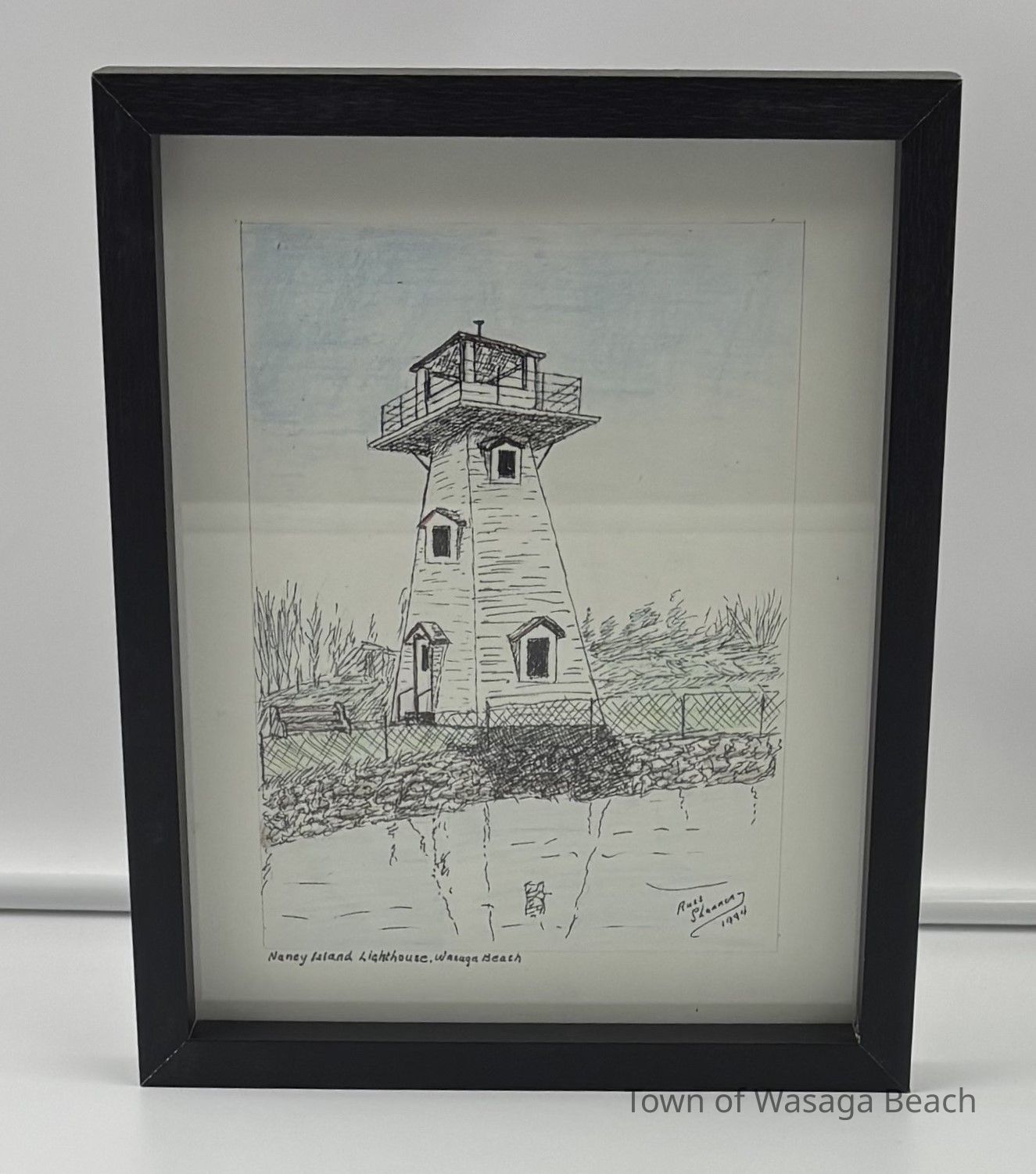 A framed pen and ink drawing of Nancy Island Lighthouse signed by artist Russ Shannon, 1994.Acquisition